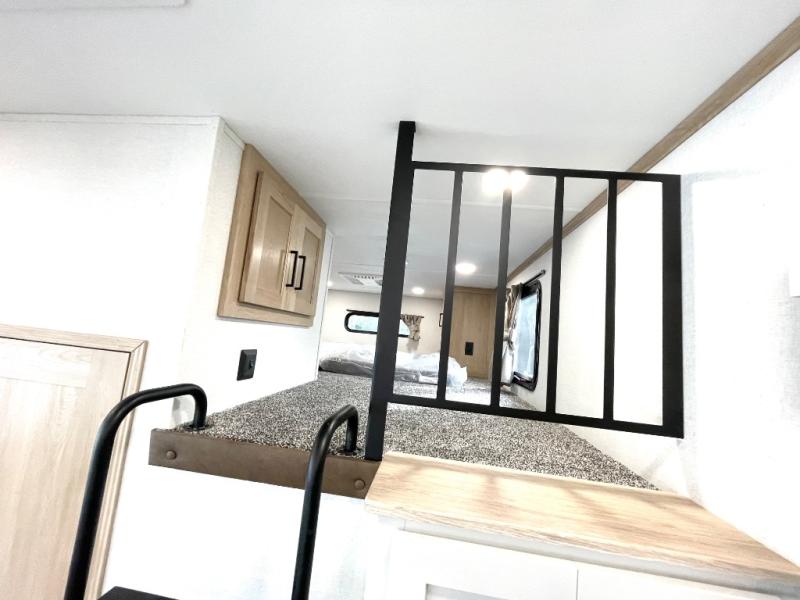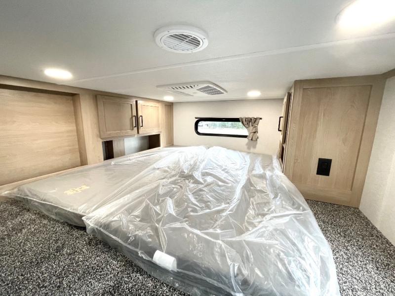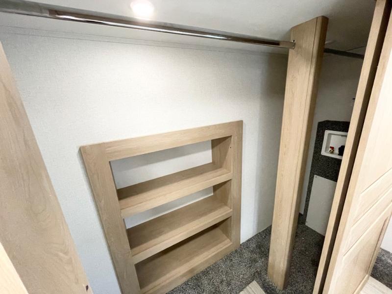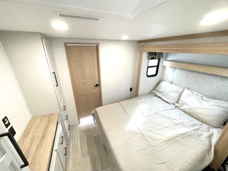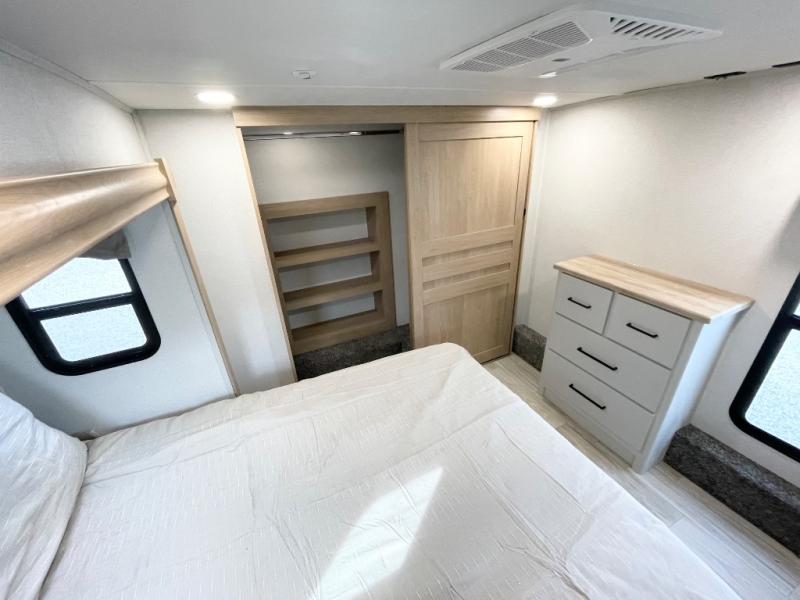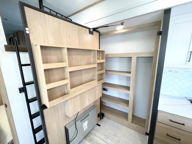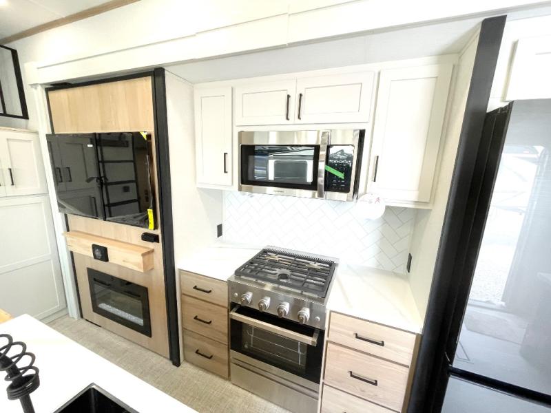 Enjoy a home on wheels with this fifth wheel! There are two bedrooms to choose from plus an upper loft with two 32" x 74" bunk mats, cabinets, and TV prep. The front private bedroom has a queen bed slide across from a dresser and next to a front wardrobe that is prepped to add an optional washer and dryer. The second bedroom has a queen bed slide across from a dresser with wardrobes on either side, plus it's very own full rear bathroom which has a tub and a rear entry/exit door to the unit. The second full bathroom has a one-piece fiberglass shower so everyone can get ready quickly in the morning. Prepare your best home cooked meals with the kitchen island and three burner cooktop then enjoy it at the free-standing dinette. Relax in true comfort each night in the theater seating across from the fireplace and 50" TV at the entertainment center!