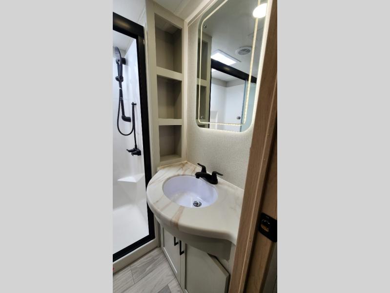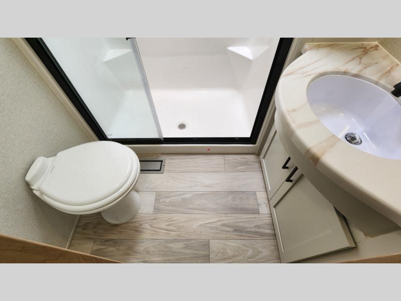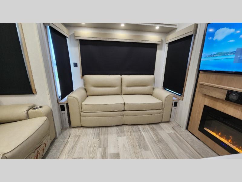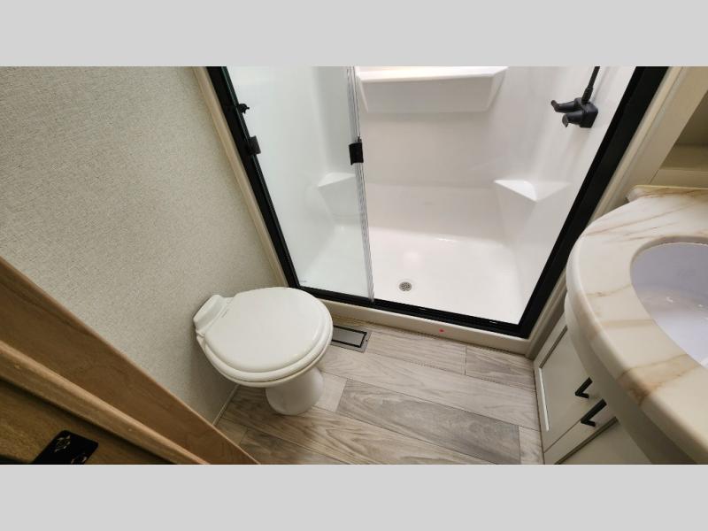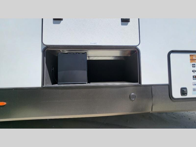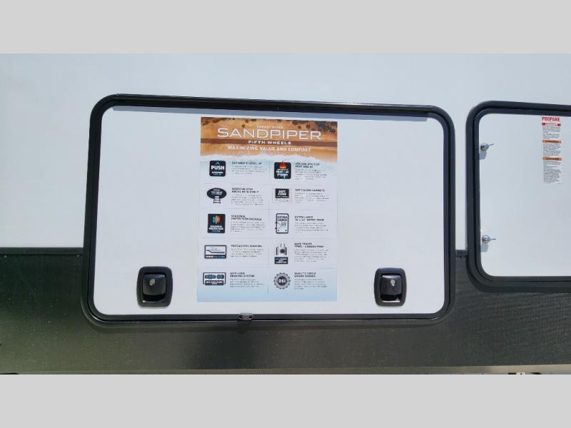 You will find the perfect balance of size, space, features, and luxury with any one of these Forest River Sandpiper fifth wheels! They are constructed with a welded aluminum framed vacuum bonded laminated superstructure, a cambered powder coated frame with rust prohibitor, and a fully enclosed underbelly for added protection against the elements. The large tinted windows come with a 80/20 UV prohibitor or you can choose the optional dual pane windows. Some hassle-free amenities include a 60k BTU on-demand water heater, full coach water filter system, tire pressure monitor system, and an electric leveling system! Inside, you'll enjoy stainless steel appliances, solid surface countertops, Beachside Sundance linoleum, recessed residential lighting, and many more comforts!