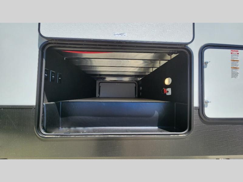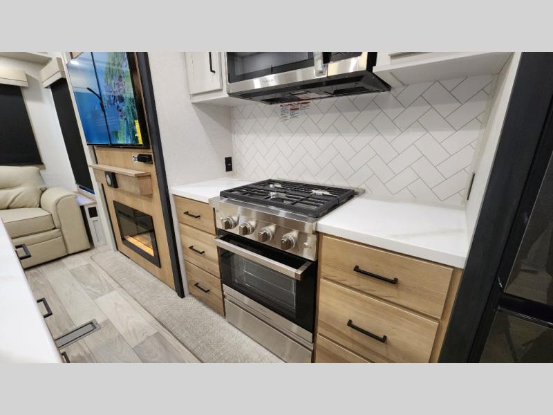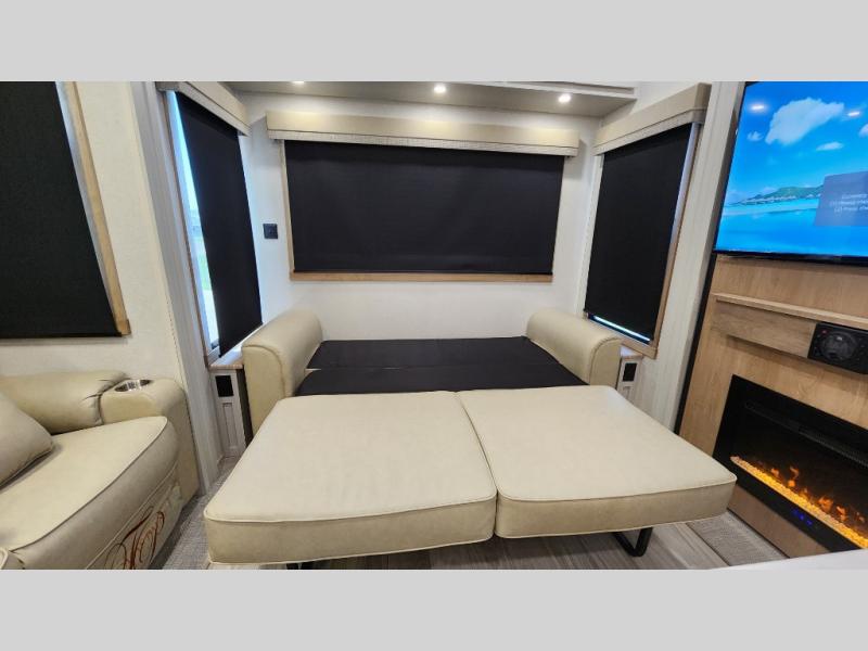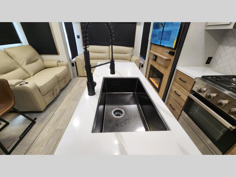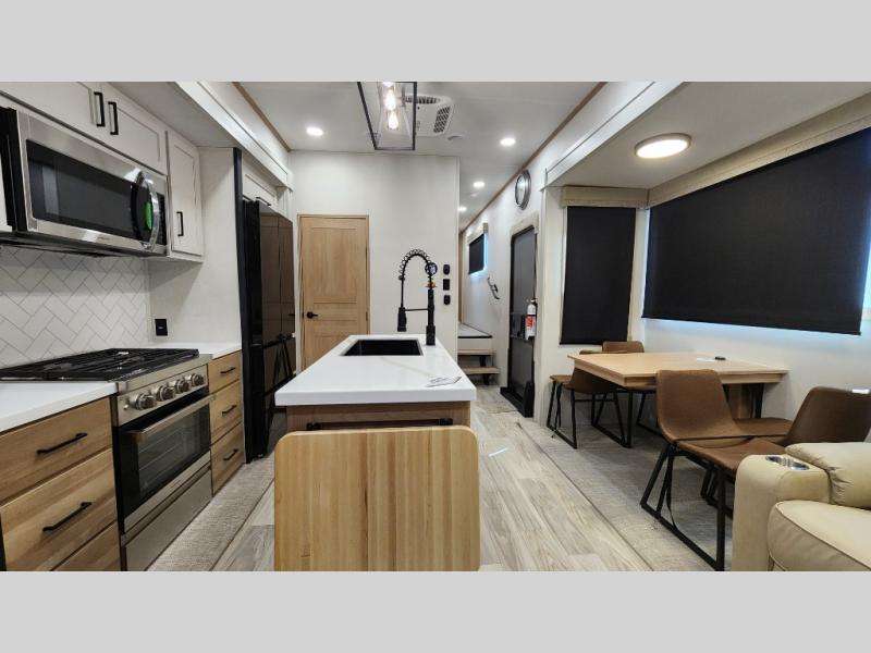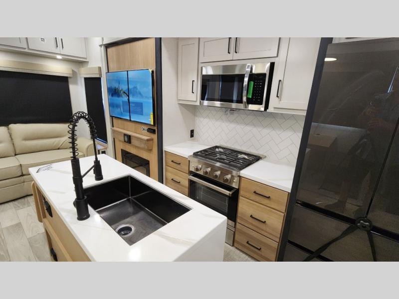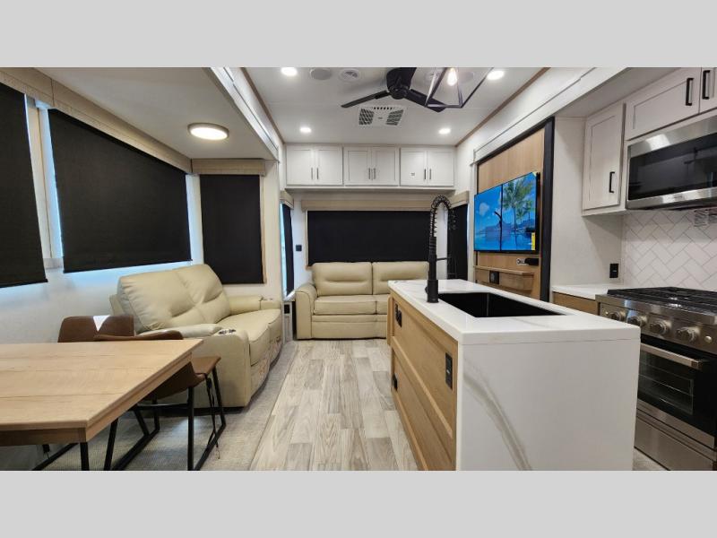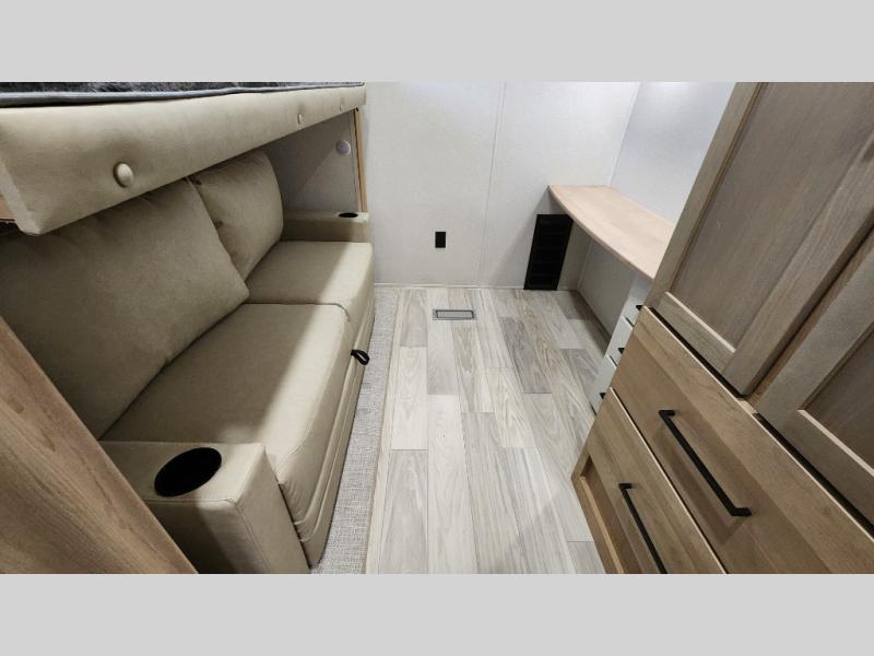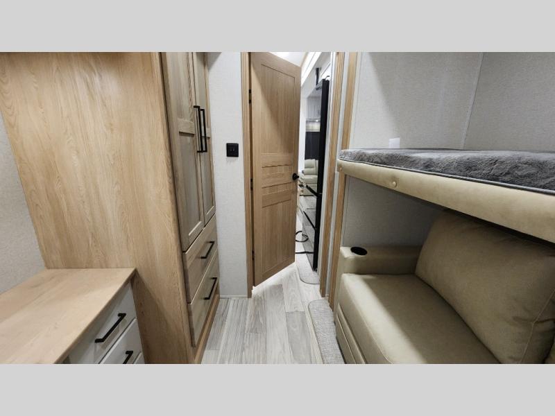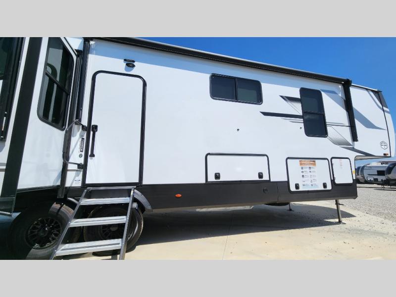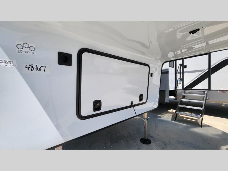 Pick your favorite camping spot and head out for relaxing weekends in this four slide out fifth wheel! You will feel at home in the front private bedroom with its king bed slide out, large front wardrobe with shelves, plus washer and dryer prep if you plan to go full-time. Your guests can make their beds in the middle bunkroom that includes a hide-a-bed sofa with a bunk above, plus a desk if you choose to make this room an office. There is even a loft above this room for more sleeping or storage space. Everyone will love to meet in the middle living area that includes a rear hide-a-bed sofa, theater seating across from the entertainment center, and a free-standing table and chairs for dining. And the chef will enjoy having a kitchen island for more prep space, along with a 12V refrigerator and a three burner high range with a 24" oven. Don't overlook the exterior with an outside kitchen, 20' power awning, and pass-through storage!