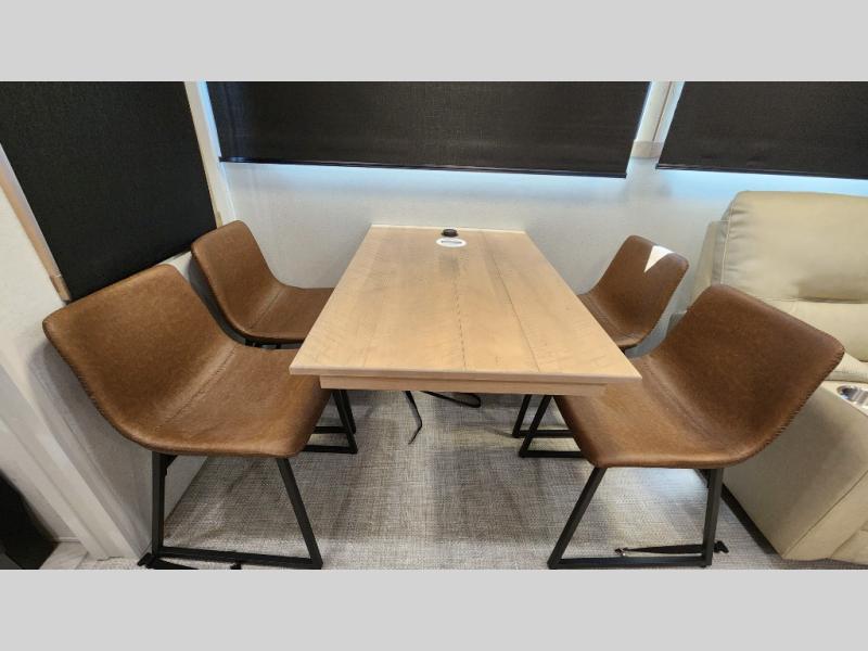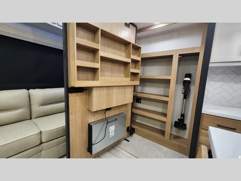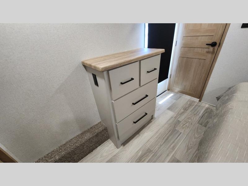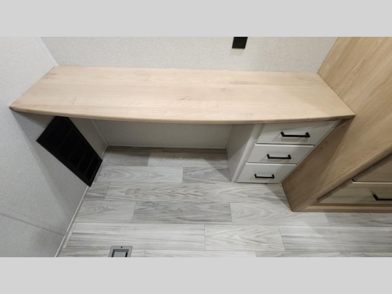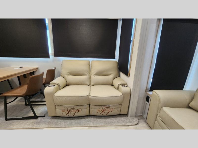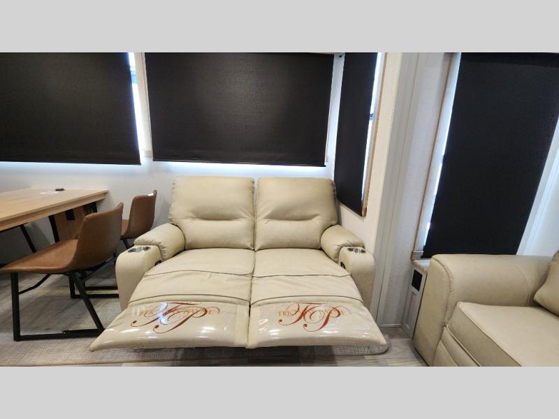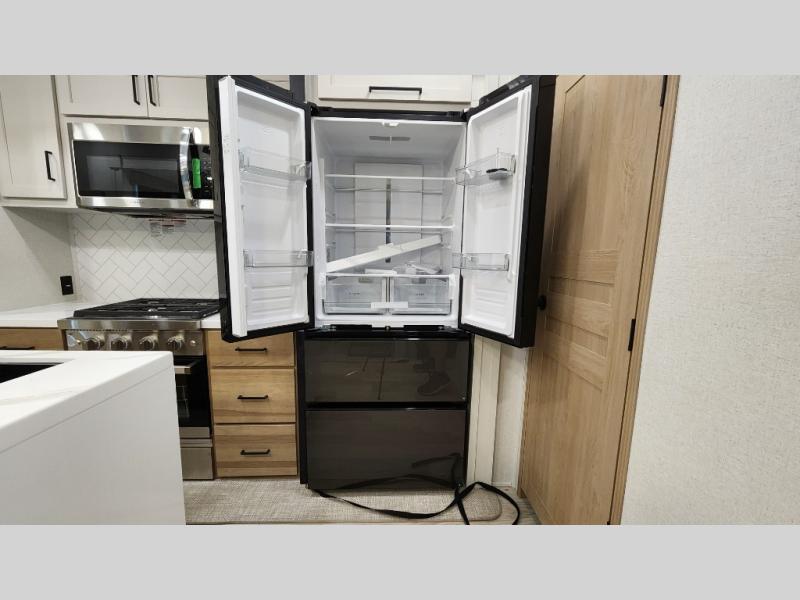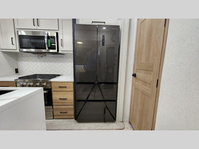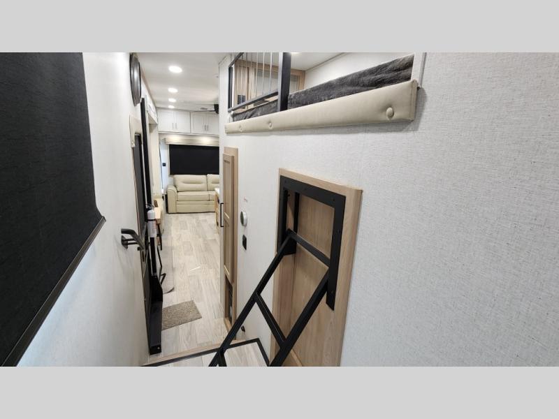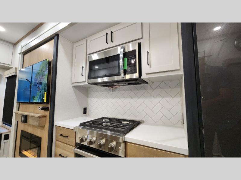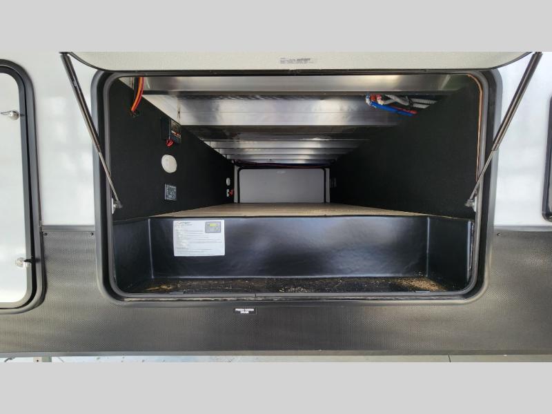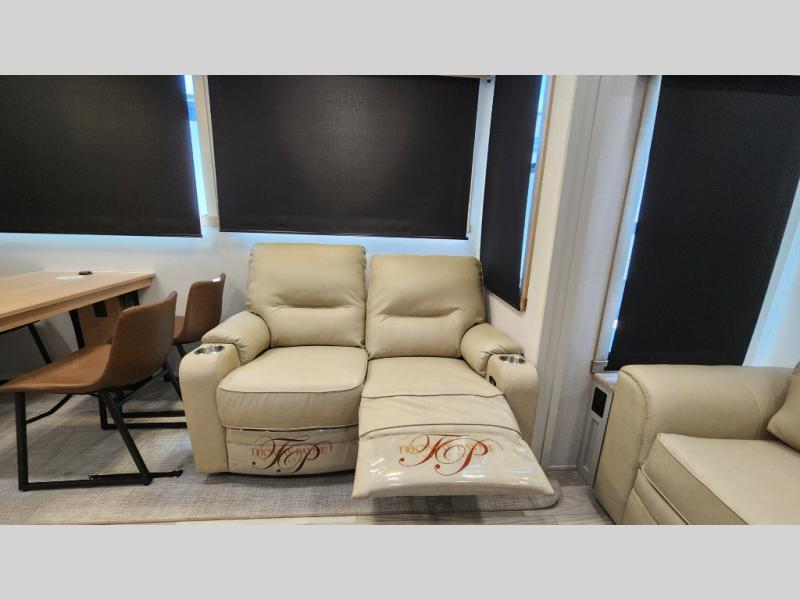 Pick your favorite camping spot and head out for relaxing weekends in this four slide out fifth wheel! You will feel at home in the front private bedroom with its king bed slide out, large front wardrobe with shelves, plus washer and dryer prep if you plan to go full-time. Your guests can make their beds in the middle bunkroom that includes a hide-a-bed sofa with a bunk above, plus a desk if you choose to make this room an office. There is even a loft above this room for more sleeping or storage space. Everyone will love to meet in the middle living area that includes a rear hide-a-bed sofa, theater seating across from the entertainment center, and a free-standing table and chairs for dining. And the chef will enjoy having a kitchen island for more prep space, along with a 12V refrigerator and a three burner high range with a 24" oven. Don't overlook the exterior with an outside kitchen, 20' power awning, and pass-through storage!