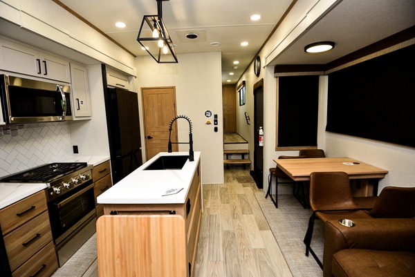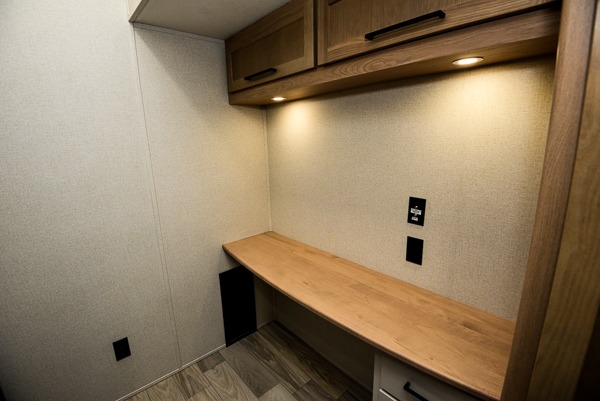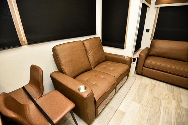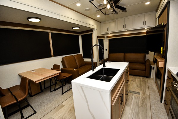 Pick your favorite camping spot and head out for relaxing weekends in this four slide out fifth wheel! You will feel at home in the front private bedroom with its king bed slide out, large front wardrobe with shelves, plus washer and dryer prep if you plan to go full-time. Your guests can make their beds in the middle bunkroom that includes a hide-a-bed sofa with a bunk above, plus a desk if you choose to make this room an office. There is even a loft above this room for more sleeping or storage space. Everyone will love to meet in the middle living area that includes a rear hide-a-bed sofa, theater seating across from the entertainment center, and a free-standing table and chairs for dining. And the chef will enjoy having a kitchen island for more prep space, along with a 12V refrigerator and a three burner high range with a 24" oven. Don't overlook the exterior with an outside kitchen, 20' power awning, and pass-through storage!