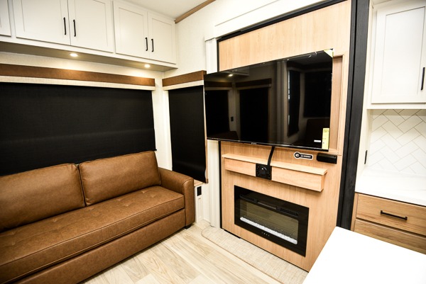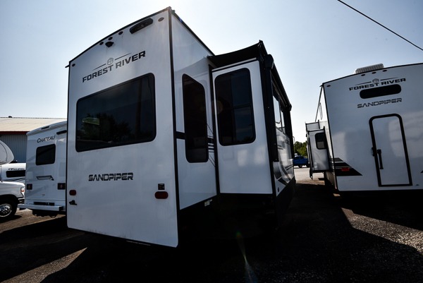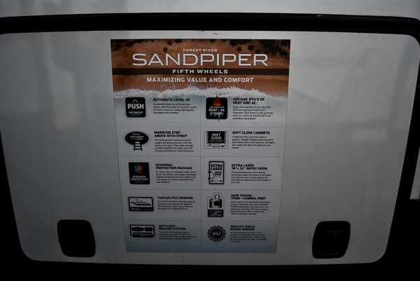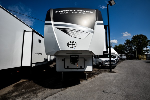 You will find the perfect balance of size, space, features, and luxury with any one of these Forest River Sandpiper fifth wheels! They are constructed with a welded aluminum framed vacuum bonded laminated superstructure, a cambered powder coated frame with rust prohibitor, and a fully enclosed underbelly for added protection against the elements. The large tinted windows come with a 80/20 UV prohibitor or you can choose the optional dual pane windows. Some hassle-free amenities include a 60k BTU on-demand water heater, full coach water filter system, tire pressure monitor system, and an electric leveling system! Inside, you'll enjoy stainless steel appliances, solid surface countertops, Beachside Sundance linoleum, recessed residential lighting, and many more comforts!