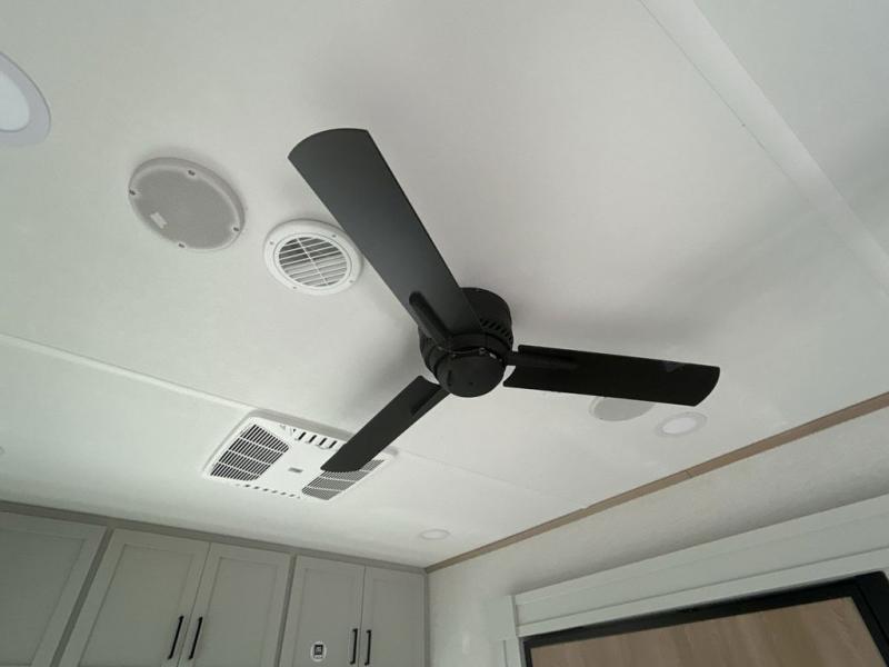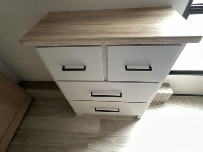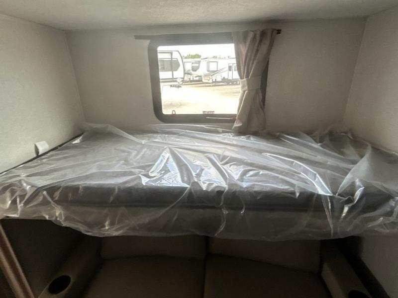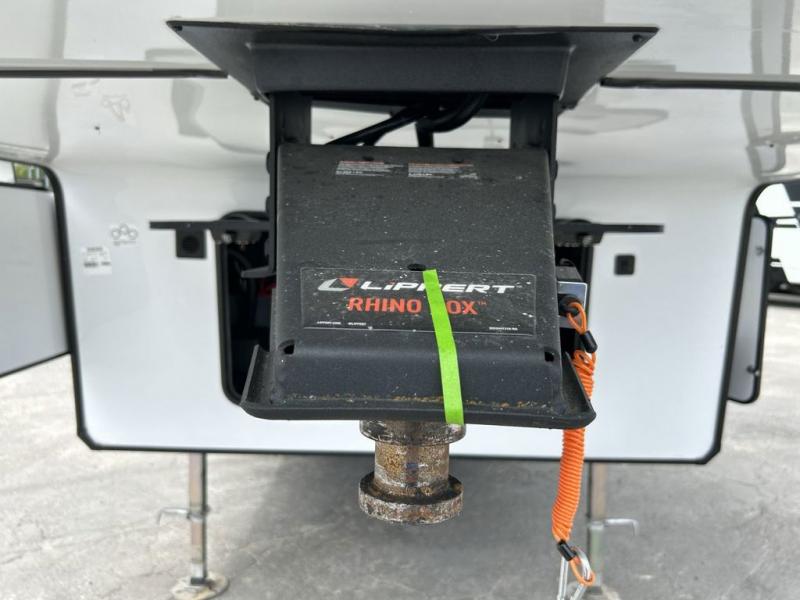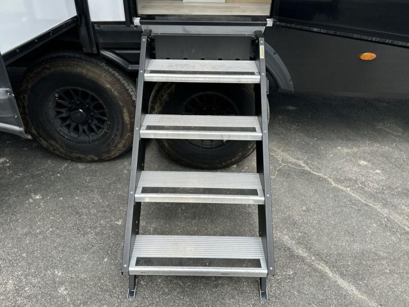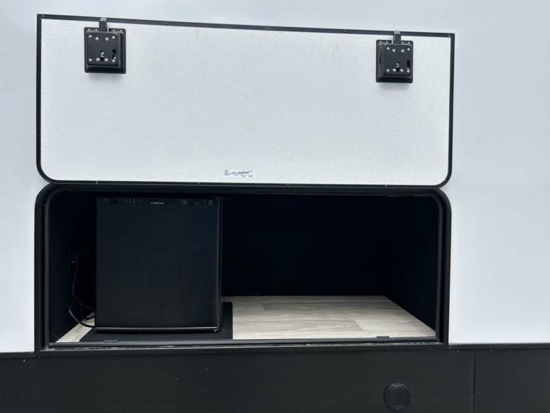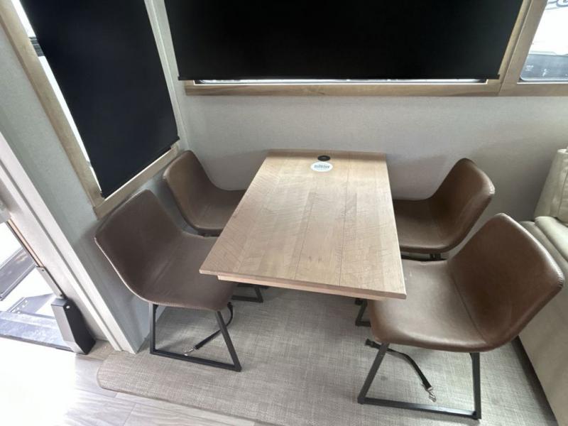 Pick your favorite camping spot and head out for relaxing weekends in this four slide out fifth wheel! You will feel at home in the front private bedroom with its king bed slide out, large front wardrobe with shelves, plus washer and dryer prep if you plan to go full-time. Your guests can make their beds in the middle bunkroom that includes a hide-a-bed sofa with a bunk above, plus a desk if you choose to make this room an office. There is even a loft above this room for more sleeping or storage space. Everyone will love to meet in the middle living area that includes a rear hide-a-bed sofa, theater seating across from the entertainment center, and a free-standing table and chairs for dining. And the chef will enjoy having a kitchen island for more prep space, along with a 12V refrigerator and a three burner high range with a 24" oven. Don't overlook the exterior with an outside kitchen, 20' power awning, and pass-through storage!