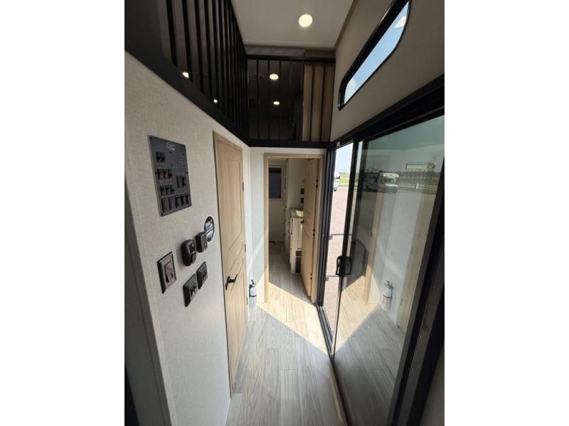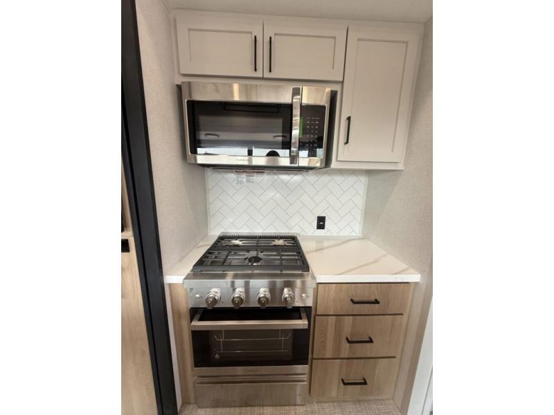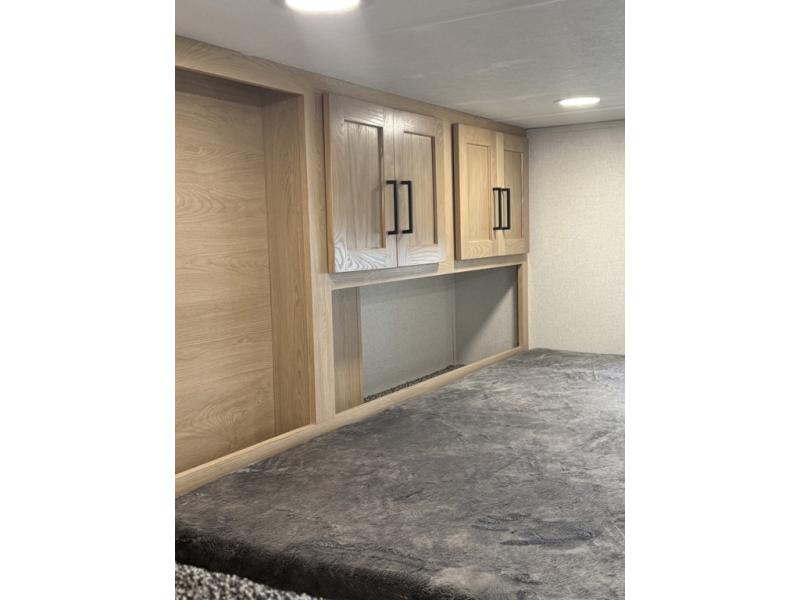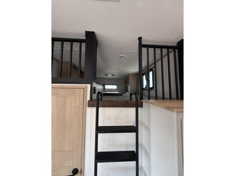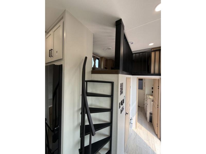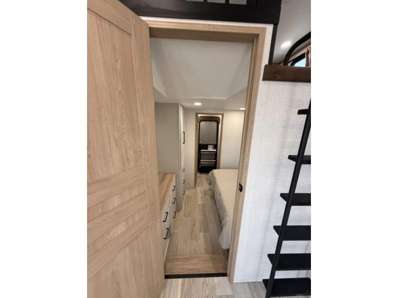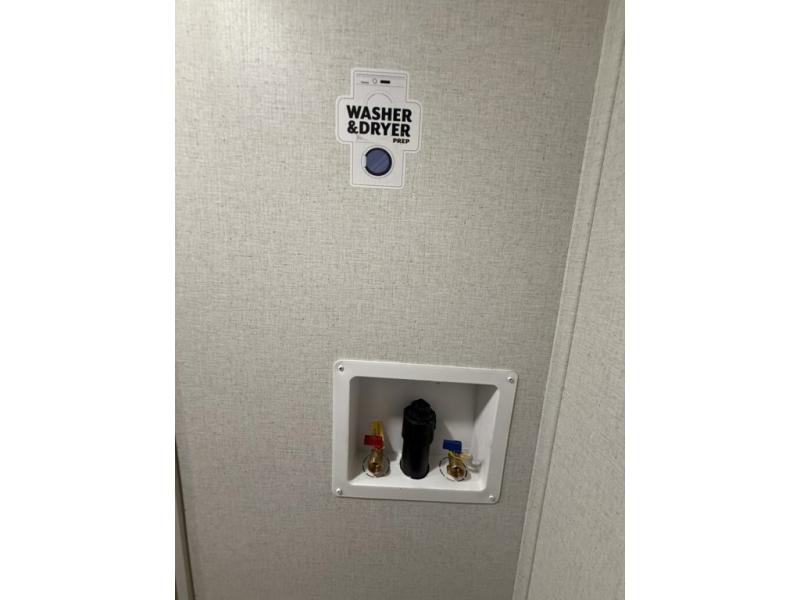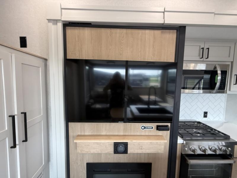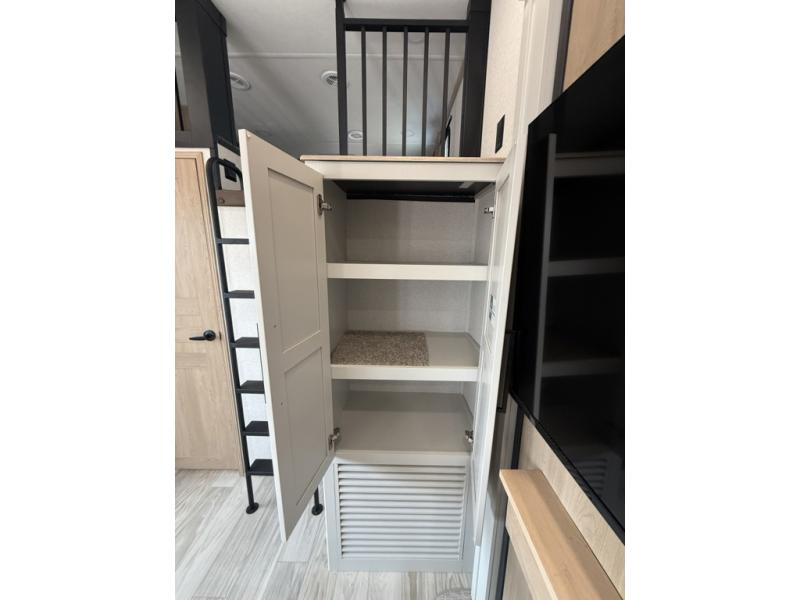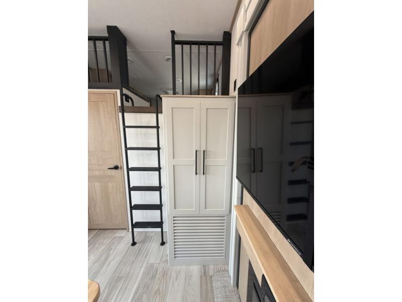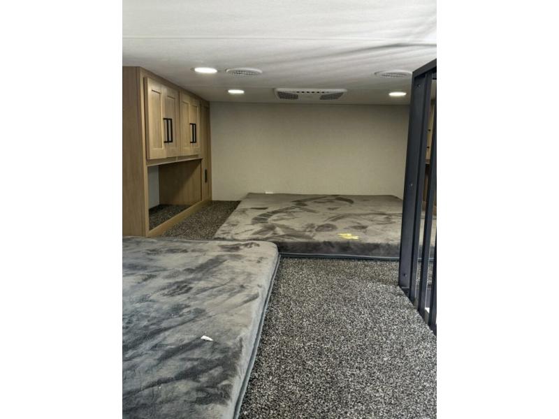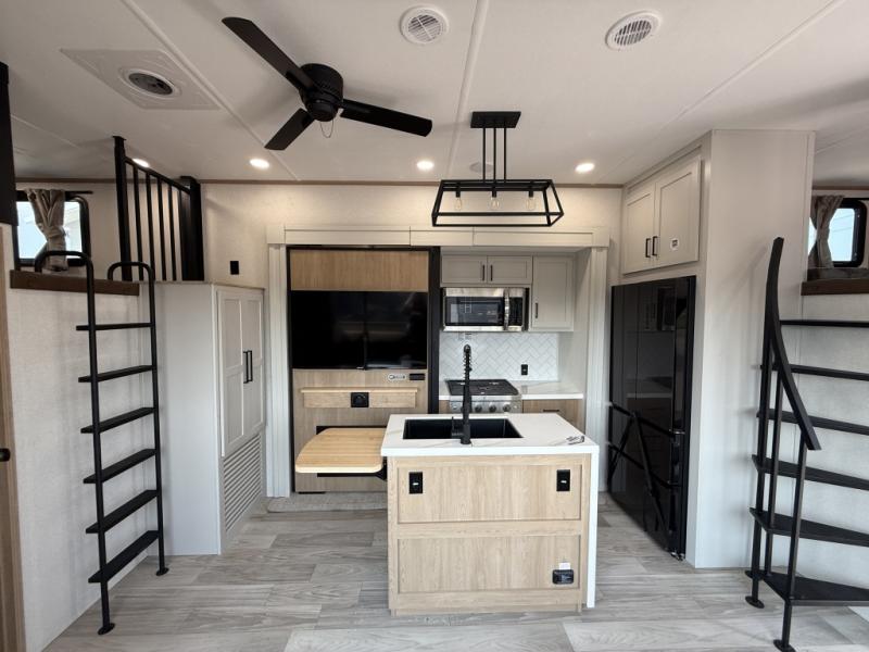 You won't believe the comfort and convenience found in this destination trailer. There are two private bedrooms; one up front with a queen bed slide out and storage space, and one in back with a queen bed slide out and a half bath! There is even washer and dryer prep here if you want to add those appliances and the second entry door is found here so you can easily slip out in the morning. Above each of these rooms is a loft area three total bunk mats, storage cabinets, and TV prep in the front loft if you want to add entertainment. Everyone can meet in the combined kitchen and living room that includes dual opposing slides, theater seating across from the 50" flat screen TV and fireplace, plus a free-standing table and chairs to dine at. The chef of your group will love the large kitchen island 3.7 cu. ft. free-standing range with four burners and 19 cu. ft. 12V stainless refrigerator for food storage.