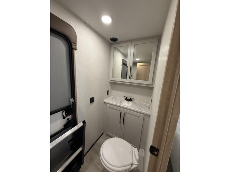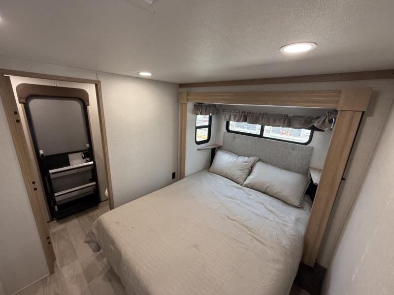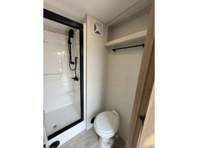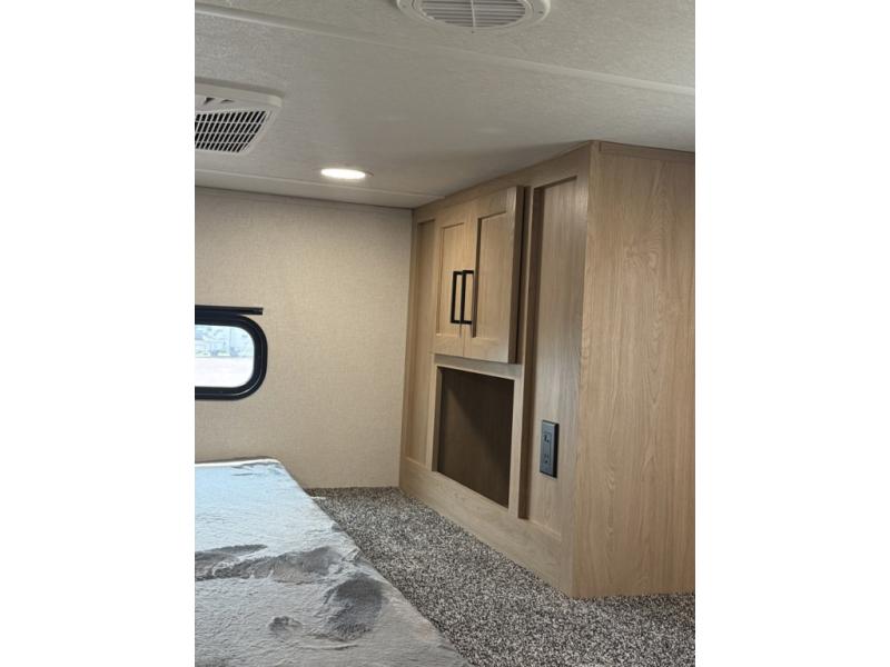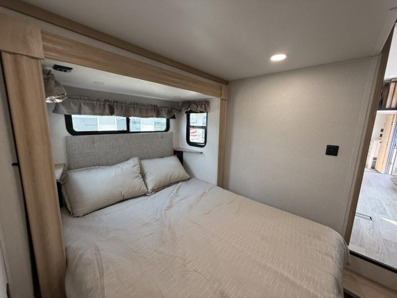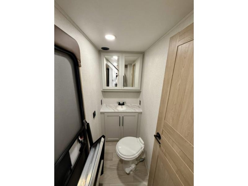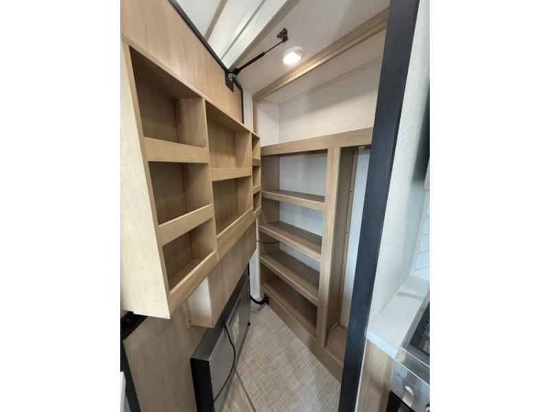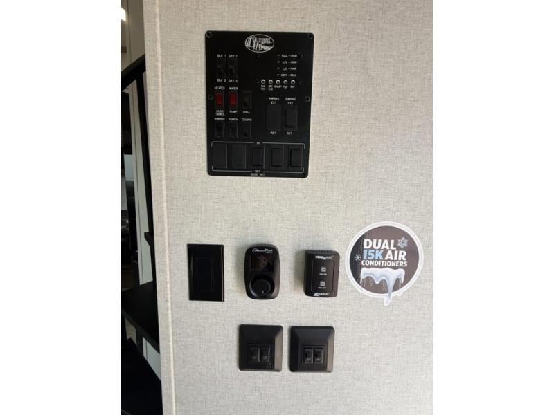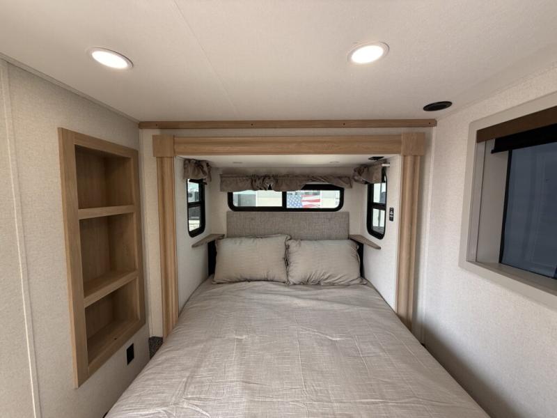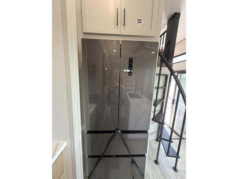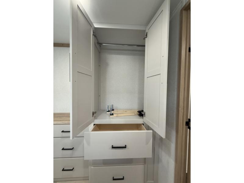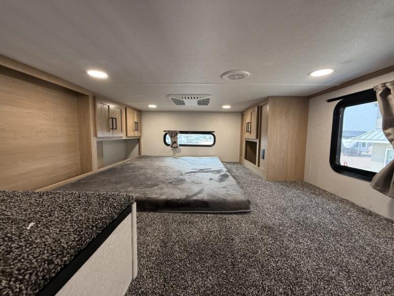 You won't believe the comfort and convenience found in this destination trailer. There are two private bedrooms; one up front with a queen bed slide out and storage space, and one in back with a queen bed slide out and a half bath! There is even washer and dryer prep here if you want to add those appliances and the second entry door is found here so you can easily slip out in the morning. Above each of these rooms is a loft area three total bunk mats, storage cabinets, and TV prep in the front loft if you want to add entertainment. Everyone can meet in the combined kitchen and living room that includes dual opposing slides, theater seating across from the 50" flat screen TV and fireplace, plus a free-standing table and chairs to dine at. The chef of your group will love the large kitchen island 3.7 cu. ft. free-standing range with four burners and 19 cu. ft. 12V stainless refrigerator for food storage.