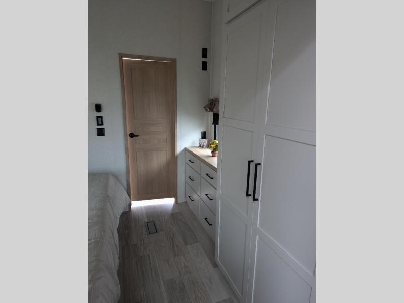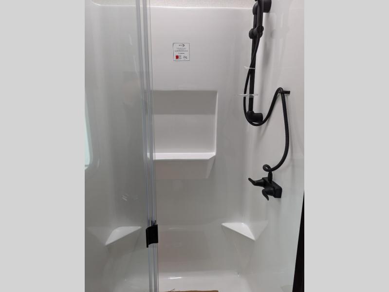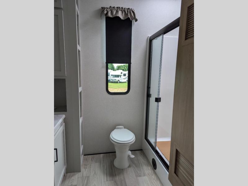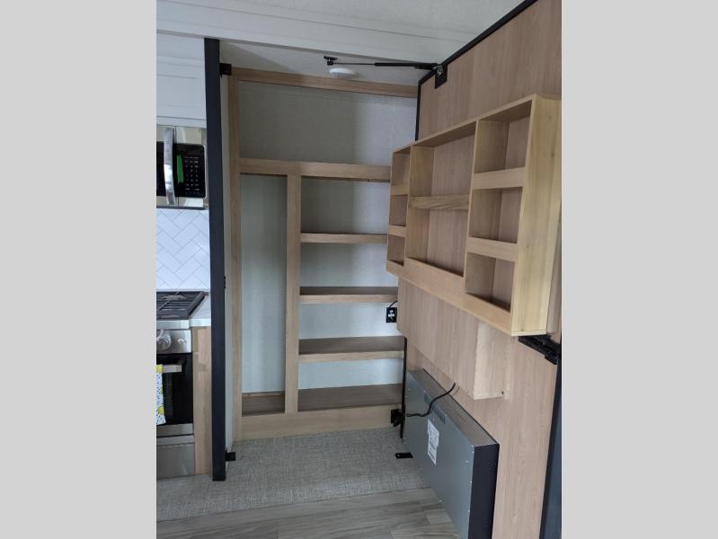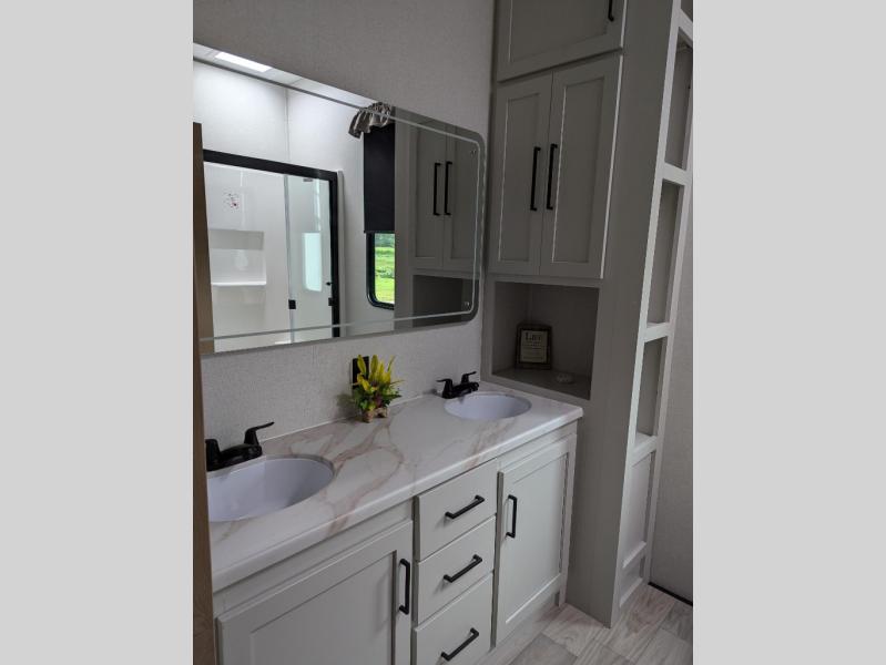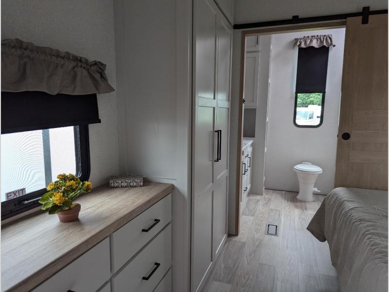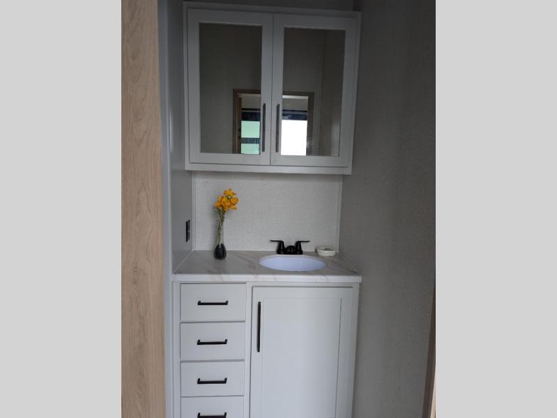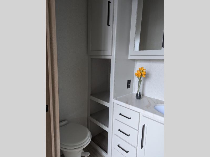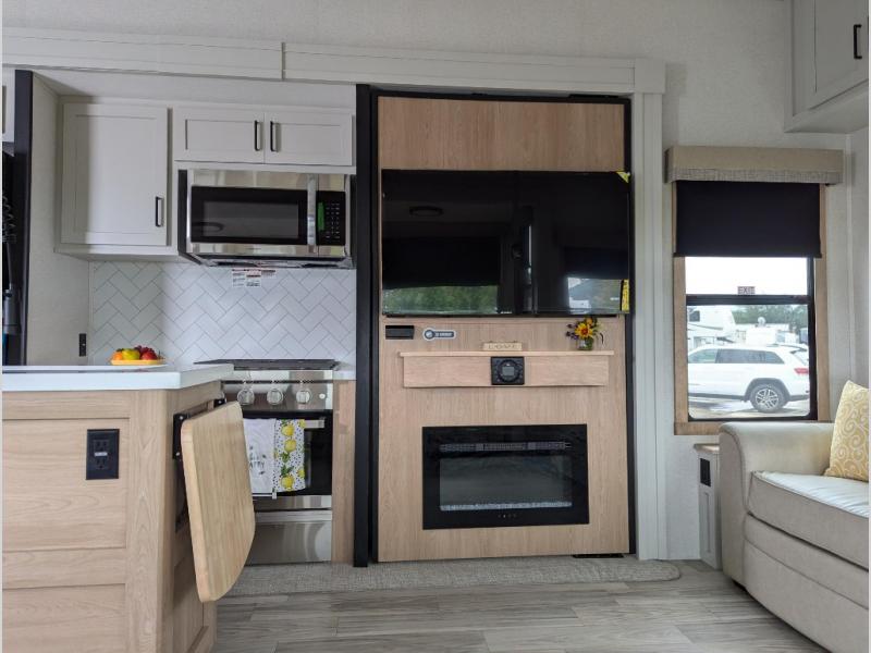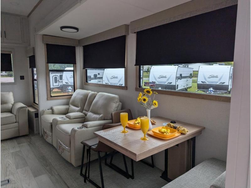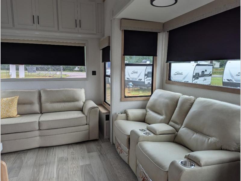 Enjoy extended stays in this triple slide out destination trailer! Once you unload your bags, you can put out the 19' awning with LED lights and relax in your camp chairs. The Chef Collection three burner range will let you make lunch for your crew when you head inside, and there is a free-standing dinette with a bench and two chairs to dine at. After your meal, you can relax on the theater seating across from the entertainment center with a hidden pantry behind it. There is also a front tri-fold hide-a-bed sofa to let guests sleep over. The mid-coach half bath will be easily accessible to use, and the full rear bath will create a master bedroom you are sure to love. There is a king bed slide out here, a dresser with TV prep, and two wardrobes to keep your things tidy!