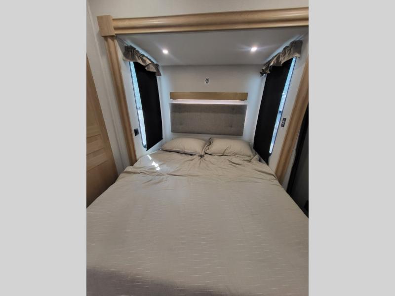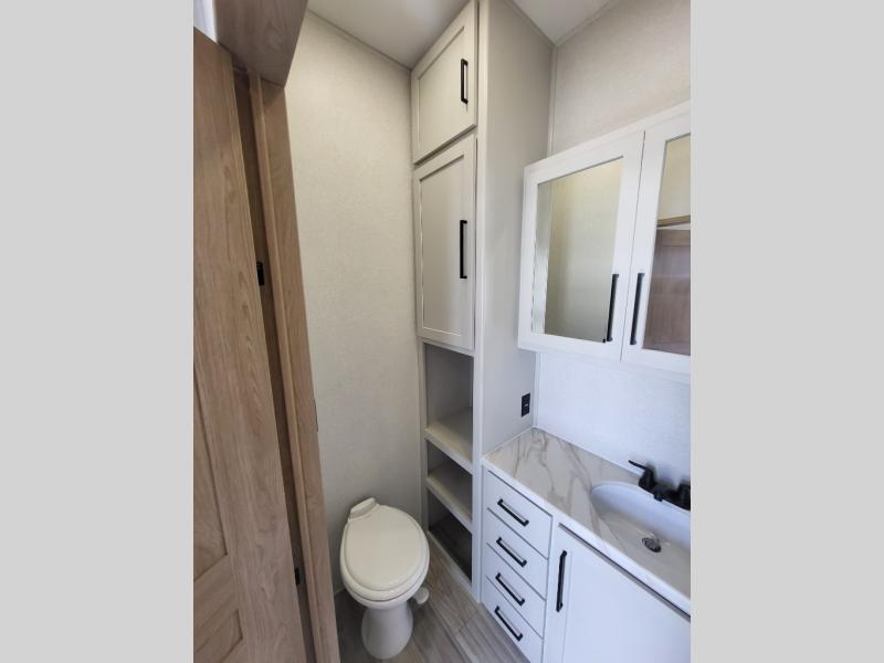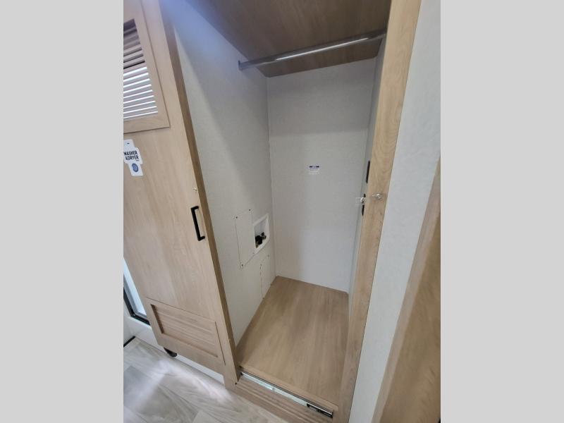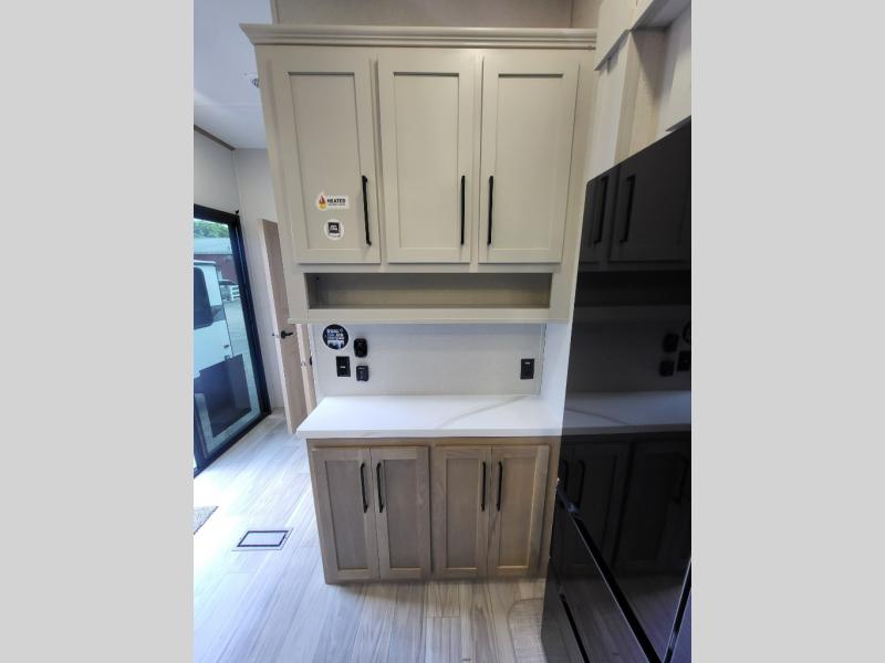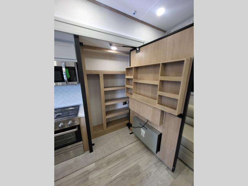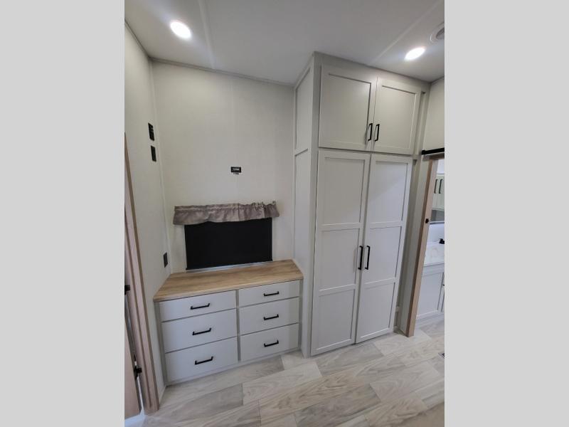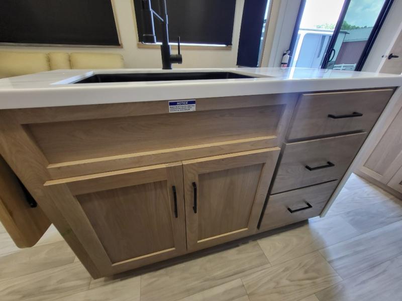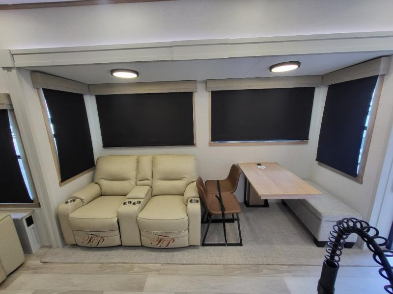 Enjoy extended stays in this triple slide out destination trailer! Once you unload your bags, you can put out the 19' awning with LED lights and relax in your camp chairs. The Chef Collection three burner range will let you make lunch for your crew when you head inside, and there is a free-standing dinette with a bench and two chairs to dine at. After your meal, you can relax on the theater seating across from the entertainment center with a hidden pantry behind it. There is also a front tri-fold hide-a-bed sofa to let guests sleep over. The mid-coach half bath will be easily accessible to use, and the full rear bath will create a master bedroom you are sure to love. There is a king bed slide out here, a dresser with TV prep, and two wardrobes to keep your things tidy!