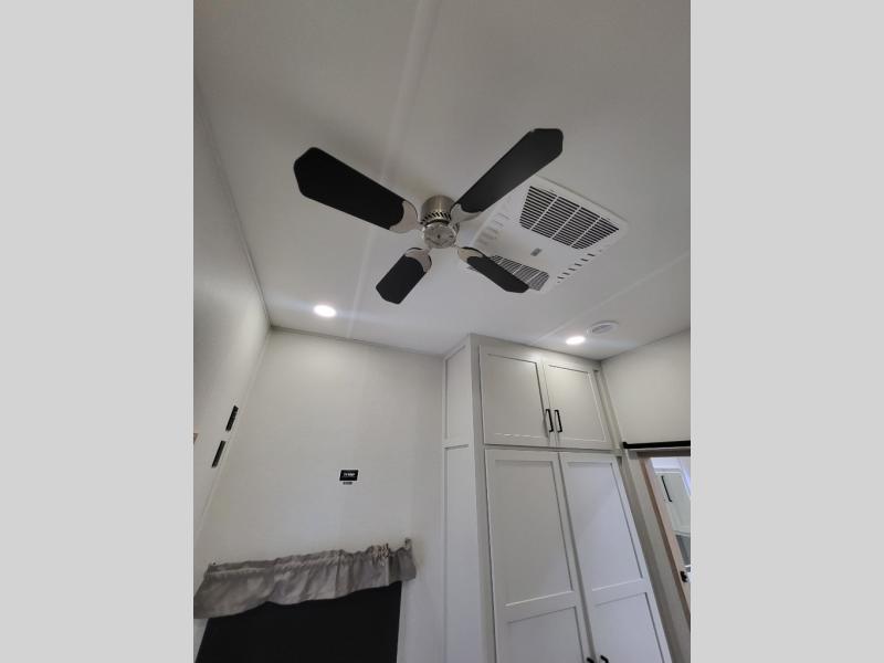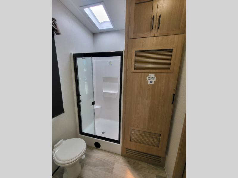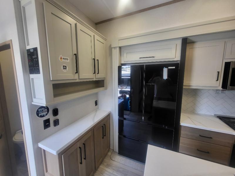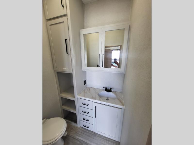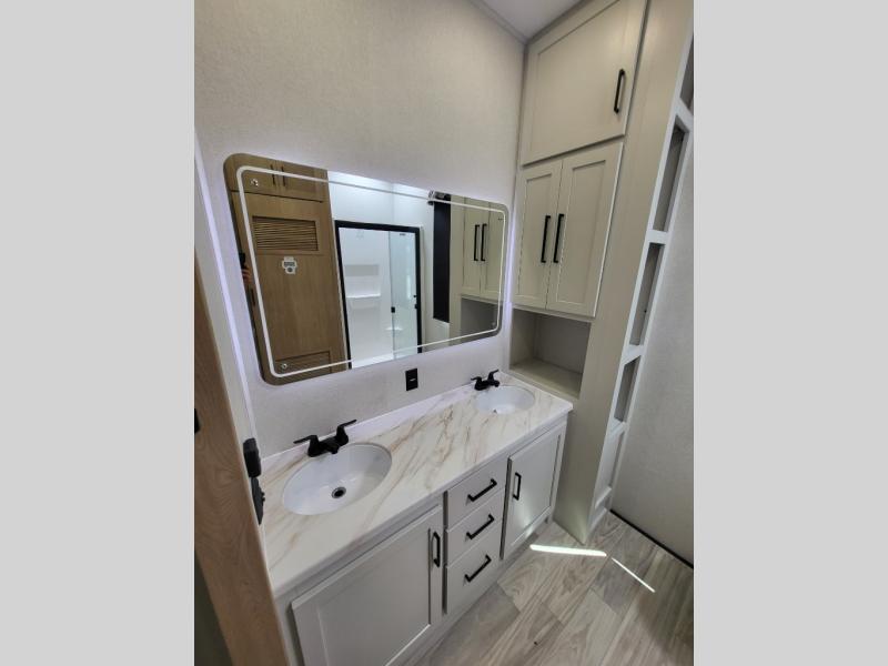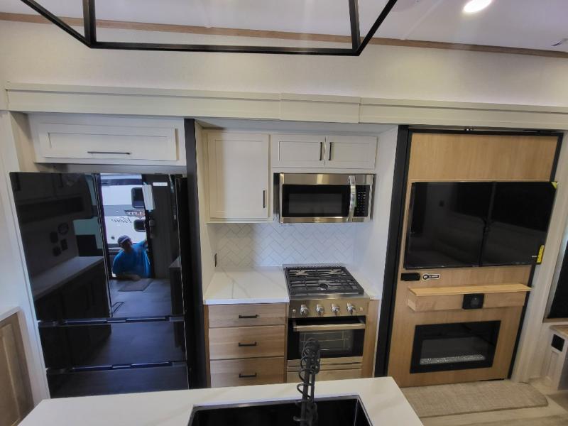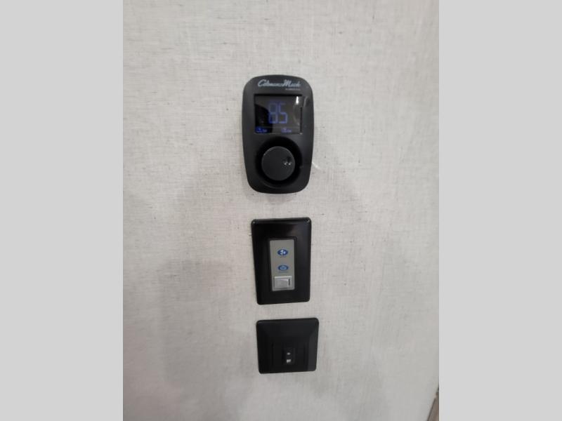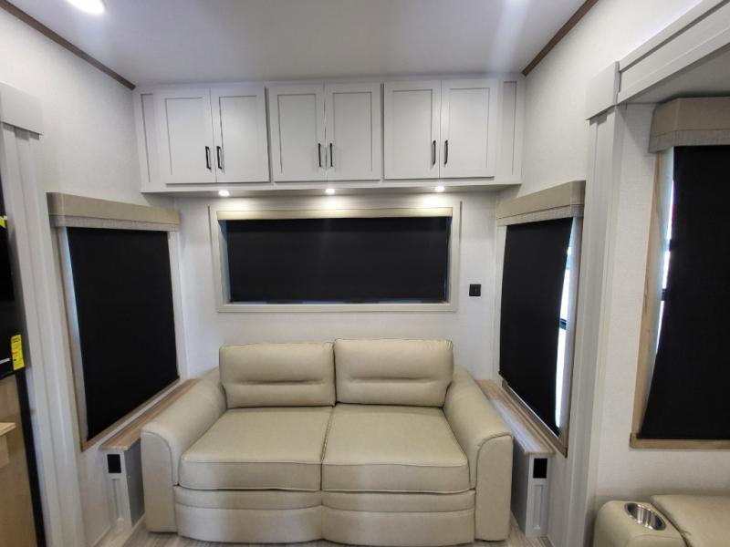 Enjoy extended stays in this triple slide out destination trailer! Once you unload your bags, you can put out the 19' awning with LED lights and relax in your camp chairs. The Chef Collection three burner range will let you make lunch for your crew when you head inside, and there is a free-standing dinette with a bench and two chairs to dine at. After your meal, you can relax on the theater seating across from the entertainment center with a hidden pantry behind it. There is also a front tri-fold hide-a-bed sofa to let guests sleep over. The mid-coach half bath will be easily accessible to use, and the full rear bath will create a master bedroom you are sure to love. There is a king bed slide out here, a dresser with TV prep, and two wardrobes to keep your things tidy!