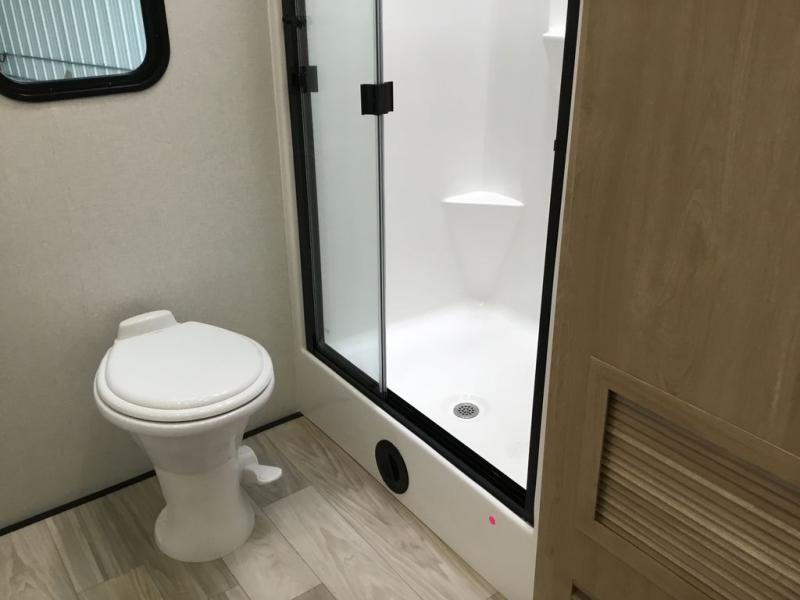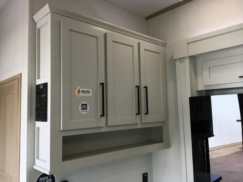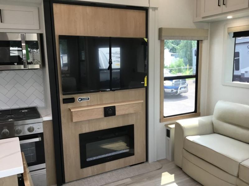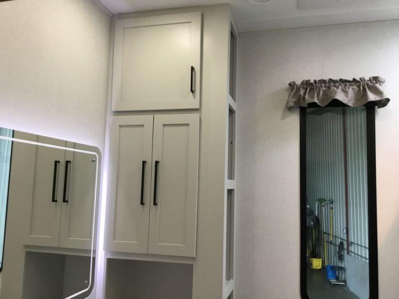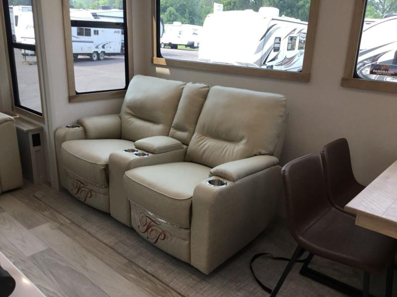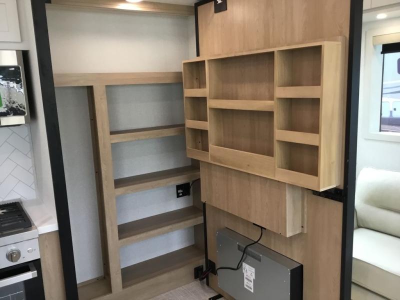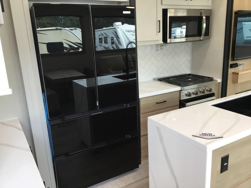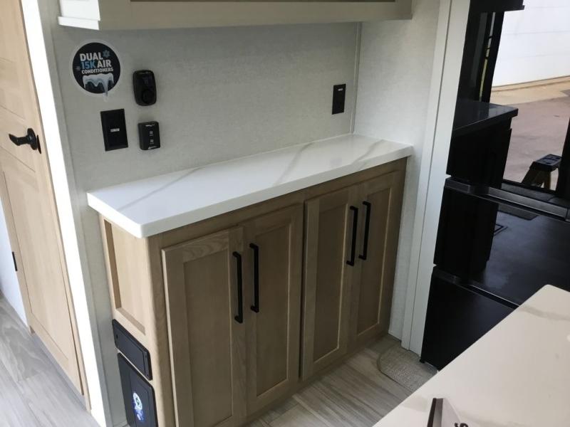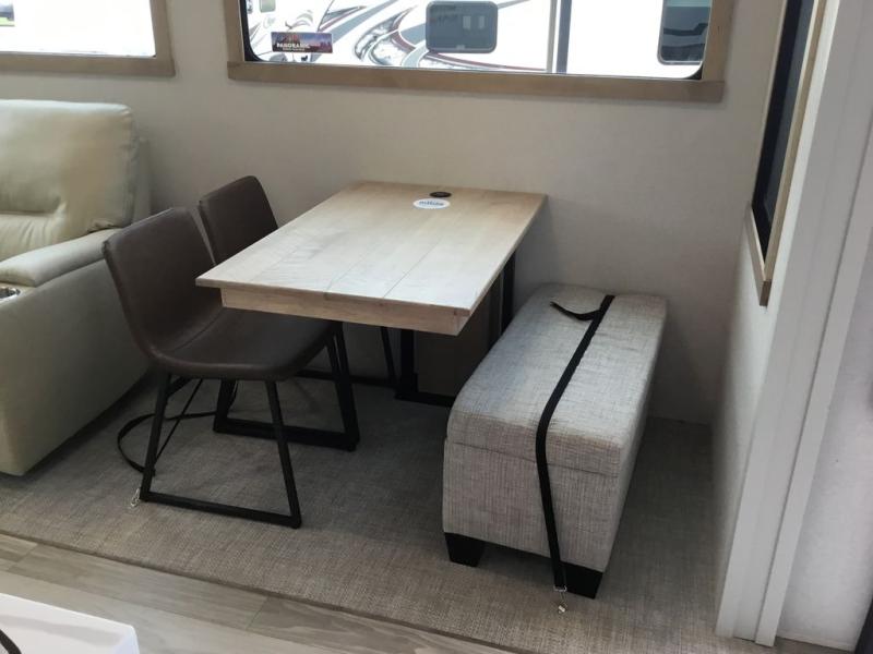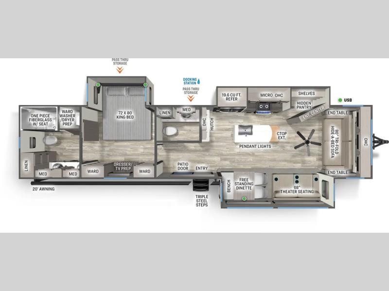 Enjoy extended stays in this triple slide out destination trailer! Once you unload your bags, you can put out the 19' awning with LED lights and relax in your camp chairs. The Chef Collection three burner range will let you make lunch for your crew when you head inside, and there is a free-standing dinette with a bench and two chairs to dine at. After your meal, you can relax on the theater seating across from the entertainment center with a hidden pantry behind it. There is also a front tri-fold hide-a-bed sofa to let guests sleep over. The mid-coach half bath will be easily accessible to use, and the full rear bath will create a master bedroom you are sure to love. There is a king bed slide out here, a dresser with TV prep, and two wardrobes to keep your things tidy!