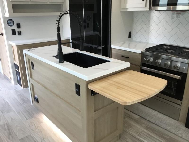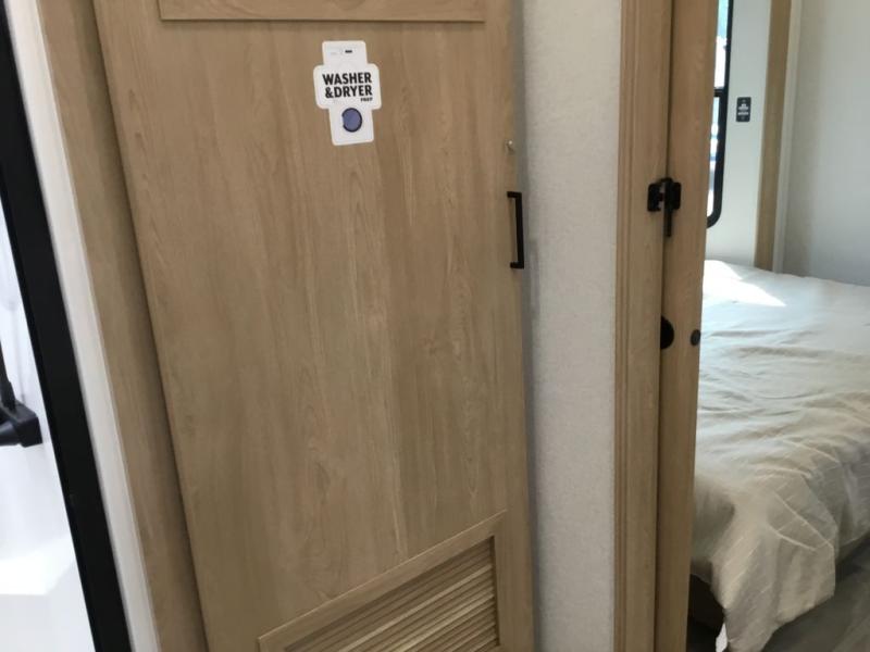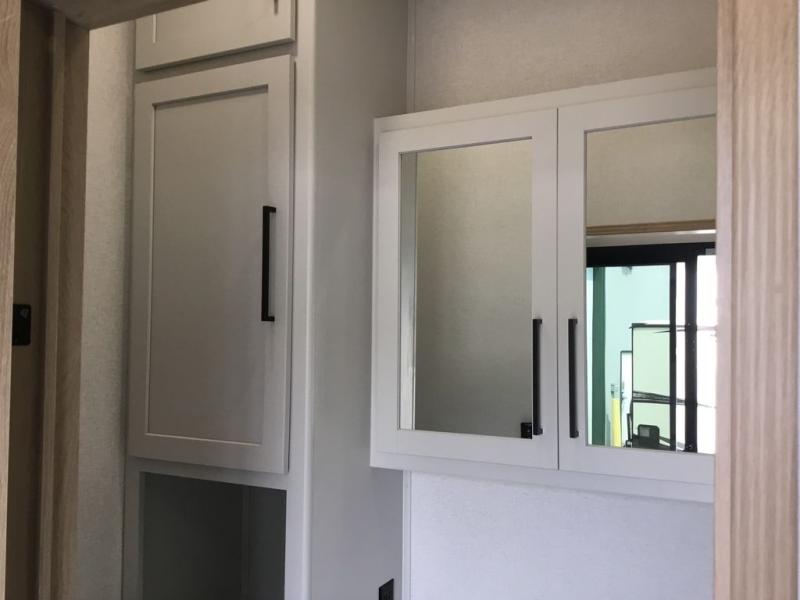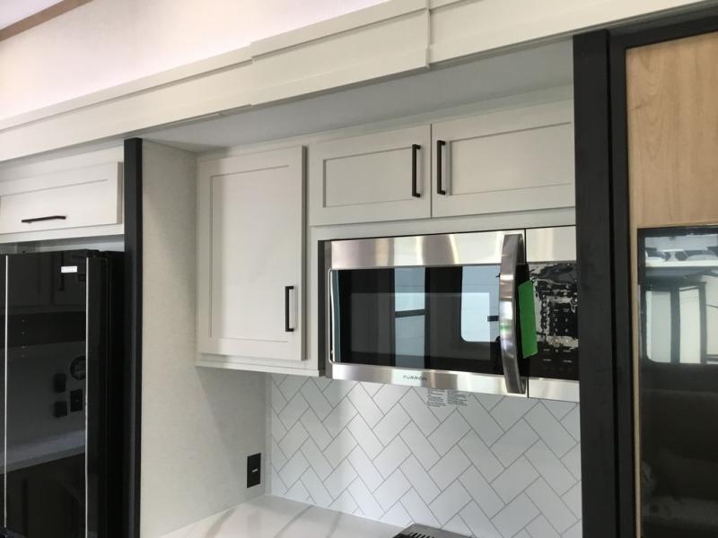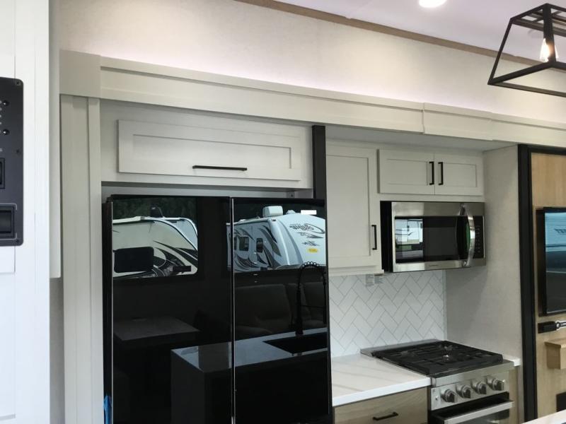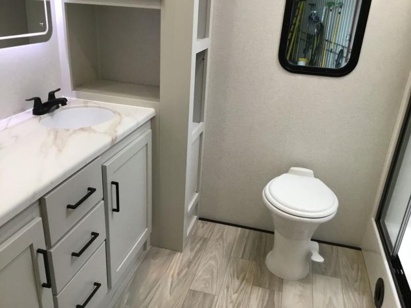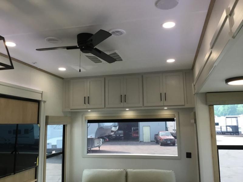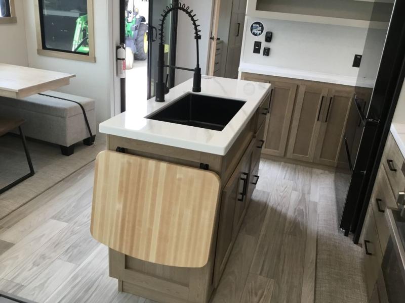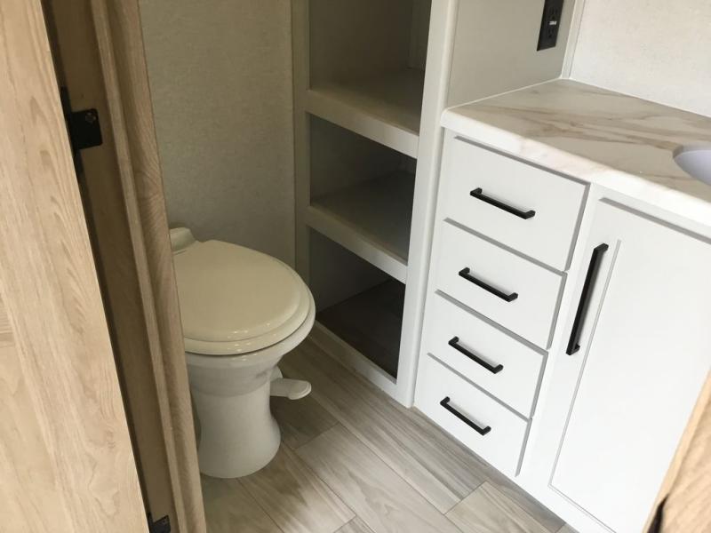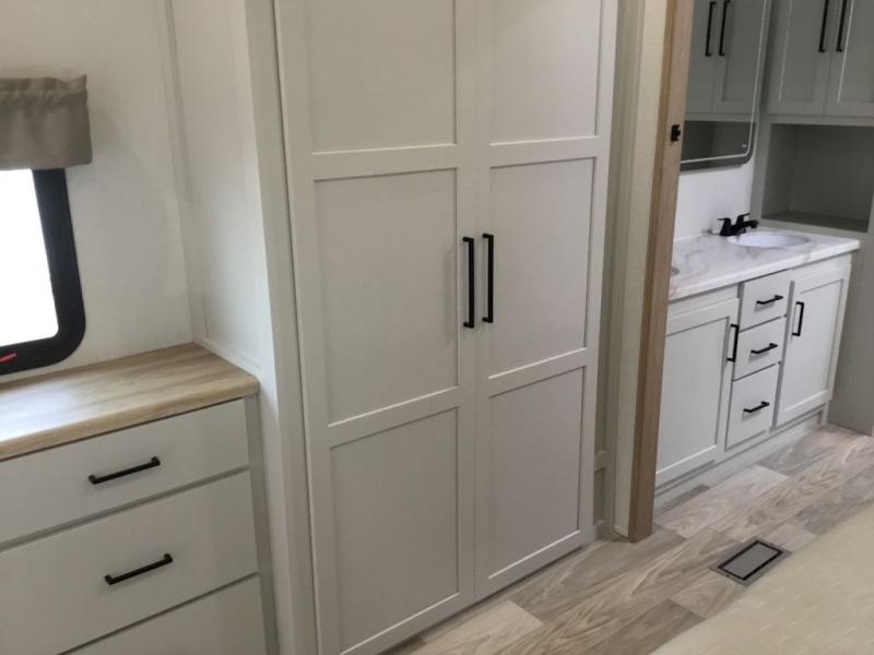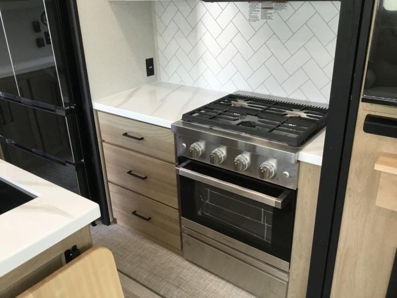Enjoy extended stays in this triple slide out destination trailer! Once you unload your bags, you can put out the 19' awning with LED lights and relax in your camp chairs. The Chef Collection three burner range will let you make lunch for your crew when you head inside, and there is a free-standing dinette with a bench and two chairs to dine at. After your meal, you can relax on the theater seating across from the entertainment center with a hidden pantry behind it. There is also a front tri-fold hide-a-bed sofa to let guests sleep over. The mid-coach half bath will be easily accessible to use, and the full rear bath will create a master bedroom you are sure to love. There is a king bed slide out here, a dresser with TV prep, and two wardrobes to keep your things tidy!