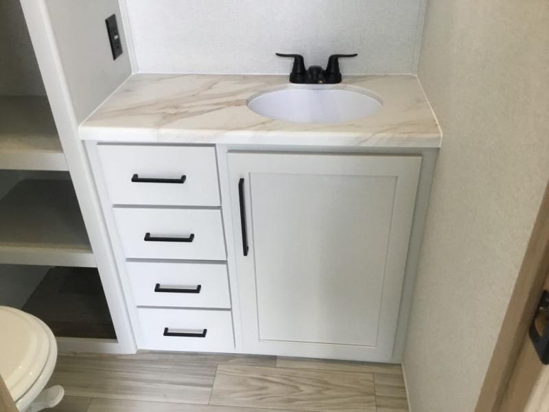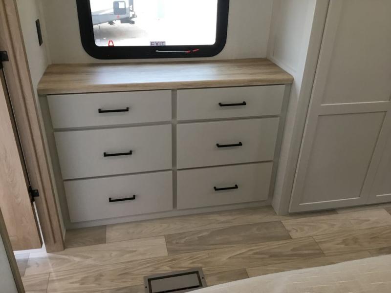 With each Sandpiper Destination Trailer by Forest River you will enjoy many luxurious features, such as crown molding over the kitchen cabinets, solid surface kitchen countertops, a memory foam mattress, plus so much more. The extra large picture windows throughout let natural light in and provide beautiful outdoor views, and each model includes three or more slides for added interior space. You'll find many exterior conveniences, like the porch light with an interior switch, the rain gutters with extra long drip spouts to prevent black streaking, and an electric awning with LED light strip, plus more! You will stay comfortable year around with dual 15,000 A/C units plus each model is constructed with an Underbelly Armor for better protection and insulation!