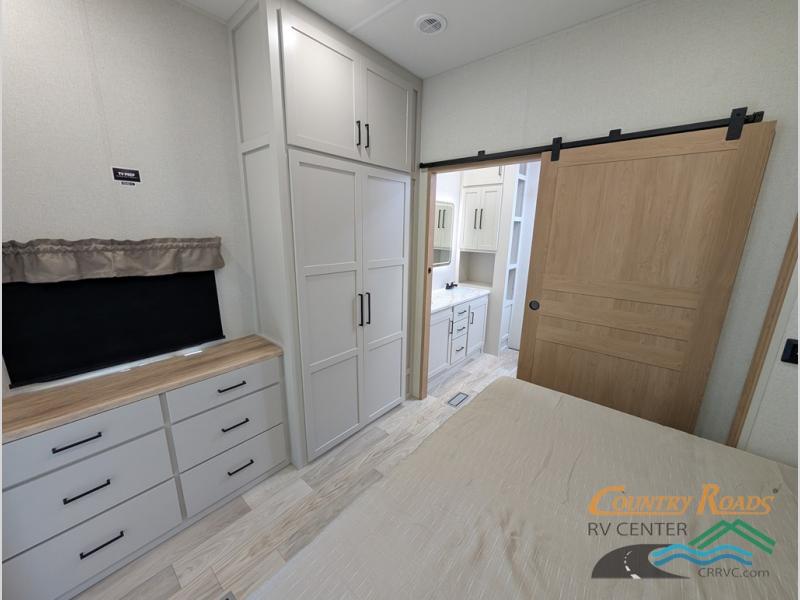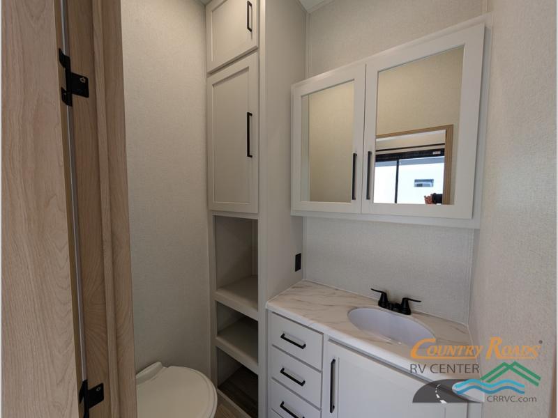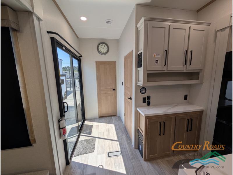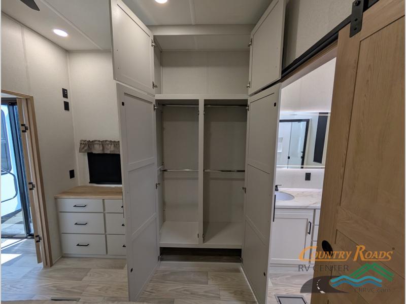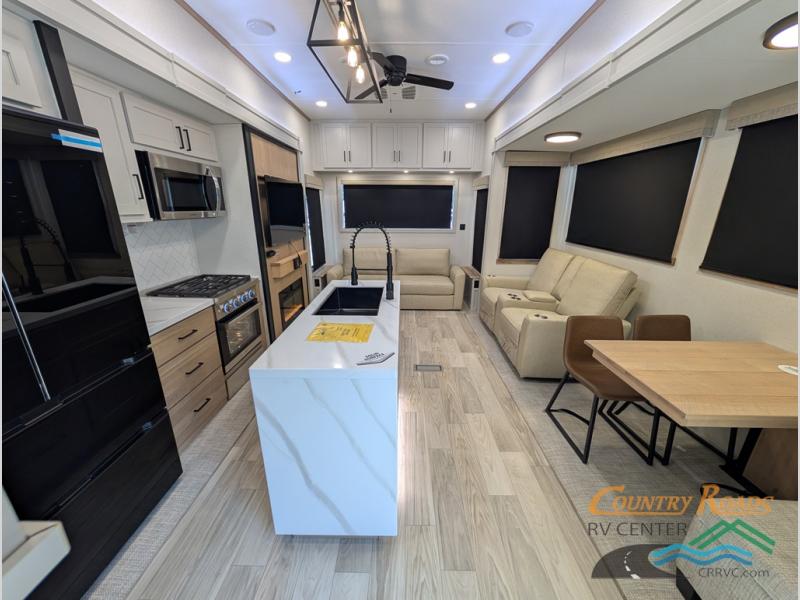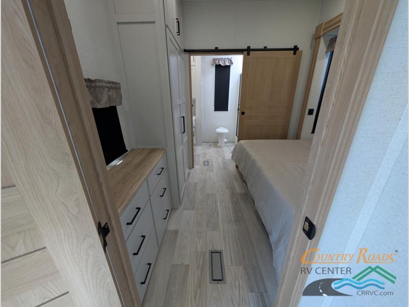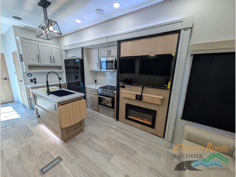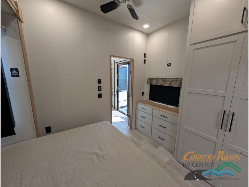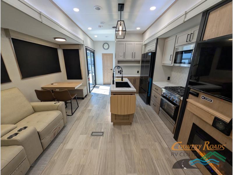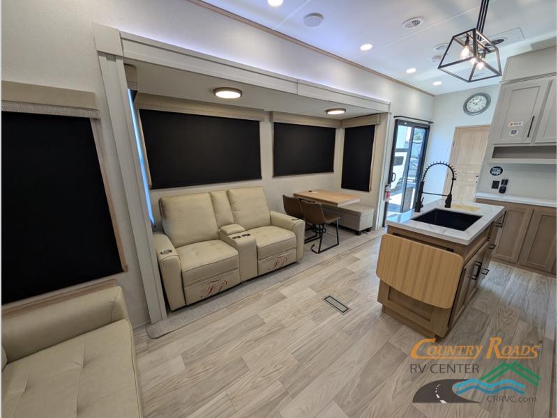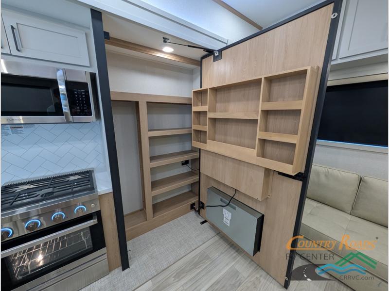 Enjoy extended stays in this triple slide out destination trailer! Once you unload your bags, you can put out the 19' awning with LED lights and relax in your camp chairs. The Chef Collection three burner range will let you make lunch for your crew when you head inside, and there is a free-standing dinette with a bench and two chairs to dine at. After your meal, you can relax on the theater seating across from the entertainment center with a hidden pantry behind it. There is also a front tri-fold hide-a-bed sofa to let guests sleep over. The mid-coach half bath will be easily accessible to use, and the full rear bath will create a master bedroom you are sure to love. There is a king bed slide out here, a dresser with TV prep, and two wardrobes to keep your things tidy!