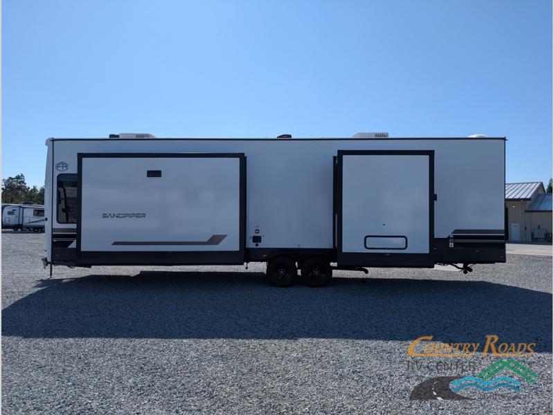 With each Sandpiper Destination Trailer by Forest River you will enjoy many luxurious features, such as crown molding over the kitchen cabinets, solid surface kitchen countertops, a memory foam mattress, plus so much more. The extra large picture windows throughout let natural light in and provide beautiful outdoor views, and each model includes three or more slides for added interior space. You'll find many exterior conveniences, like the porch light with an interior switch, the rain gutters with extra long drip spouts to prevent black streaking, and an electric awning with LED light strip, plus more! You will stay comfortable year around with dual 15,000 A/C units plus each model is constructed with an Underbelly Armor for better protection and insulation!