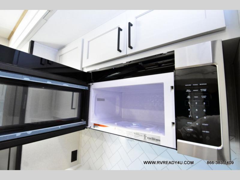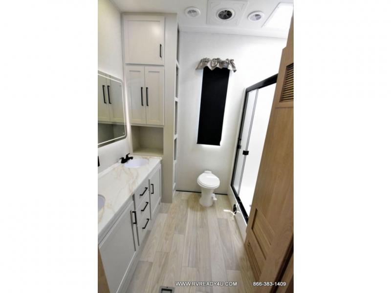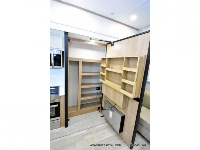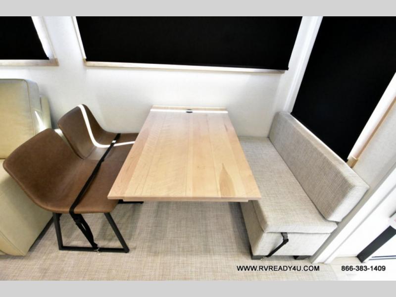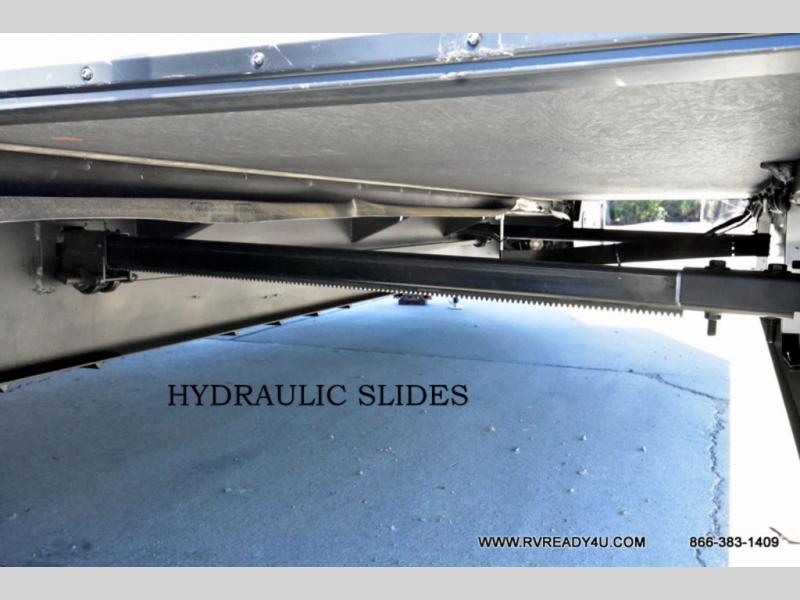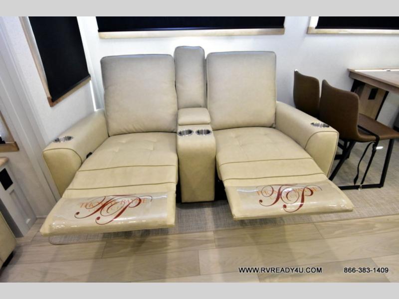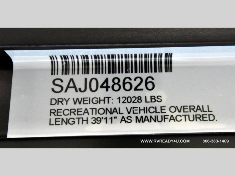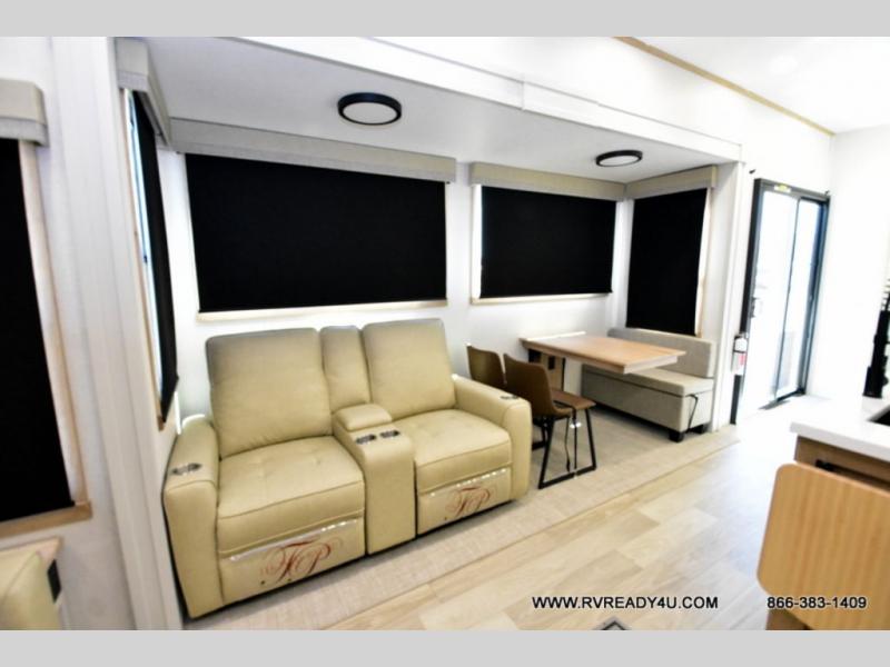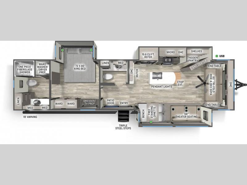 Enjoy extended stays in this triple slide out destination trailer! Once you unload your bags, you can put out the 19' awning with LED lights and relax in your camp chairs. The Chef Collection three burner range will let you make lunch for your crew when you head inside, and there is a free-standing dinette with a bench and two chairs to dine at. After your meal, you can relax on the theater seating across from the entertainment center with a hidden pantry behind it. There is also a front tri-fold hide-a-bed sofa to let guests sleep over. The mid-coach half bath will be easily accessible to use, and the full rear bath will create a master bedroom you are sure to love. There is a king bed slide out here, a dresser with TV prep, and two wardrobes to keep your things tidy!