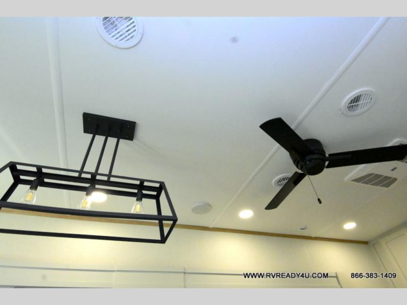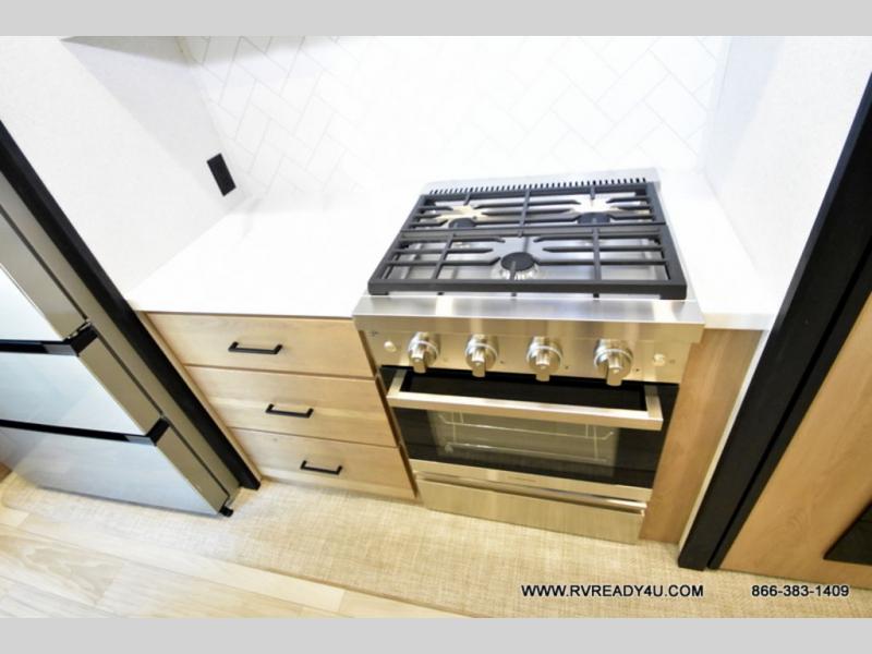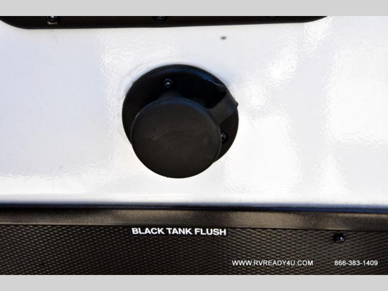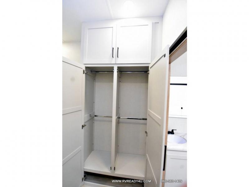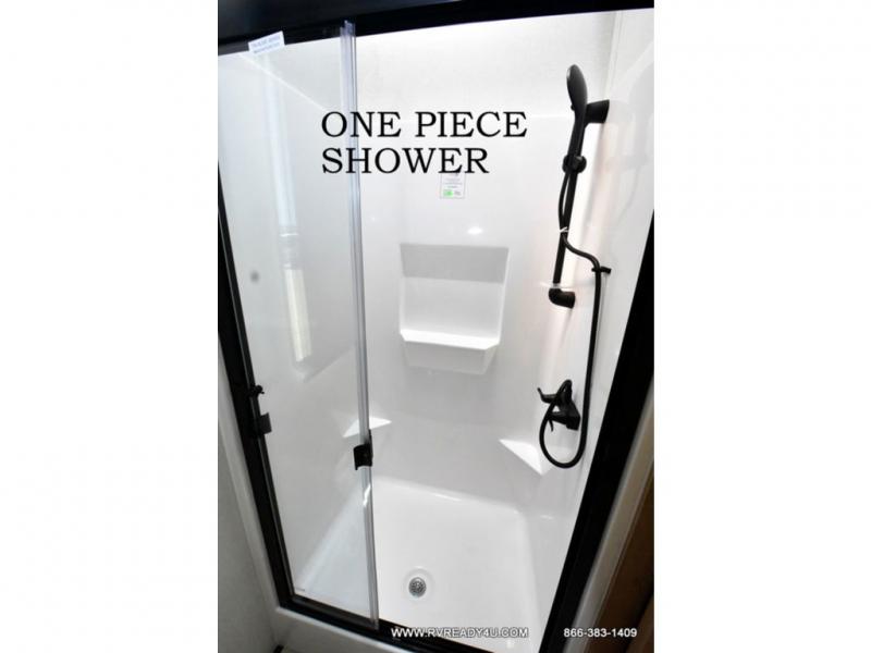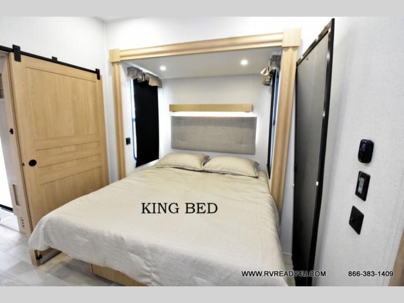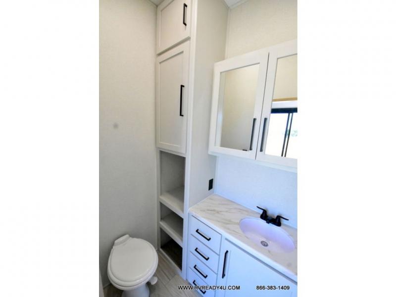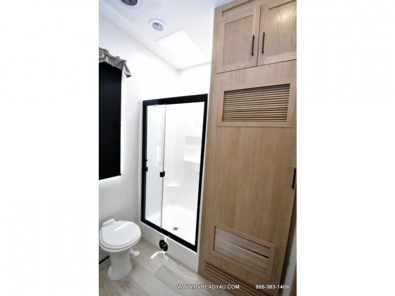 Enjoy extended stays in this triple slide out destination trailer! Once you unload your bags, you can put out the 19' awning with LED lights and relax in your camp chairs. The Chef Collection three burner range will let you make lunch for your crew when you head inside, and there is a free-standing dinette with a bench and two chairs to dine at. After your meal, you can relax on the theater seating across from the entertainment center with a hidden pantry behind it. There is also a front tri-fold hide-a-bed sofa to let guests sleep over. The mid-coach half bath will be easily accessible to use, and the full rear bath will create a master bedroom you are sure to love. There is a king bed slide out here, a dresser with TV prep, and two wardrobes to keep your things tidy!
