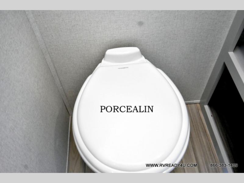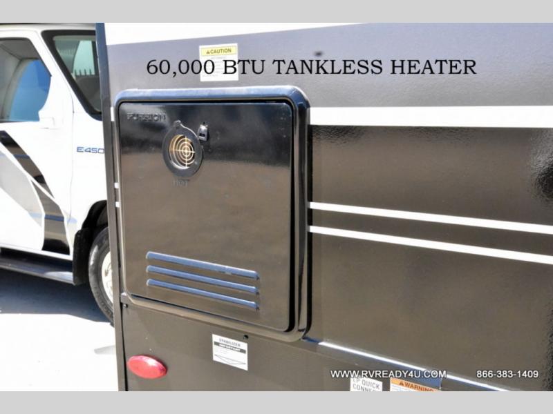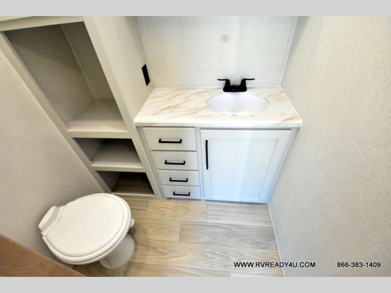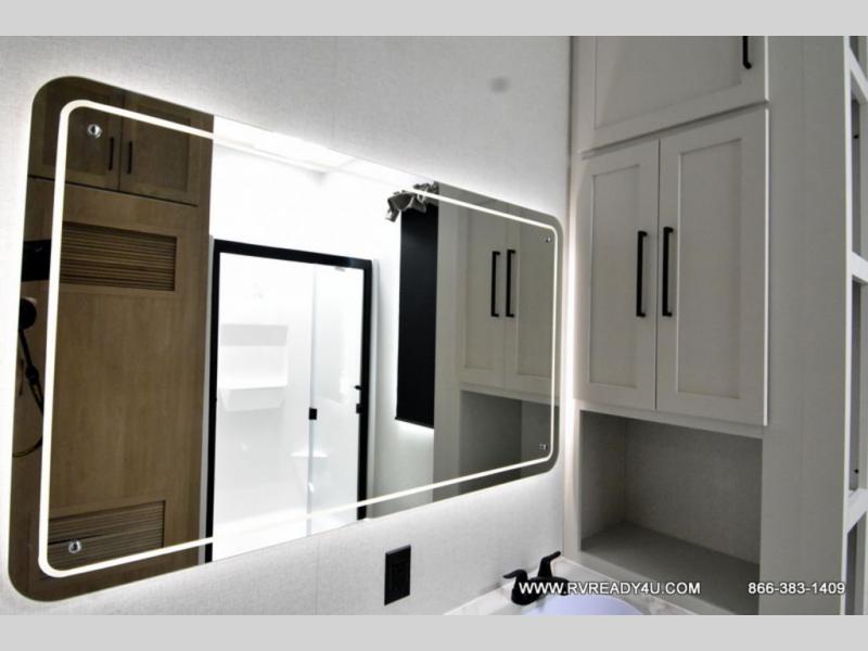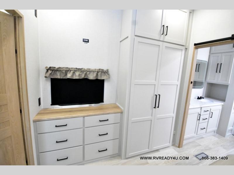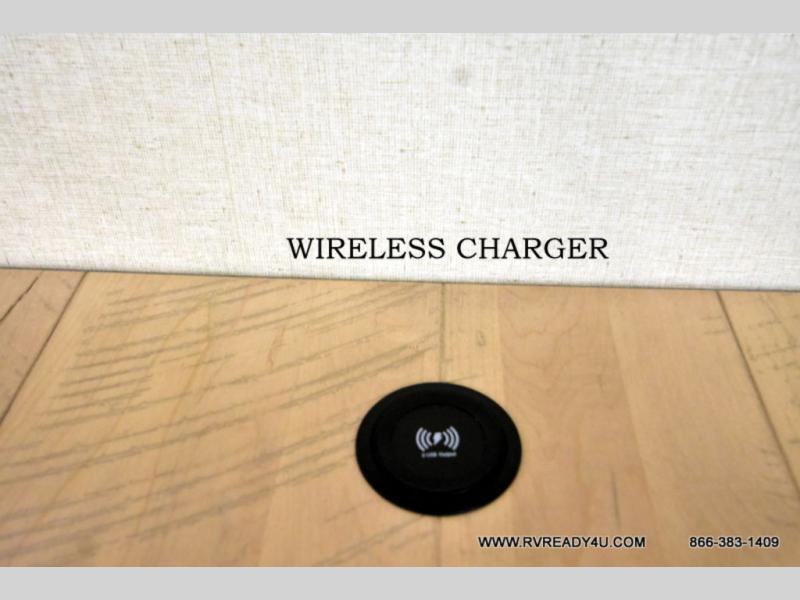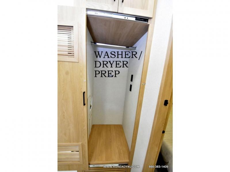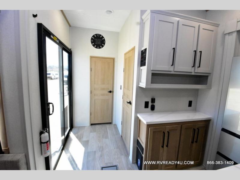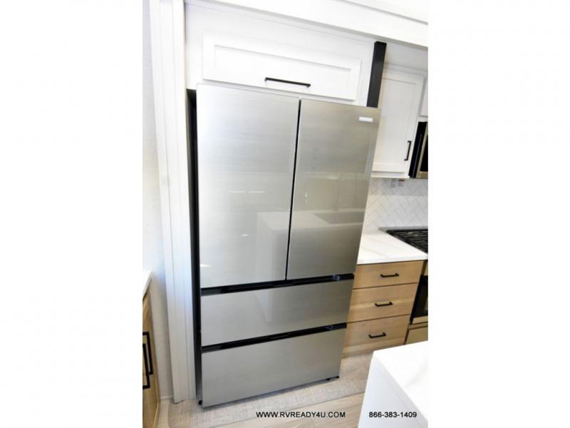 Enjoy extended stays in this triple slide out destination trailer! Once you unload your bags, you can put out the 19' awning with LED lights and relax in your camp chairs. The Chef Collection three burner range will let you make lunch for your crew when you head inside, and there is a free-standing dinette with a bench and two chairs to dine at. After your meal, you can relax on the theater seating across from the entertainment center with a hidden pantry behind it. There is also a front tri-fold hide-a-bed sofa to let guests sleep over. The mid-coach half bath will be easily accessible to use, and the full rear bath will create a master bedroom you are sure to love. There is a king bed slide out here, a dresser with TV prep, and two wardrobes to keep your things tidy!