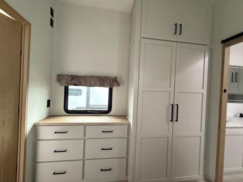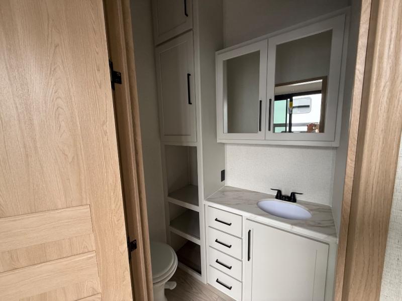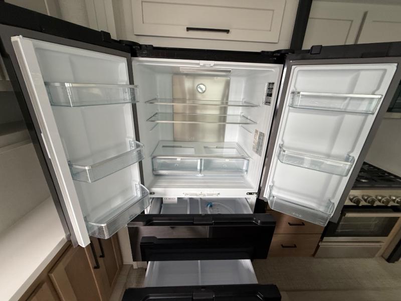 Enjoy extended stays in this triple slide out destination trailer! Once you unload your bags, you can put out the 19' awning with LED lights and relax in your camp chairs. The Chef Collection three burner range will let you make lunch for your crew when you head inside, and there is a free-standing dinette with a bench and two chairs to dine at. After your meal, you can relax on the theater seating across from the entertainment center with a hidden pantry behind it. There is also a front tri-fold hide-a-bed sofa to let guests sleep over. The mid-coach half bath will be easily accessible to use, and the full rear bath will create a master bedroom you are sure to love. There is a king bed slide out here, a dresser with TV prep, and two wardrobes to keep your things tidy!