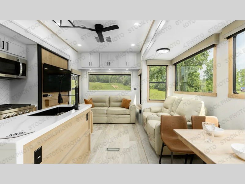 With each Sandpiper Destination Trailer by Forest River you will enjoy many luxurious features, such as crown molding over the kitchen cabinets, solid surface kitchen countertops, a memory foam mattress, plus so much more. The extra large picture windows throughout let natural light in and provide beautiful outdoor views, and each model includes three or more slides for added interior space. You'll find many exterior conveniences, like the porch light with an interior switch, the rain gutters with extra long drip spouts to prevent black streaking, and an electric awning with LED light strip, plus more! You will stay comfortable year around with dual 15,000 A/C units plus each model is constructed with an Underbelly Armor for better protection and insulation!