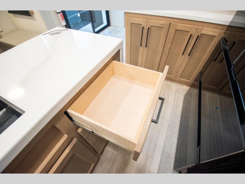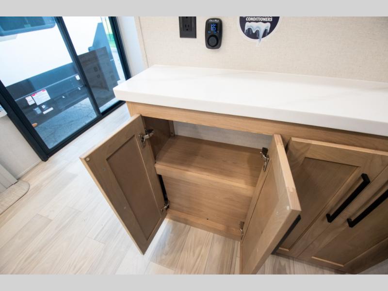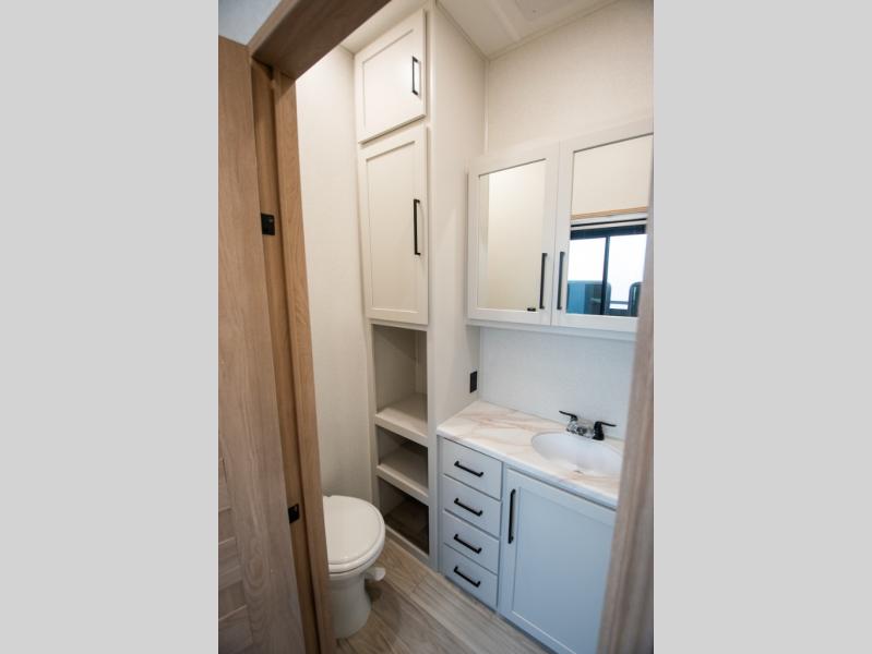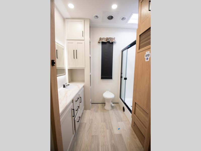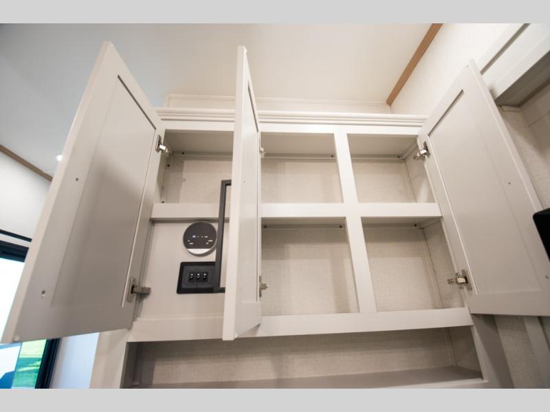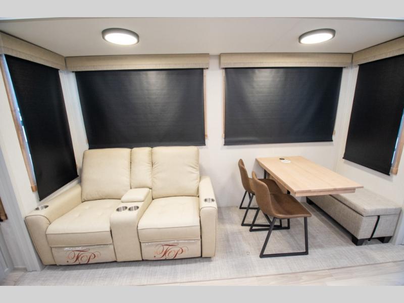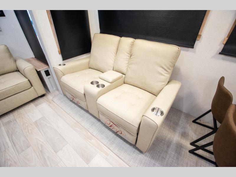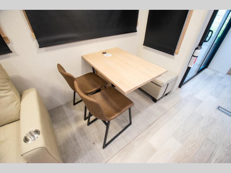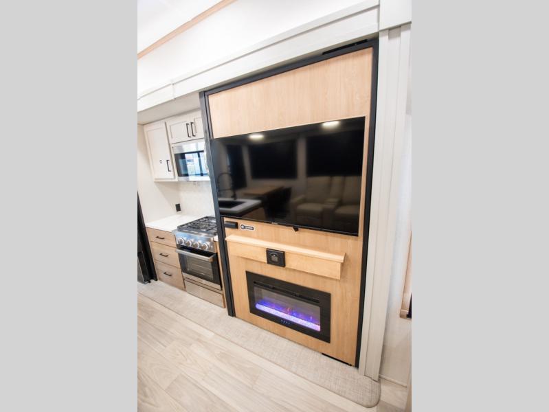 Enjoy extended stays in this triple slide out destination trailer! Once you unload your bags, you can put out the 19' awning with LED lights and relax in your camp chairs. The Chef Collection three burner range will let you make lunch for your crew when you head inside, and there is a free-standing dinette with a bench and two chairs to dine at. After your meal, you can relax on the theater seating across from the entertainment center with a hidden pantry behind it. There is also a front tri-fold hide-a-bed sofa to let guests sleep over. The mid-coach half bath will be easily accessible to use, and the full rear bath will create a master bedroom you are sure to love. There is a king bed slide out here, a dresser with TV prep, and two wardrobes to keep your things tidy!