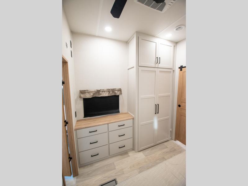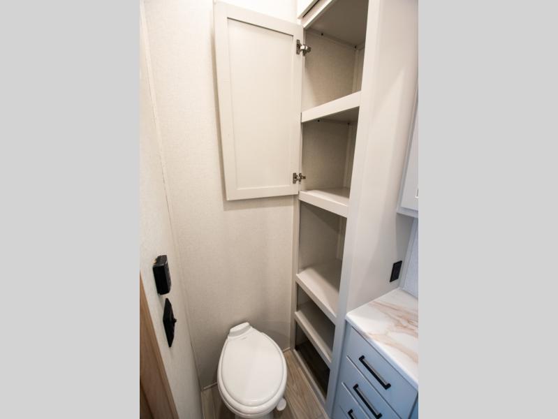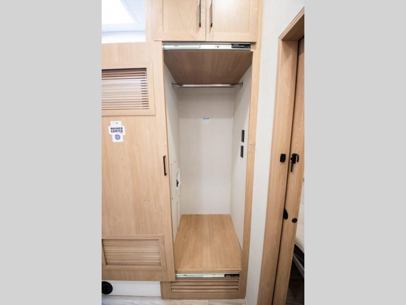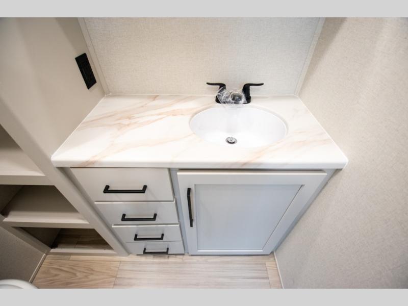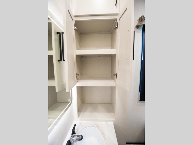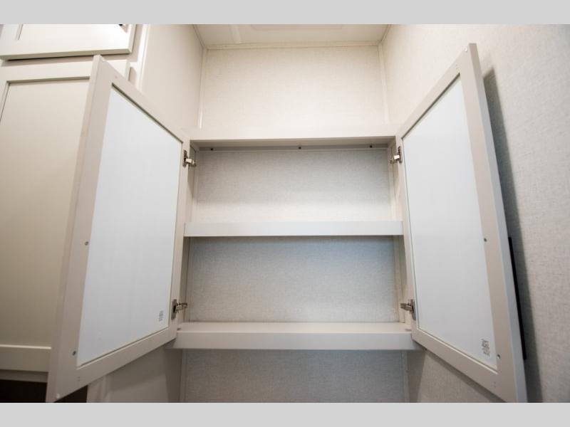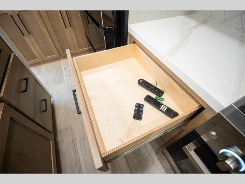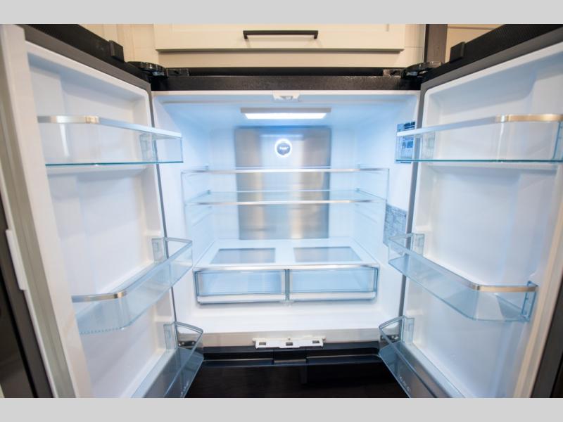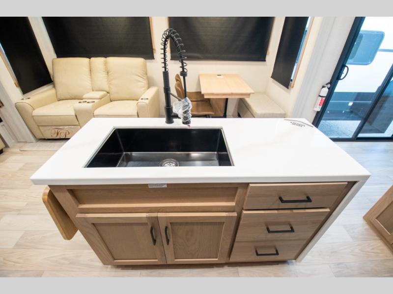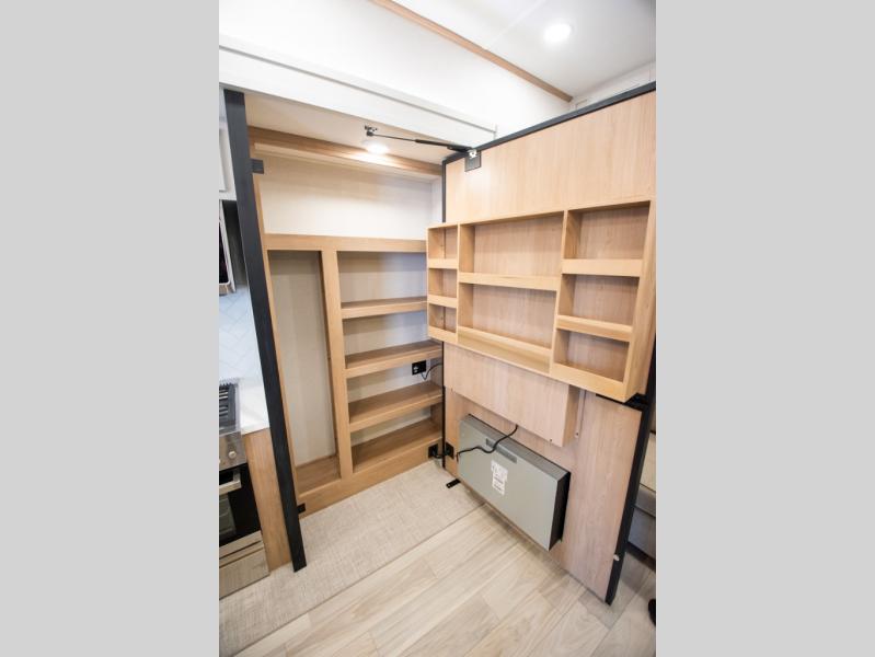 Enjoy extended stays in this triple slide out destination trailer! Once you unload your bags, you can put out the 19' awning with LED lights and relax in your camp chairs. The Chef Collection three burner range will let you make lunch for your crew when you head inside, and there is a free-standing dinette with a bench and two chairs to dine at. After your meal, you can relax on the theater seating across from the entertainment center with a hidden pantry behind it. There is also a front tri-fold hide-a-bed sofa to let guests sleep over. The mid-coach half bath will be easily accessible to use, and the full rear bath will create a master bedroom you are sure to love. There is a king bed slide out here, a dresser with TV prep, and two wardrobes to keep your things tidy!