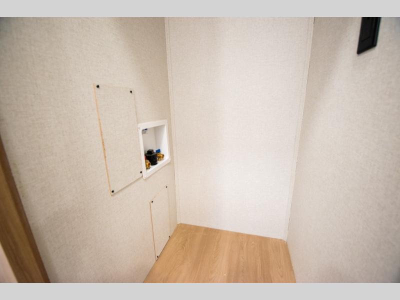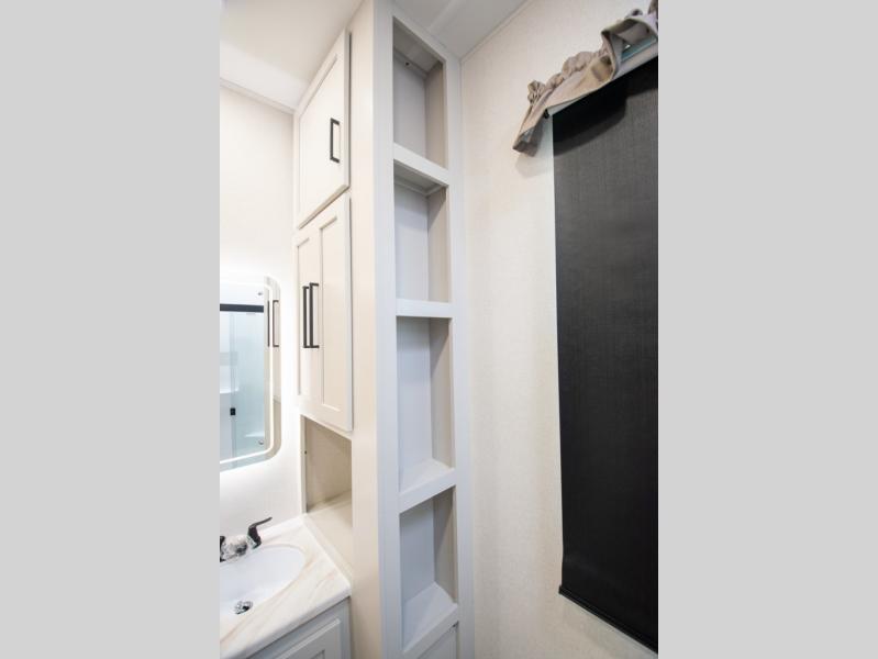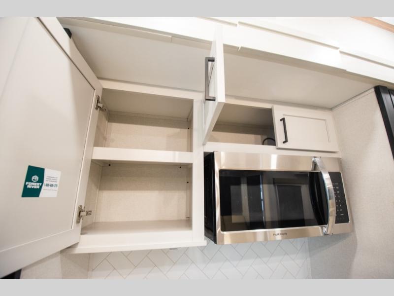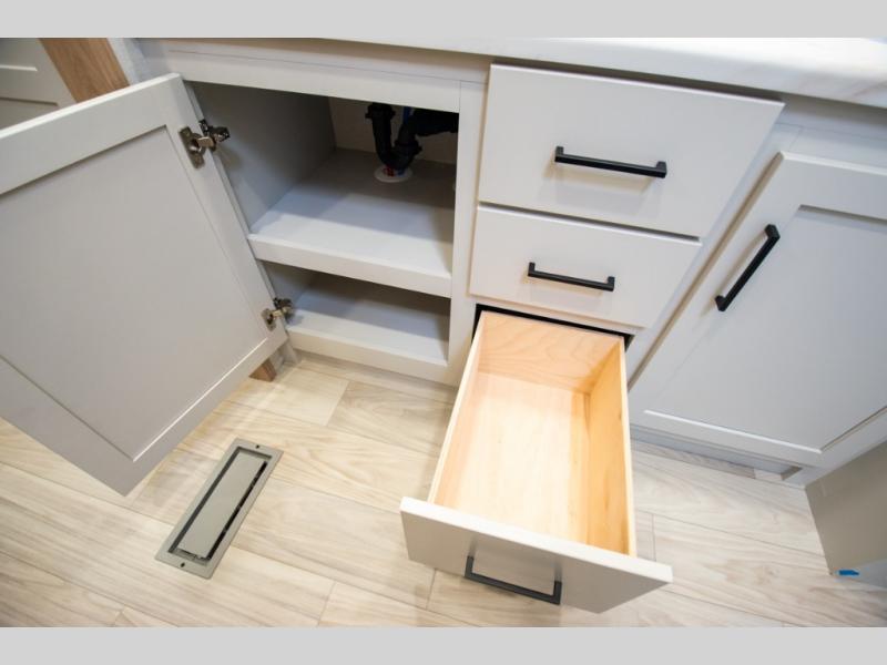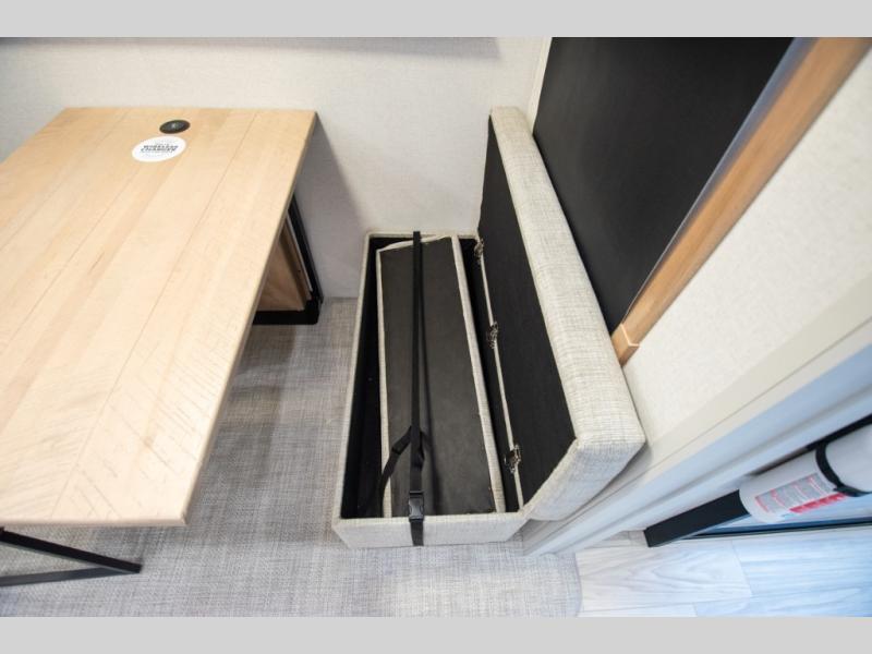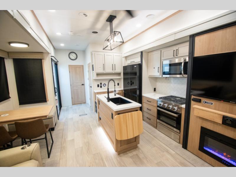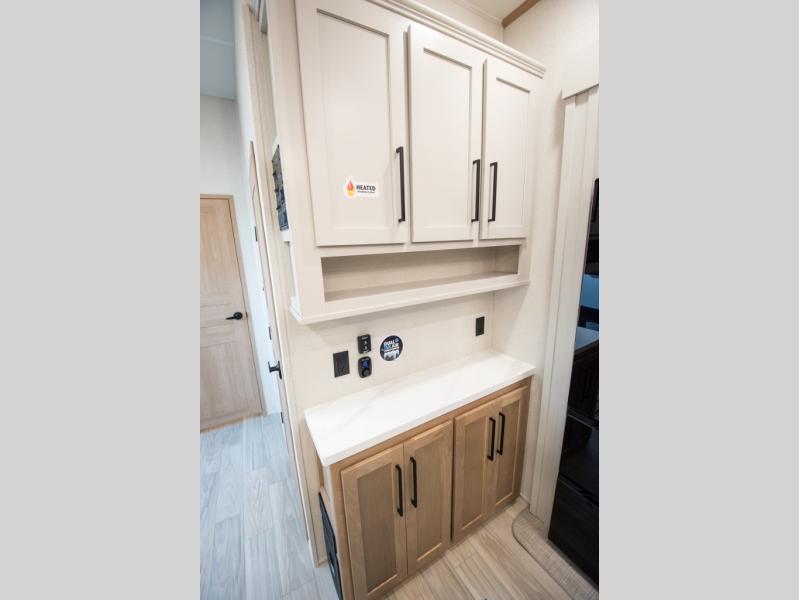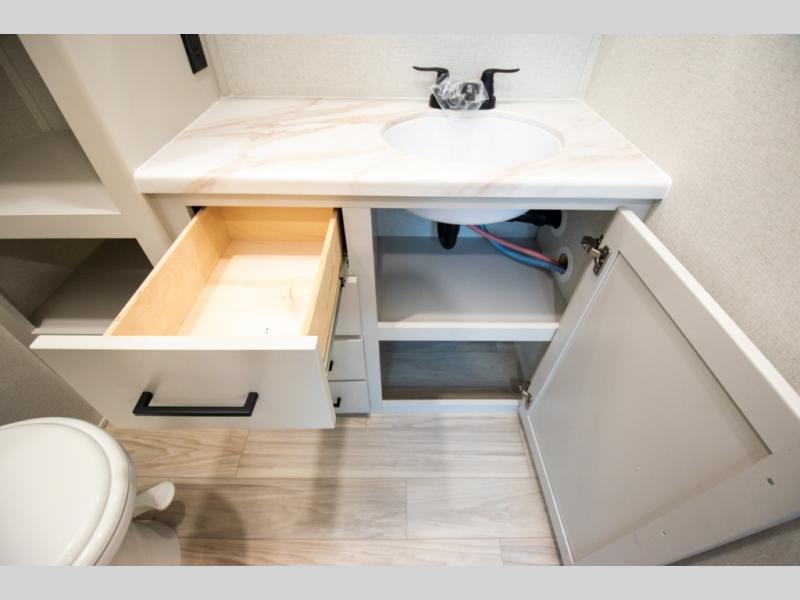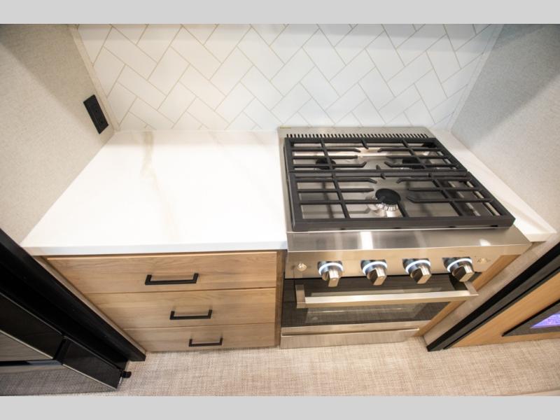 Enjoy extended stays in this triple slide out destination trailer! Once you unload your bags, you can put out the 19' awning with LED lights and relax in your camp chairs. The Chef Collection three burner range will let you make lunch for your crew when you head inside, and there is a free-standing dinette with a bench and two chairs to dine at. After your meal, you can relax on the theater seating across from the entertainment center with a hidden pantry behind it. There is also a front tri-fold hide-a-bed sofa to let guests sleep over. The mid-coach half bath will be easily accessible to use, and the full rear bath will create a master bedroom you are sure to love. There is a king bed slide out here, a dresser with TV prep, and two wardrobes to keep your things tidy!