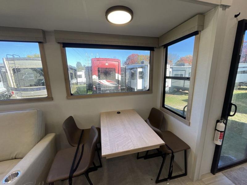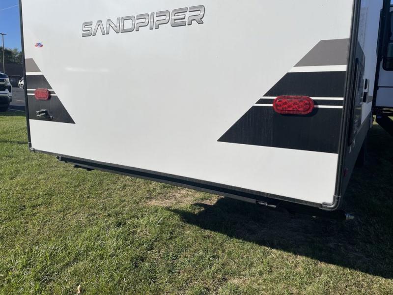 With each Sandpiper Destination Trailer by Forest River you will enjoy many luxurious features, such as crown molding over the kitchen cabinets, solid surface kitchen countertops, a memory foam mattress, plus so much more. The extra large picture windows throughout let natural light in and provide beautiful outdoor views, and each model includes three or more slides for added interior space. You'll find many exterior conveniences, like the porch light with an interior switch, the rain gutters with extra long drip spouts to prevent black streaking, and an electric awning with LED light strip, plus more! You will stay comfortable year around with dual 15,000 A/C units plus each model is constructed with an Underbelly Armor for better protection and insulation!