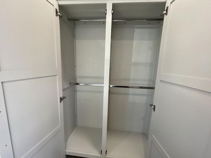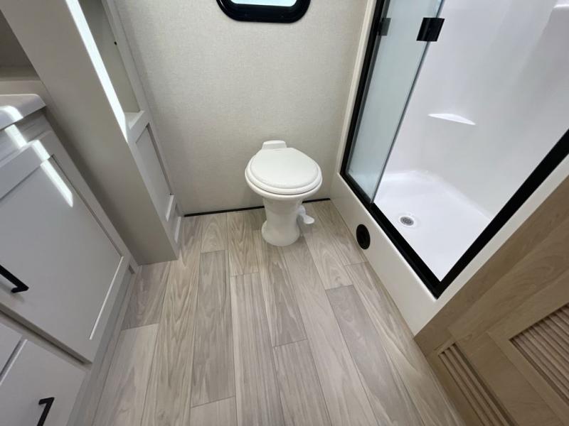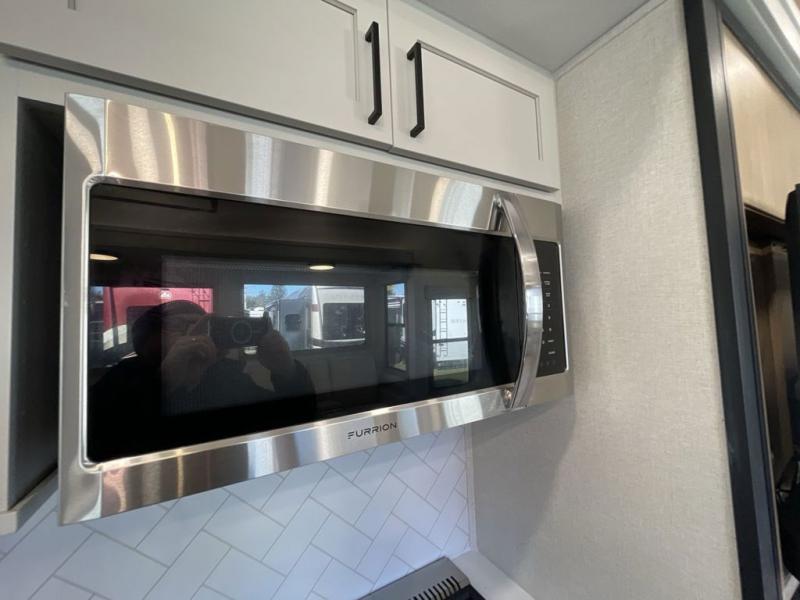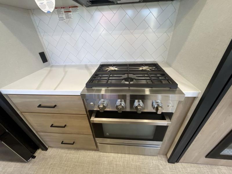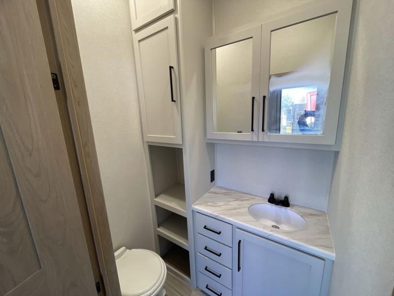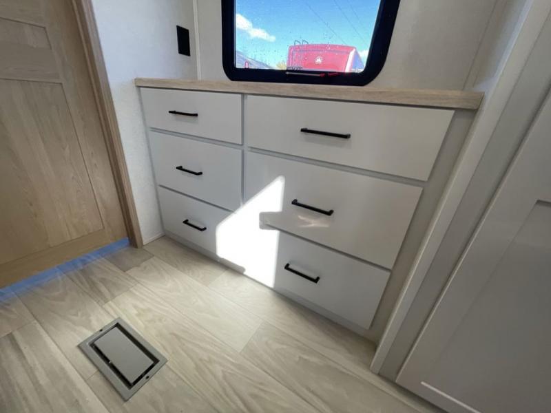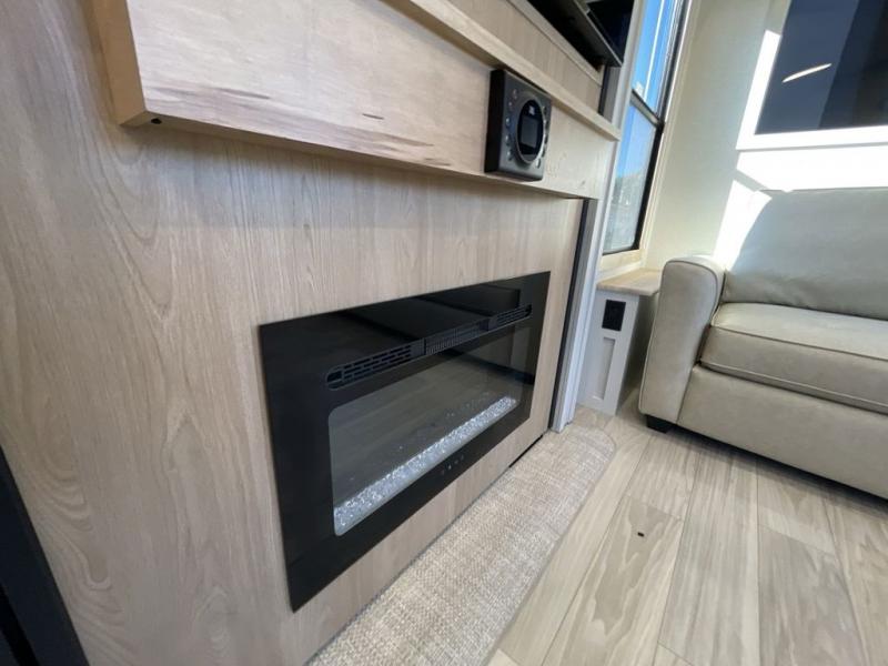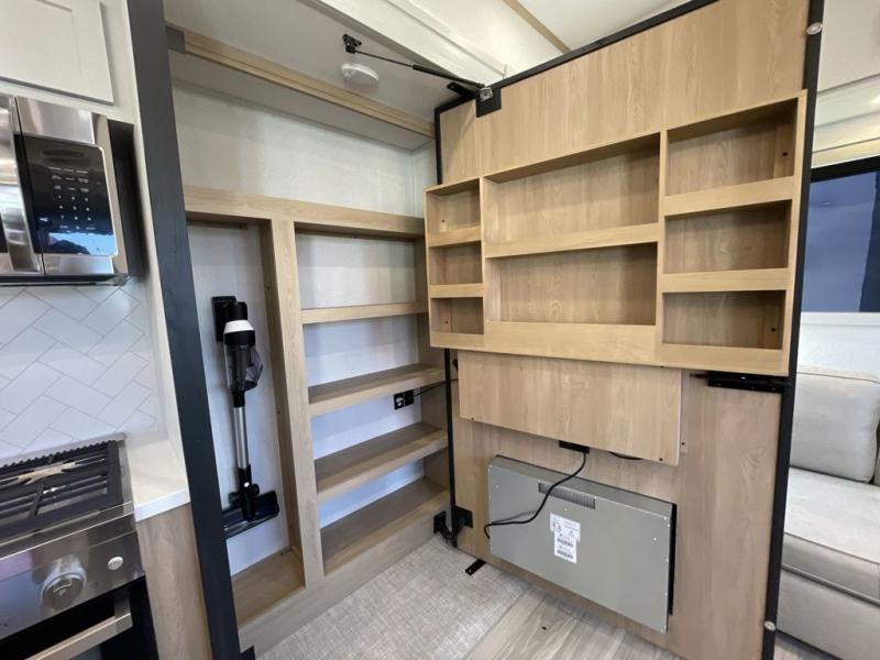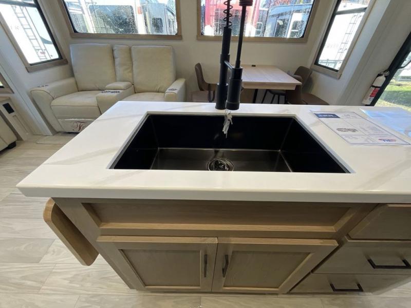 Enjoy extended stays in this triple slide out destination trailer! Once you unload your bags, you can put out the 19' awning with LED lights and relax in your camp chairs. The Chef Collection three burner range will let you make lunch for your crew when you head inside, and there is a free-standing dinette with a bench and two chairs to dine at. After your meal, you can relax on the theater seating across from the entertainment center with a hidden pantry behind it. There is also a front tri-fold hide-a-bed sofa to let guests sleep over. The mid-coach half bath will be easily accessible to use, and the full rear bath will create a master bedroom you are sure to love. There is a king bed slide out here, a dresser with TV prep, and two wardrobes to keep your things tidy!