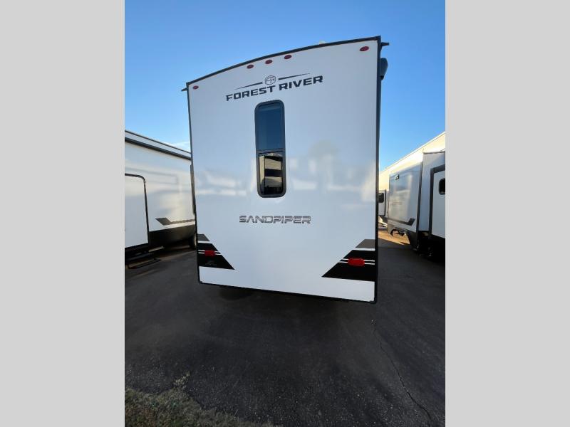 With each Sandpiper Destination Trailer by Forest River you will enjoy many luxurious features, such as crown molding over the kitchen cabinets, solid surface kitchen countertops, a memory foam mattress, plus so much more. The extra large picture windows throughout let natural light in and provide beautiful outdoor views, and each model includes three or more slides for added interior space. You'll find many exterior conveniences, like the porch light with an interior switch, the rain gutters with extra long drip spouts to prevent black streaking, and an electric awning with LED light strip, plus more! You will stay comfortable year around with dual 15,000 A/C units plus each model is constructed with an Underbelly Armor for better protection and insulation!