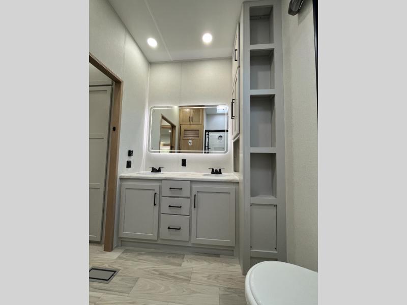 Enjoy extended stays in this triple slide out destination trailer! Once you unload your bags, you can put out the 19' awning with LED lights and relax in your camp chairs. The Chef Collection three burner range will let you make lunch for your crew when you head inside, and there is a free-standing dinette with a bench and two chairs to dine at. After your meal, you can relax on the theater seating across from the entertainment center with a hidden pantry behind it. There is also a front tri-fold hide-a-bed sofa to let guests sleep over. The mid-coach half bath will be easily accessible to use, and the full rear bath will create a master bedroom you are sure to love. There is a king bed slide out here, a dresser with TV prep, and two wardrobes to keep your things tidy!