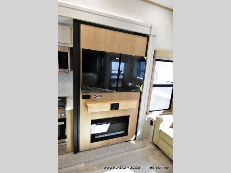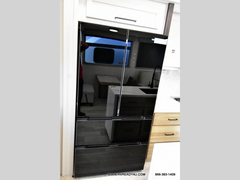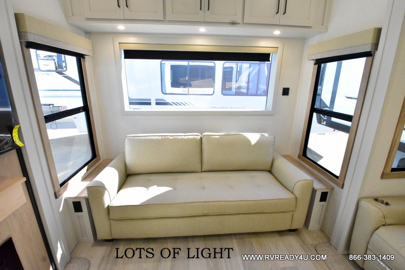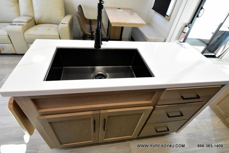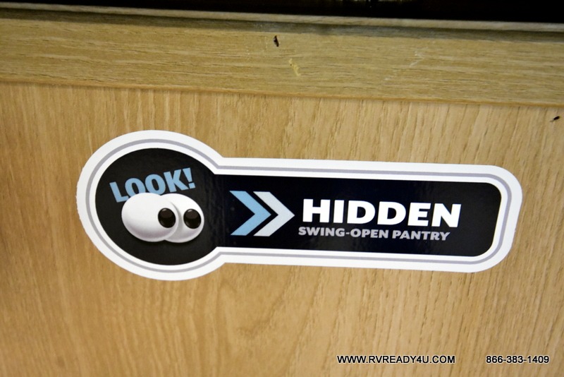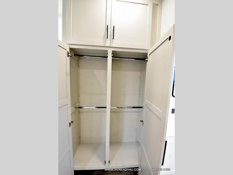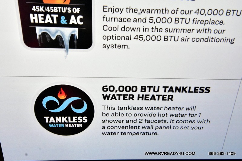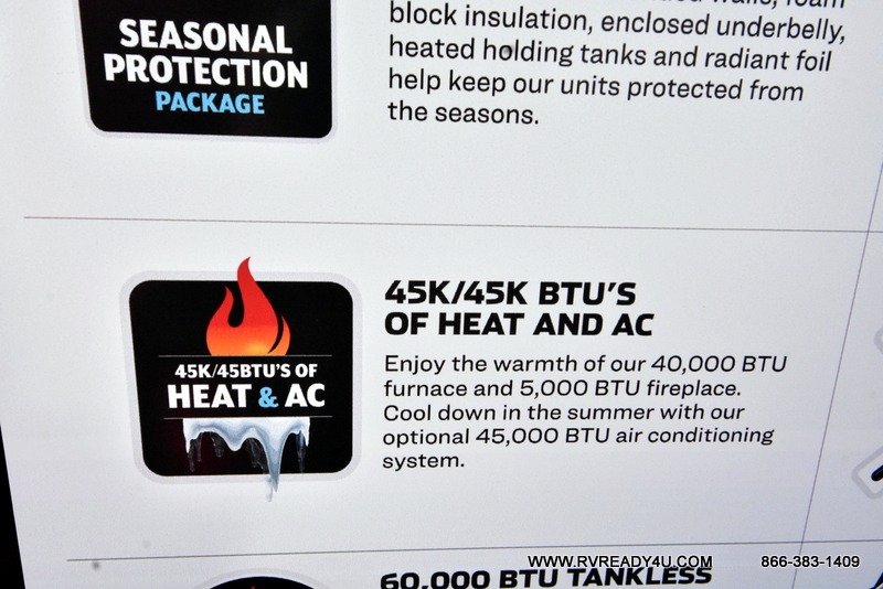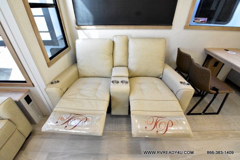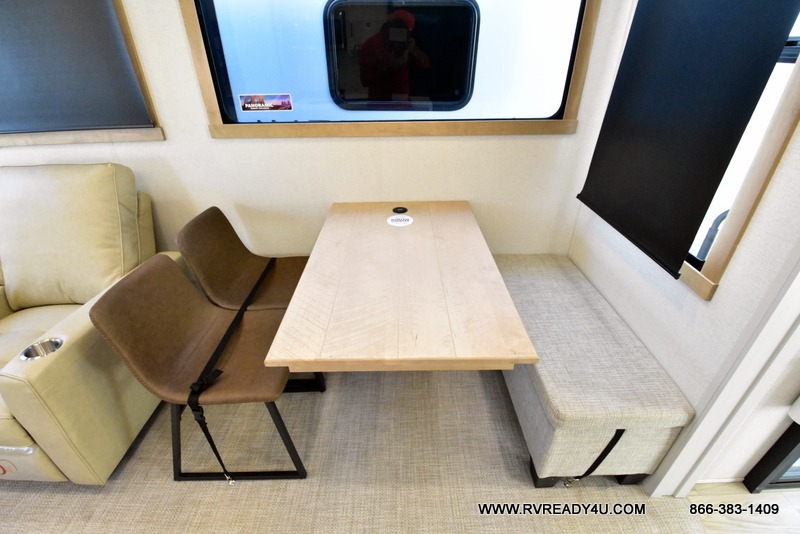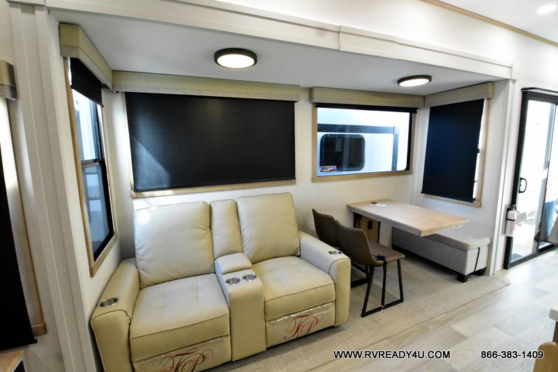 Enjoy extended stays in this triple slide out destination trailer! Once you unload your bags, you can put out the 19' awning with LED lights and relax in your camp chairs. The Chef Collection three burner range will let you make lunch for your crew when you head inside, and there is a free-standing dinette with a bench and two chairs to dine at. After your meal, you can relax on the theater seating across from the entertainment center with a hidden pantry behind it. There is also a front tri-fold hide-a-bed sofa to let guests sleep over. The mid-coach half bath will be easily accessible to use, and the full rear bath will create a master bedroom you are sure to love. There is a king bed slide out here, a dresser with TV prep, and two wardrobes to keep your things tidy!