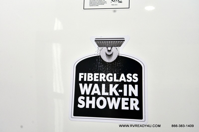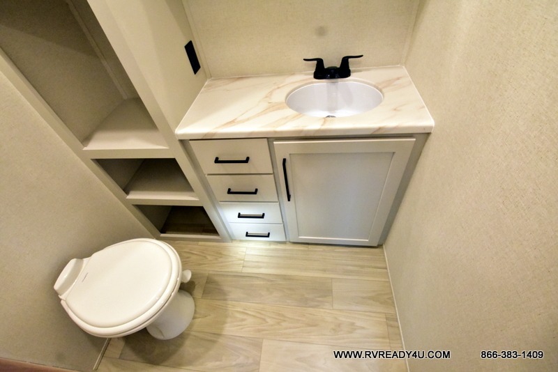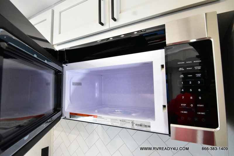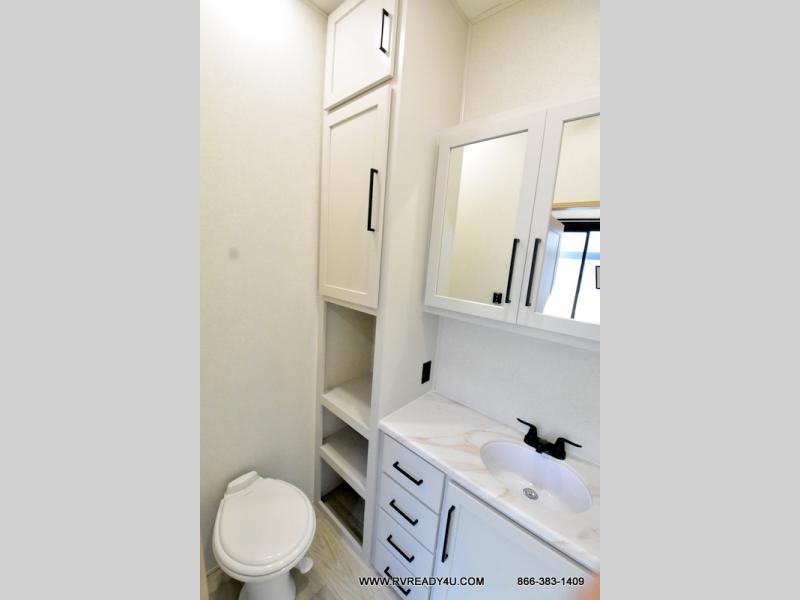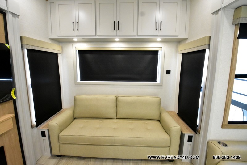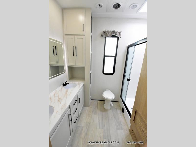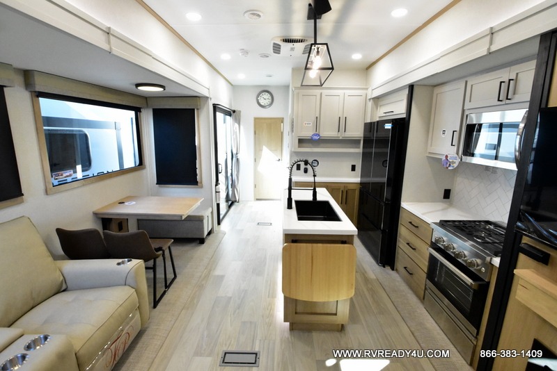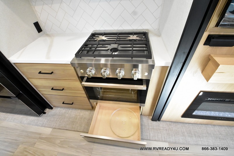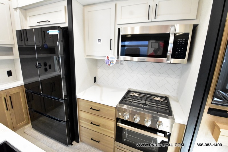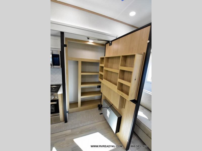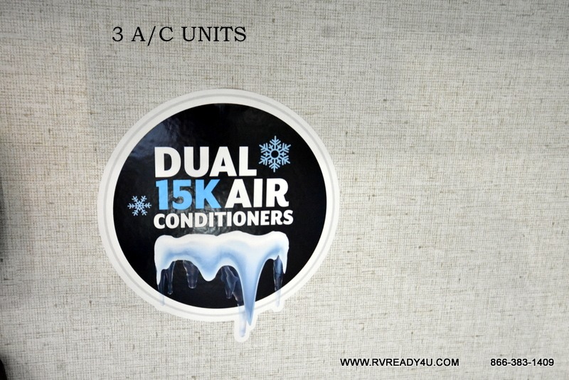 Enjoy extended stays in this triple slide out destination trailer! Once you unload your bags, you can put out the 19' awning with LED lights and relax in your camp chairs. The Chef Collection three burner range will let you make lunch for your crew when you head inside, and there is a free-standing dinette with a bench and two chairs to dine at. After your meal, you can relax on the theater seating across from the entertainment center with a hidden pantry behind it. There is also a front tri-fold hide-a-bed sofa to let guests sleep over. The mid-coach half bath will be easily accessible to use, and the full rear bath will create a master bedroom you are sure to love. There is a king bed slide out here, a dresser with TV prep, and two wardrobes to keep your things tidy!