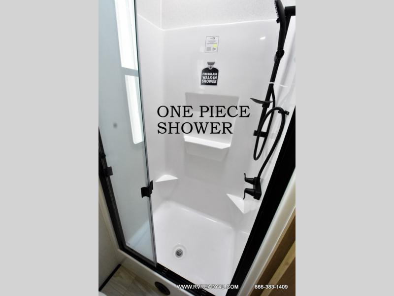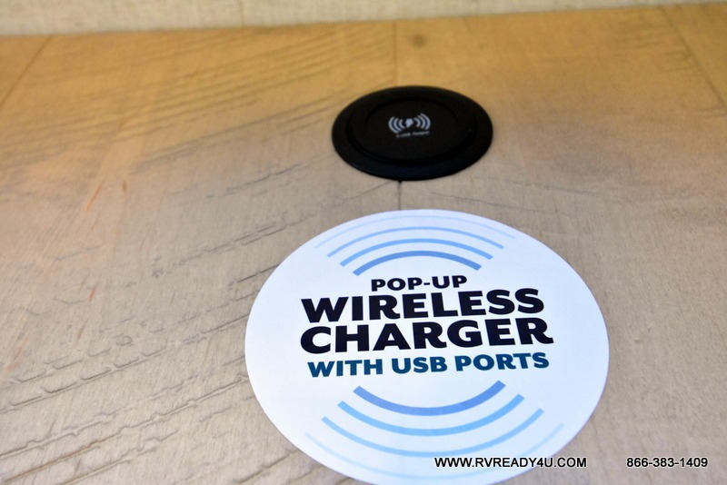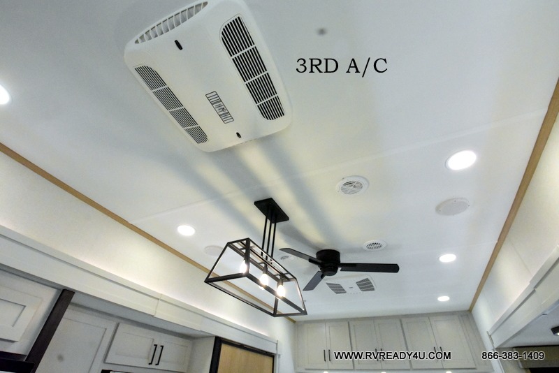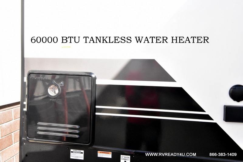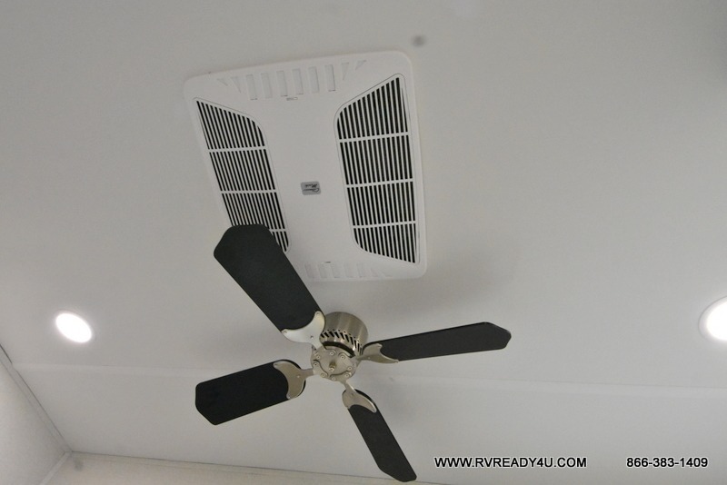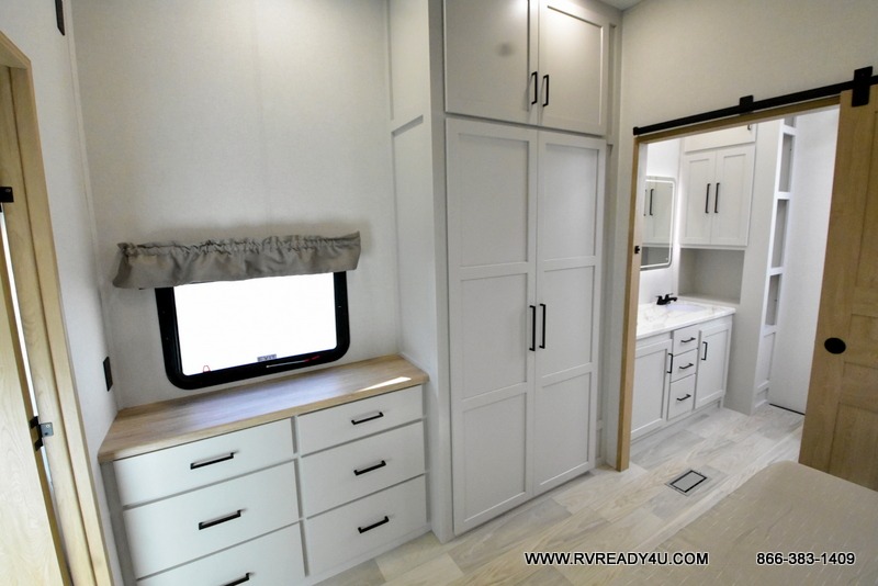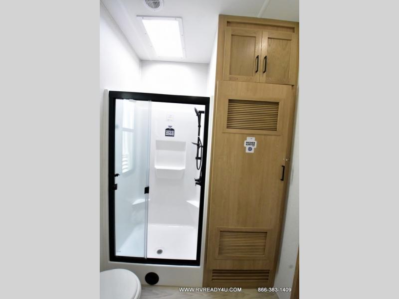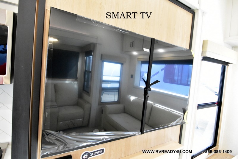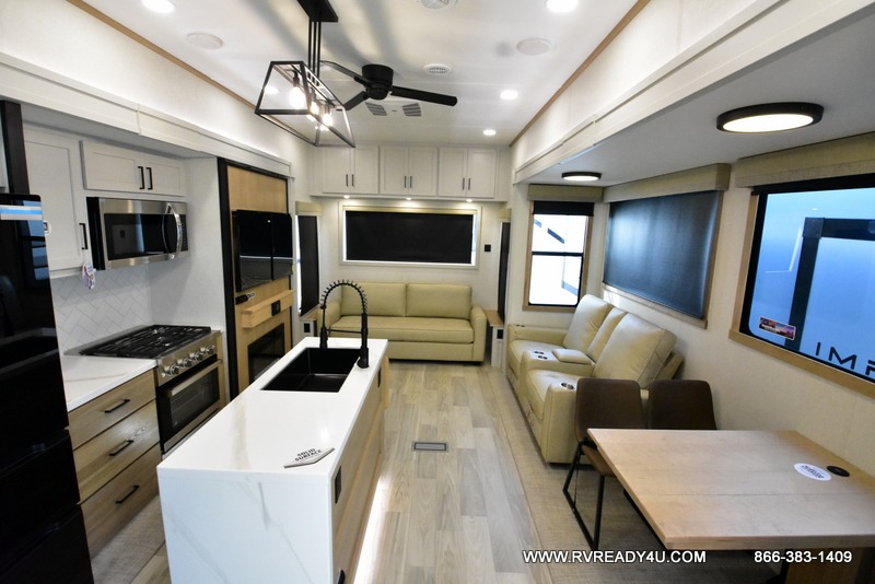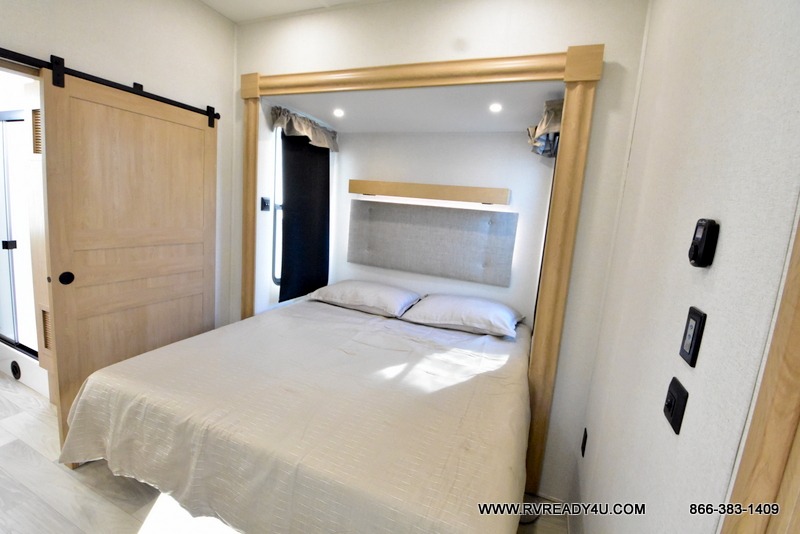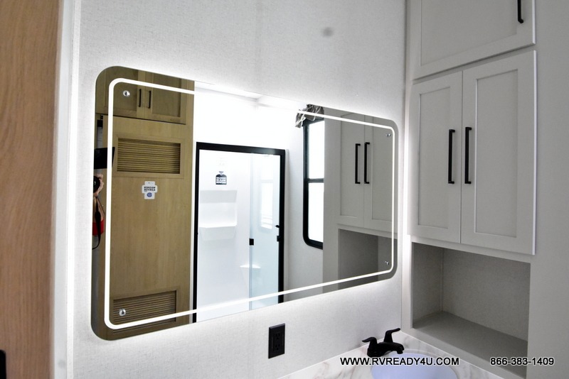 Enjoy extended stays in this triple slide out destination trailer! Once you unload your bags, you can put out the 19' awning with LED lights and relax in your camp chairs. The Chef Collection three burner range will let you make lunch for your crew when you head inside, and there is a free-standing dinette with a bench and two chairs to dine at. After your meal, you can relax on the theater seating across from the entertainment center with a hidden pantry behind it. There is also a front tri-fold hide-a-bed sofa to let guests sleep over. The mid-coach half bath will be easily accessible to use, and the full rear bath will create a master bedroom you are sure to love. There is a king bed slide out here, a dresser with TV prep, and two wardrobes to keep your things tidy!