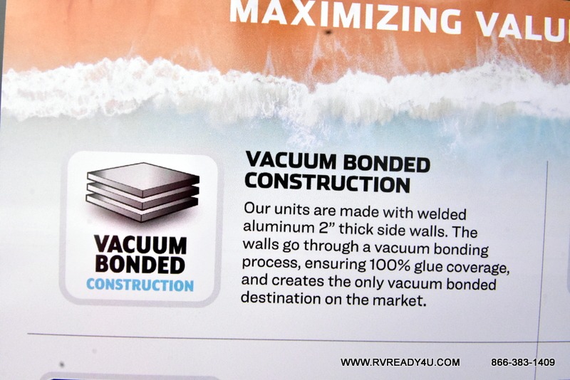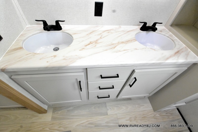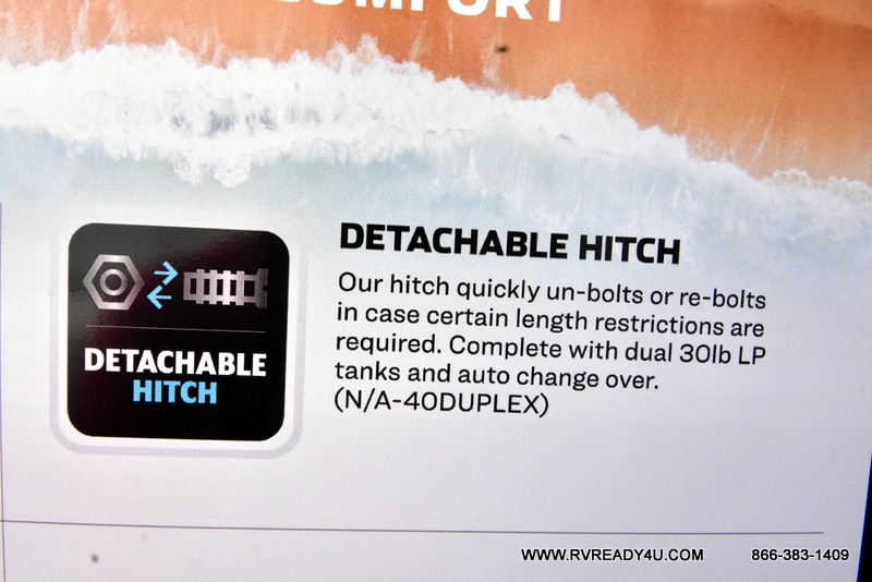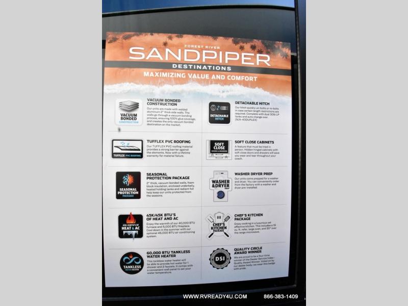 With each Sandpiper Destination Trailer by Forest River you will enjoy many luxurious features, such as crown molding over the kitchen cabinets, solid surface kitchen countertops, a memory foam mattress, plus so much more. The extra large picture windows throughout let natural light in and provide beautiful outdoor views, and each model includes three or more slides for added interior space. You'll find many exterior conveniences, like the porch light with an interior switch, the rain gutters with extra long drip spouts to prevent black streaking, and an electric awning with LED light strip, plus more! You will stay comfortable year around with dual 15,000 A/C units plus each model is constructed with an Underbelly Armor for better protection and insulation!