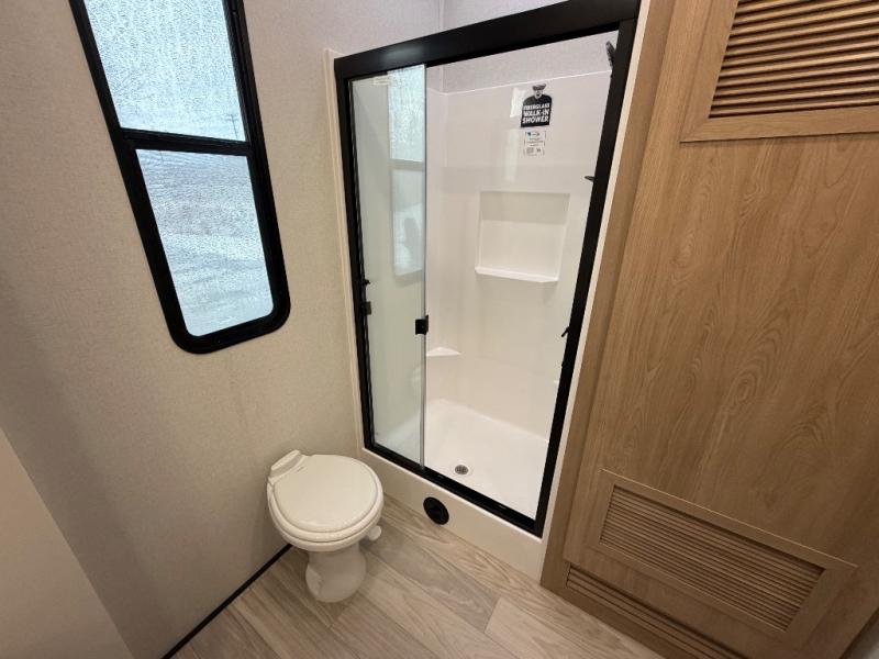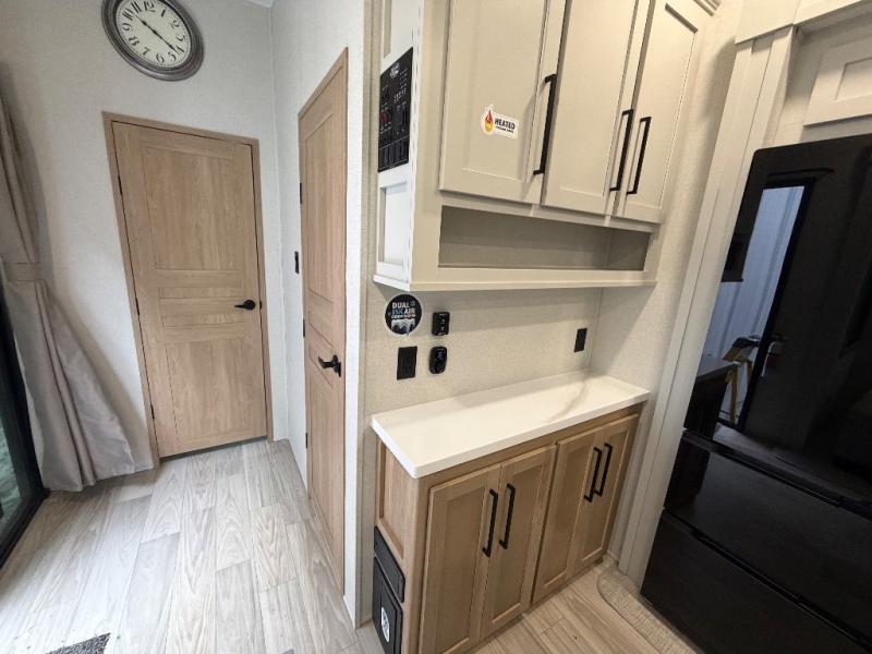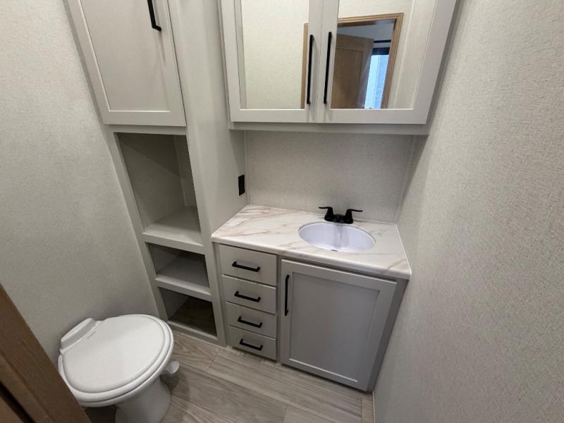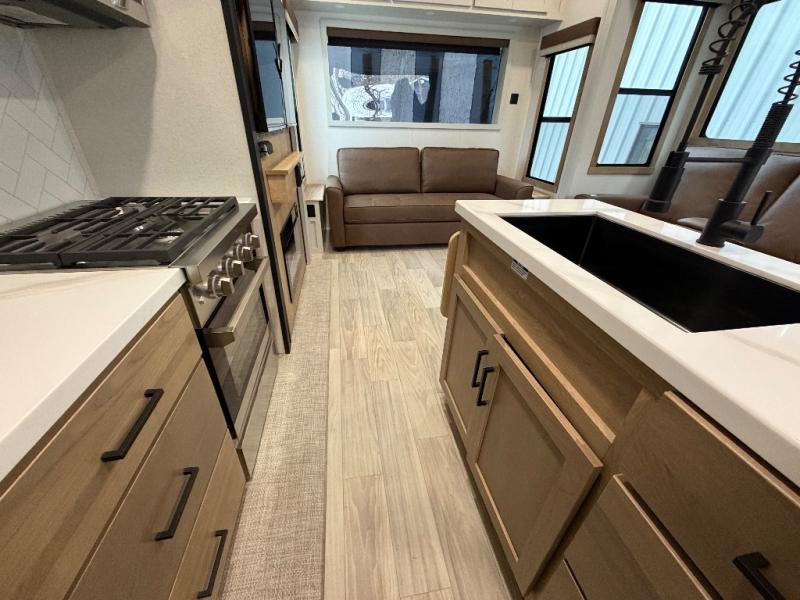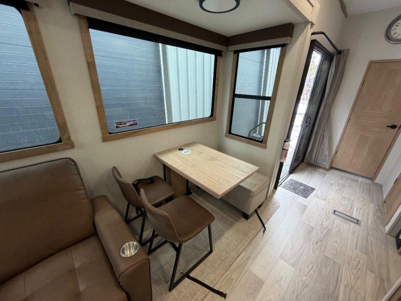 Enjoy extended stays in this triple slide out destination trailer! Once you unload your bags, you can put out the 19' awning with LED lights and relax in your camp chairs. The Chef Collection three burner range will let you make lunch for your crew when you head inside, and there is a free-standing dinette with a bench and two chairs to dine at. After your meal, you can relax on the theater seating across from the entertainment center with a hidden pantry behind it. There is also a front tri-fold hide-a-bed sofa to let guests sleep over. The mid-coach half bath will be easily accessible to use, and the full rear bath will create a master bedroom you are sure to love. There is a king bed slide out here, a dresser with TV prep, and two wardrobes to keep your things tidy!