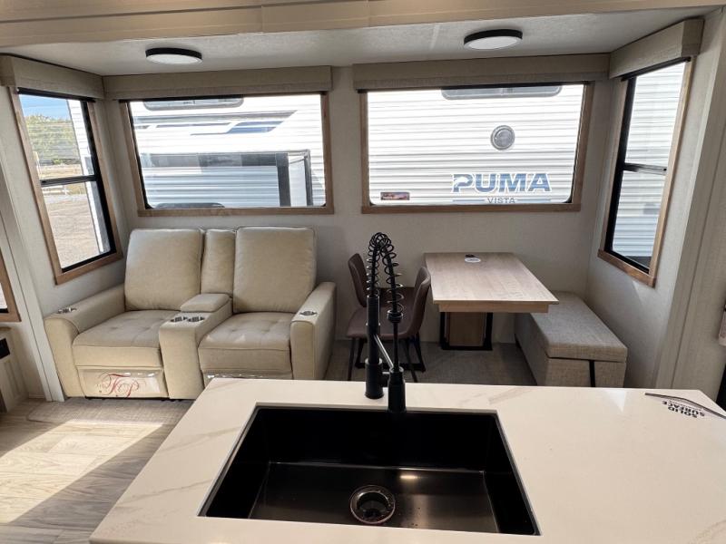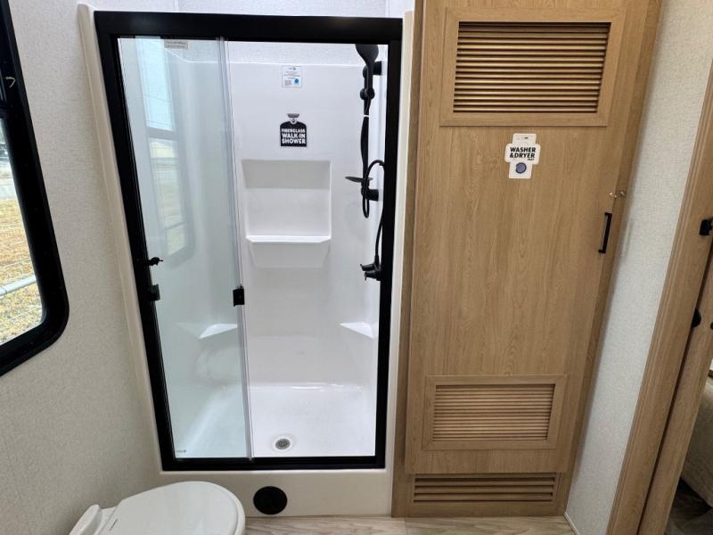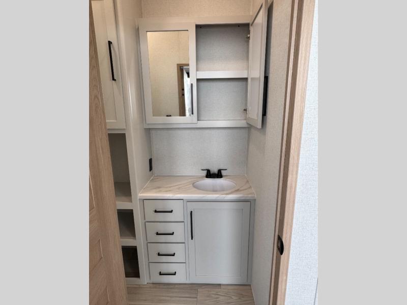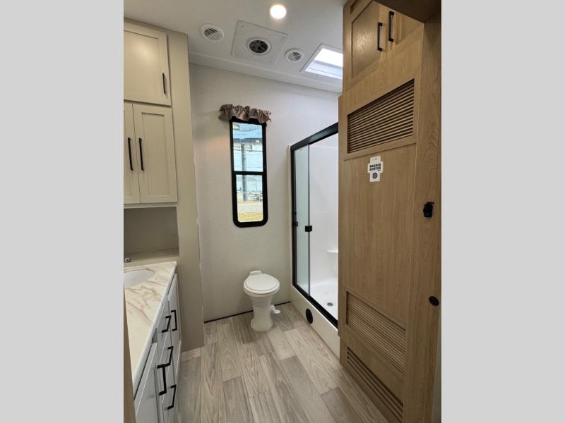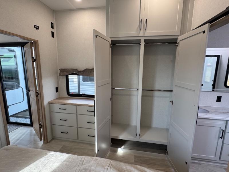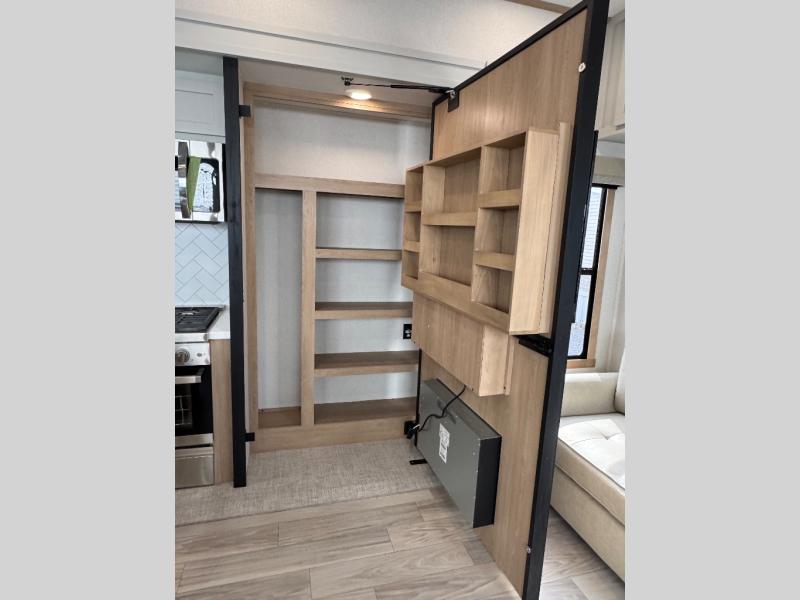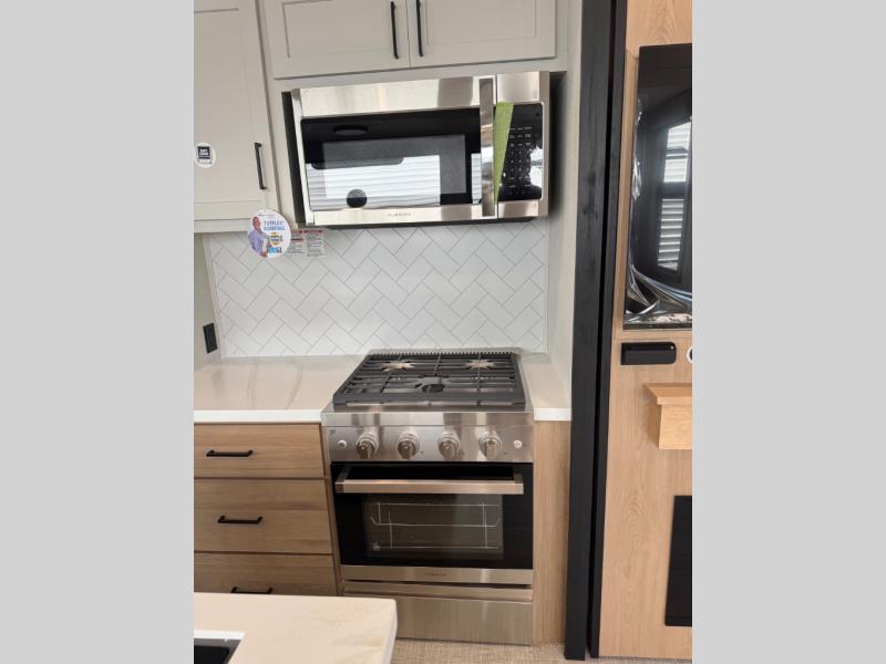 Enjoy extended stays in this triple slide out destination trailer! Once you unload your bags, you can put out the 19' awning with LED lights and relax in your camp chairs. The Chef Collection three burner range will let you make lunch for your crew when you head inside, and there is a free-standing dinette with a bench and two chairs to dine at. After your meal, you can relax on the theater seating across from the entertainment center with a hidden pantry behind it. There is also a front tri-fold hide-a-bed sofa to let guests sleep over. The mid-coach half bath will be easily accessible to use, and the full rear bath will create a master bedroom you are sure to love. There is a king bed slide out here, a dresser with TV prep, and two wardrobes to keep your things tidy!