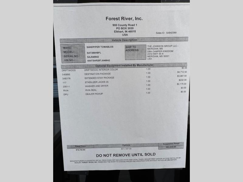 With each Sandpiper Destination Trailer by Forest River you will enjoy many luxurious features, such as crown molding over the kitchen cabinets, solid surface kitchen countertops, a memory foam mattress, plus so much more. The extra large picture windows throughout let natural light in and provide beautiful outdoor views, and each model includes three or more slides for added interior space. You'll find many exterior conveniences, like the porch light with an interior switch, the rain gutters with extra long drip spouts to prevent black streaking, and an electric awning with LED light strip, plus more! You will stay comfortable year around with dual 15,000 A/C units plus each model is constructed with an Underbelly Armor for better protection and insulation!