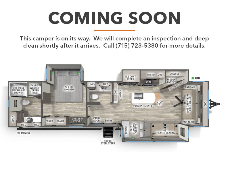 Enjoy extended stays in this triple slide out destination trailer! Once you unload your bags, you can put out the 19' awning with LED lights and relax in your camp chairs. The Chef Collection three burner range will let you make lunch for your crew when you head inside, and there is a free-standing dinette with a bench and two chairs to dine at. After your meal, you can relax on the theater seating across from the entertainment center with a hidden pantry behind it. There is also a front tri-fold hide-a-bed sofa to let guests sleep over. The mid-coach half bath will be easily accessible to use, and the full rear bath will create a master bedroom you are sure to love. There is a king bed slide out here, a dresser with TV prep, and two wardrobes to keep your things tidy!