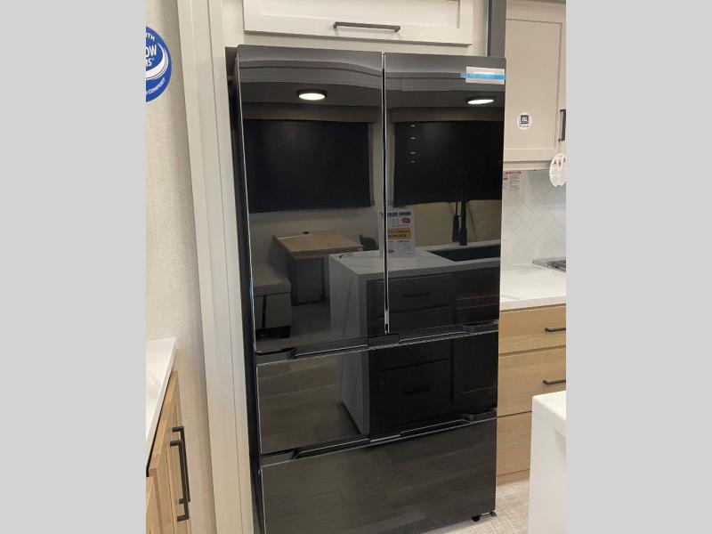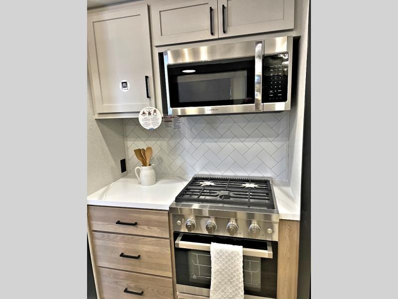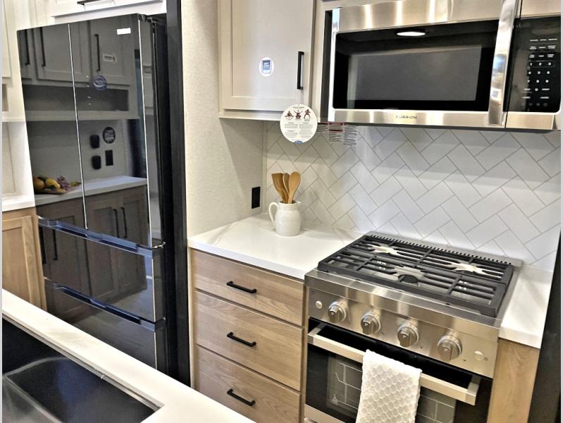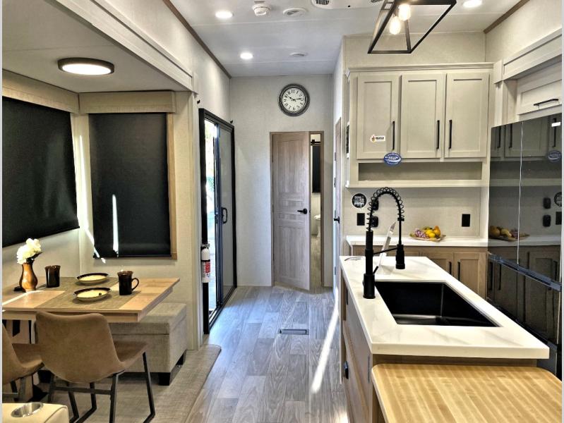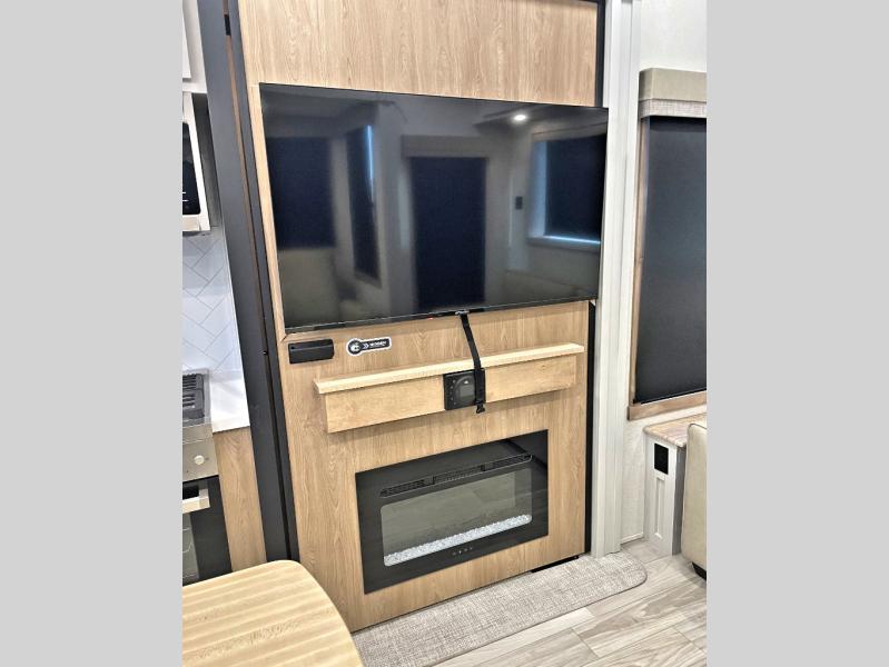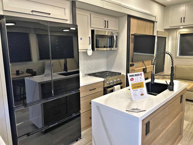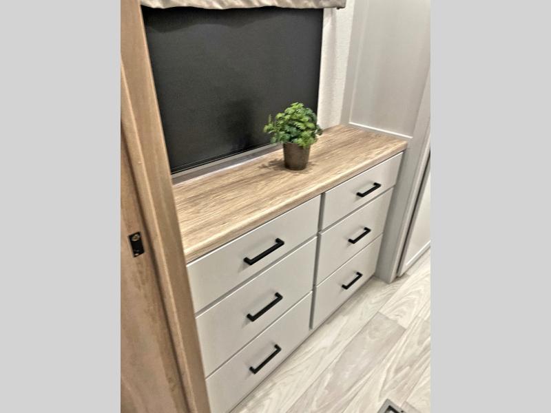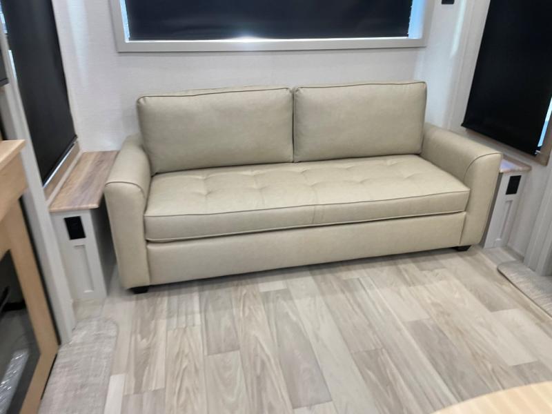 Enjoy extended stays in this triple slide out destination trailer! Once you unload your bags, you can put out the 19' awning with LED lights and relax in your camp chairs. The Chef Collection three burner range will let you make lunch for your crew when you head inside, and there is a free-standing dinette with a bench and two chairs to dine at. After your meal, you can relax on the theater seating across from the entertainment center with a hidden pantry behind it. There is also a front tri-fold hide-a-bed sofa to let guests sleep over. The mid-coach half bath will be easily accessible to use, and the full rear bath will create a master bedroom you are sure to love. There is a king bed slide out here, a dresser with TV prep, and two wardrobes to keep your things tidy!