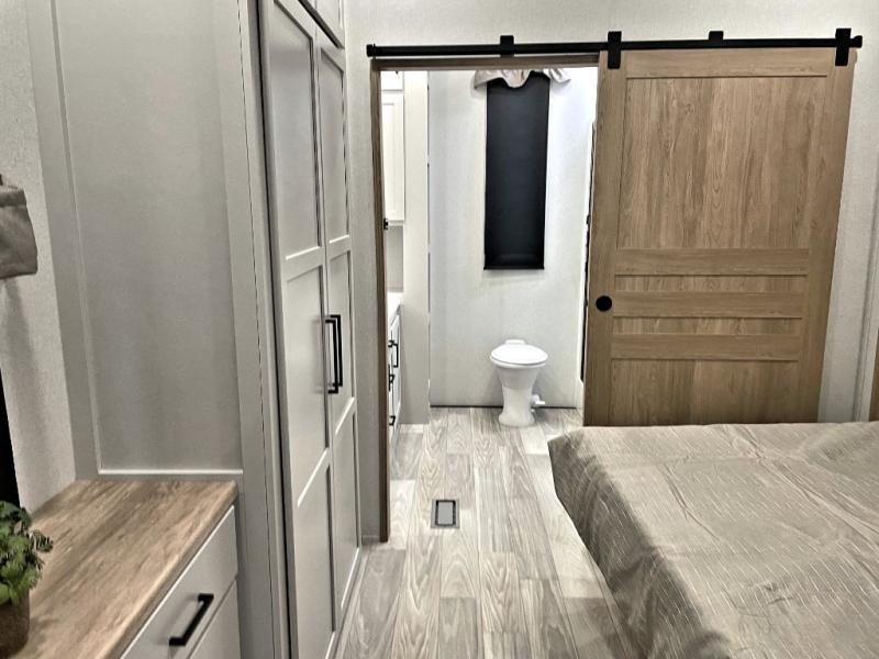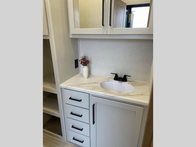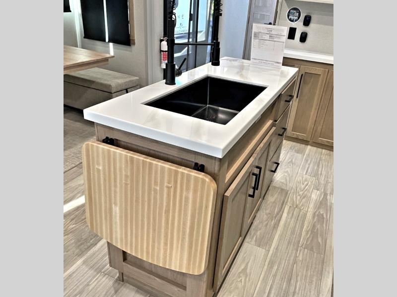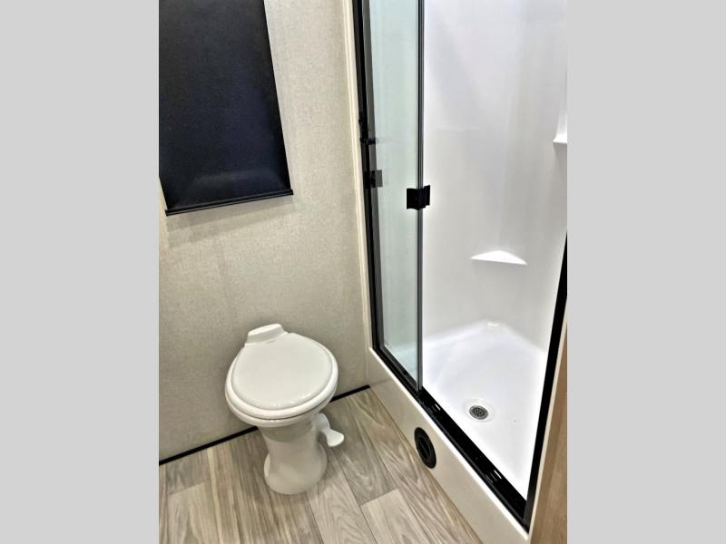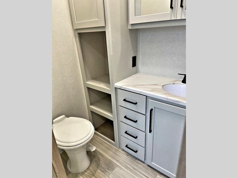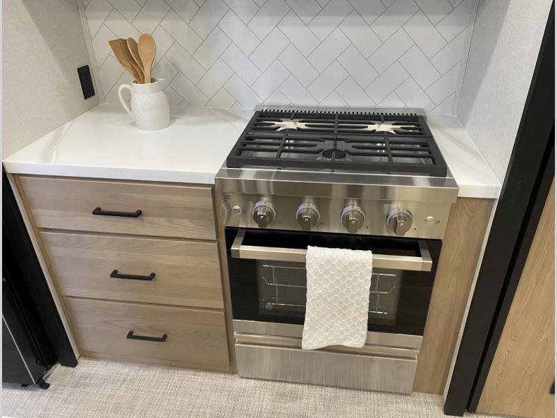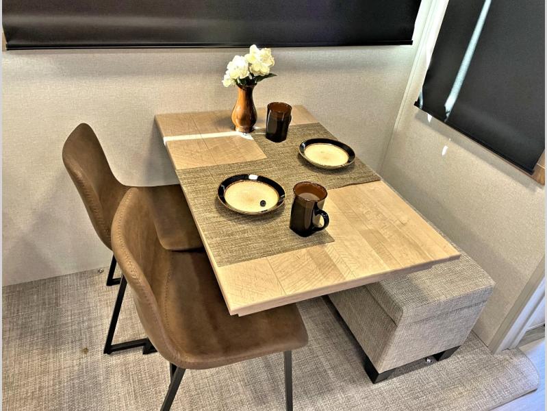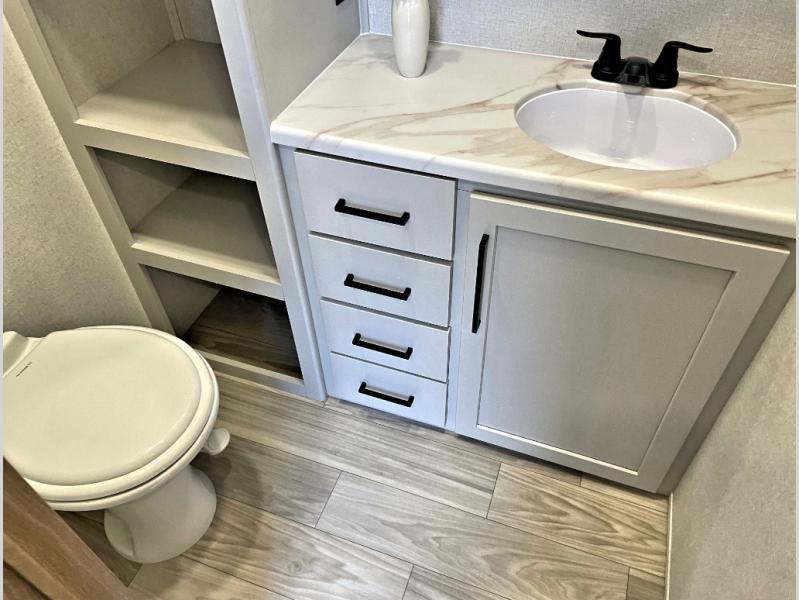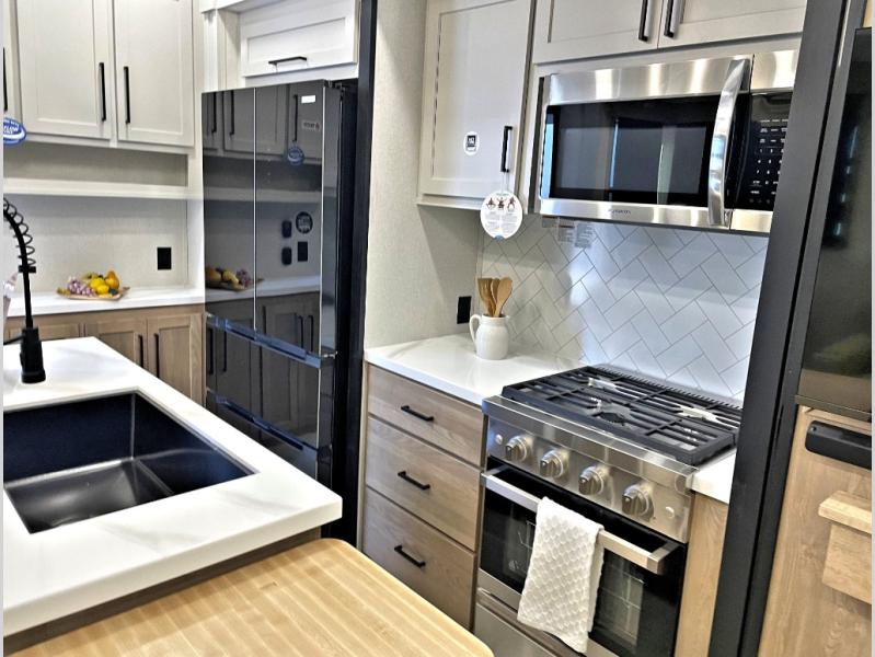 Enjoy extended stays in this triple slide out destination trailer! Once you unload your bags, you can put out the 19' awning with LED lights and relax in your camp chairs. The Chef Collection three burner range will let you make lunch for your crew when you head inside, and there is a free-standing dinette with a bench and two chairs to dine at. After your meal, you can relax on the theater seating across from the entertainment center with a hidden pantry behind it. There is also a front tri-fold hide-a-bed sofa to let guests sleep over. The mid-coach half bath will be easily accessible to use, and the full rear bath will create a master bedroom you are sure to love. There is a king bed slide out here, a dresser with TV prep, and two wardrobes to keep your things tidy!