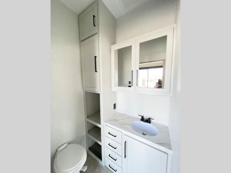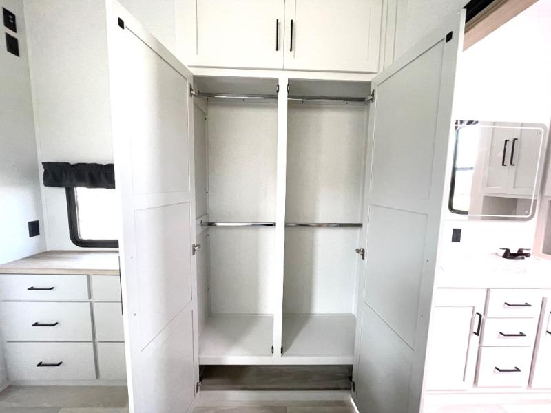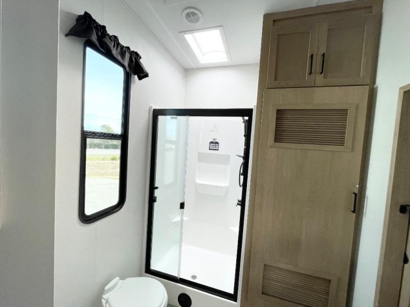 Enjoy extended stays in this triple slide out destination trailer! Once you unload your bags, you can put out the 19' awning with LED lights and relax in your camp chairs. The Chef Collection three burner range will let you make lunch for your crew when you head inside, and there is a free-standing dinette with a bench and two chairs to dine at. After your meal, you can relax on the theater seating across from the entertainment center with a hidden pantry behind it. There is also a front tri-fold hide-a-bed sofa to let guests sleep over. The mid-coach half bath will be easily accessible to use, and the full rear bath will create a master bedroom you are sure to love. There is a king bed slide out here, a dresser with TV prep, and two wardrobes to keep your things tidy!