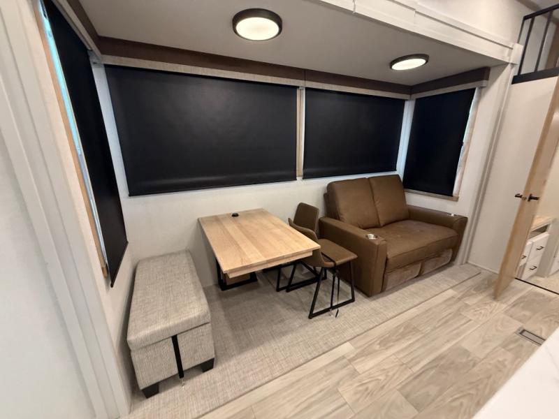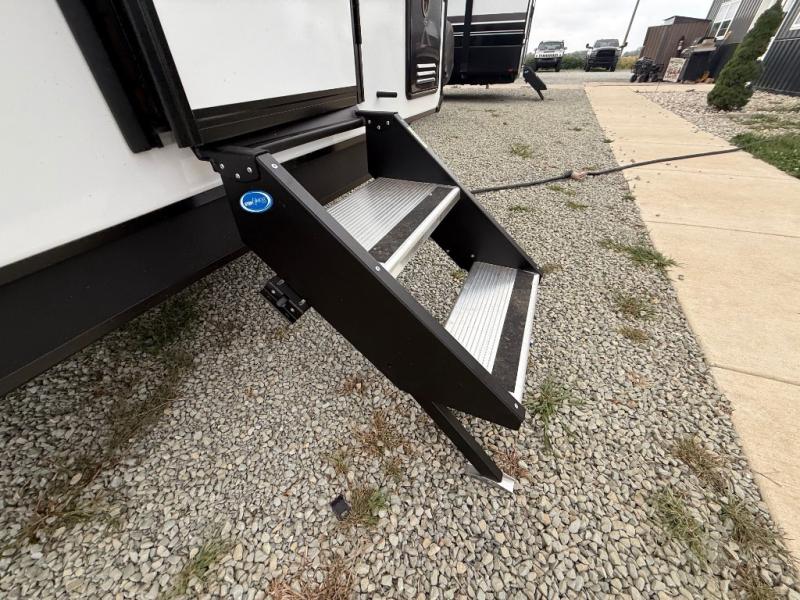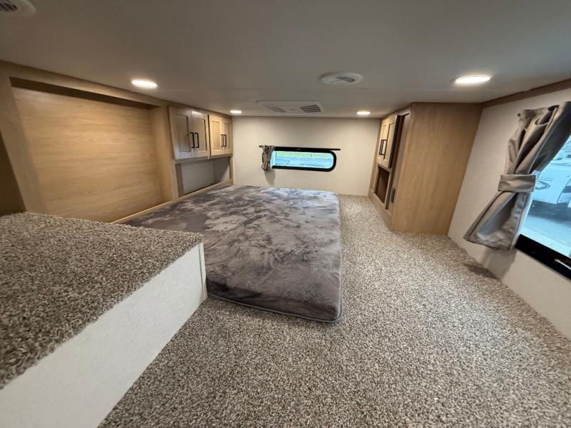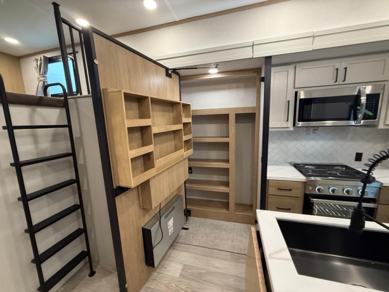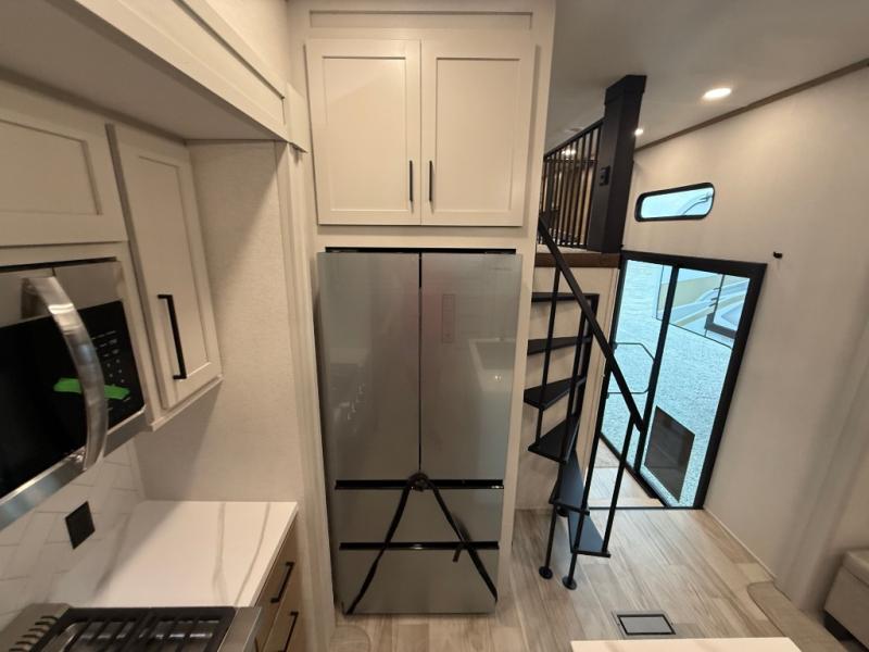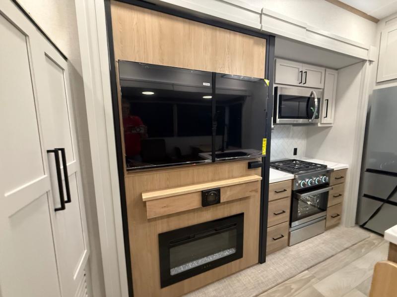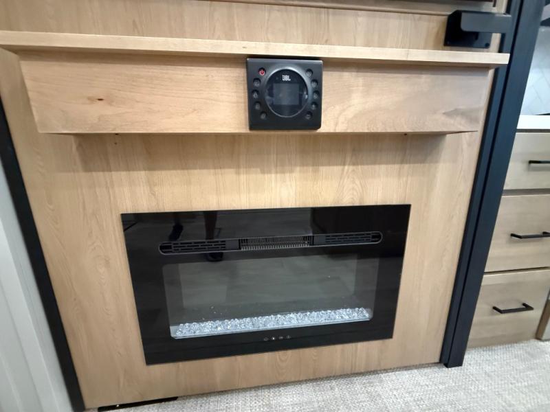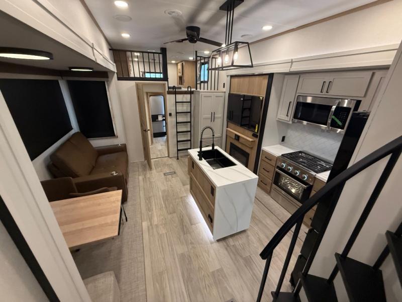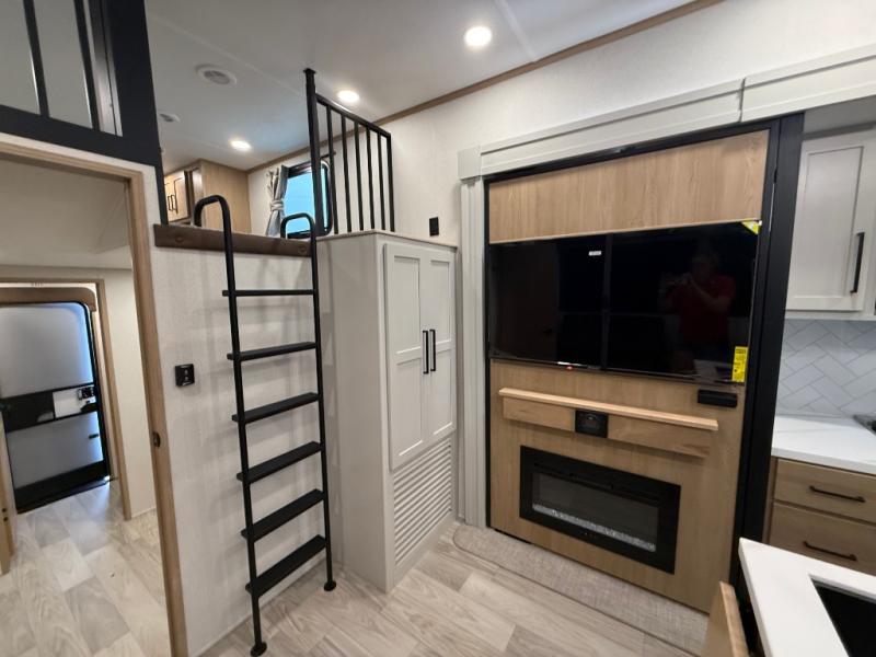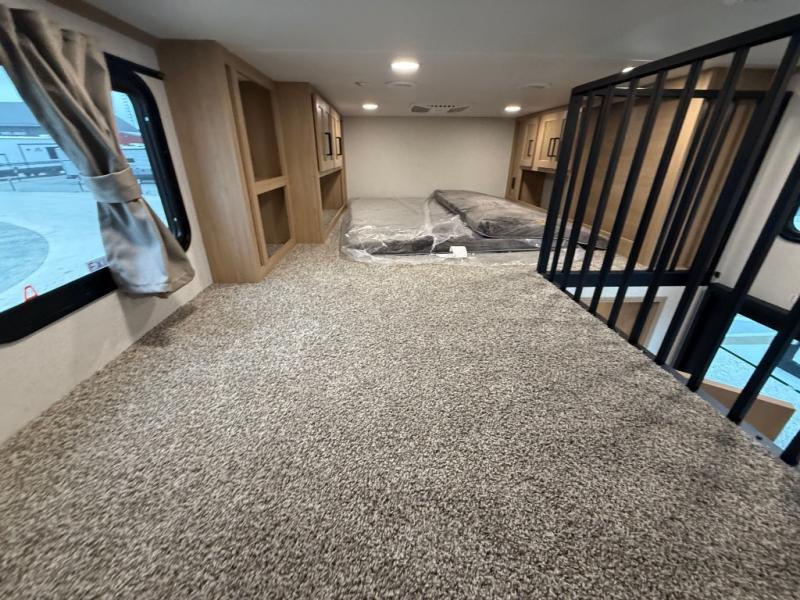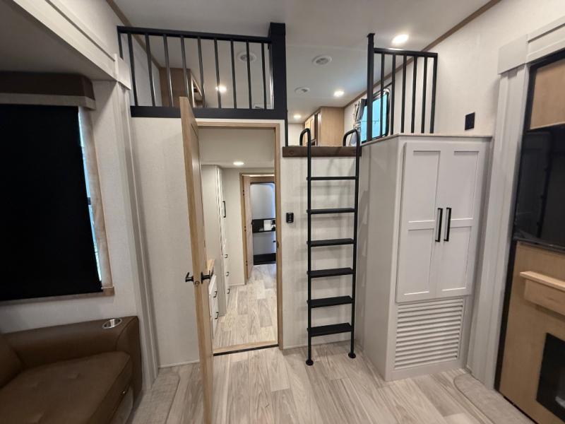 You won't believe the comfort and convenience found in this destination trailer. There are two private bedrooms; one up front with a queen bed slide out and storage space, and one in back with a queen bed slide out and a half bath! There is even washer and dryer prep here if you want to add those appliances and the second entry door is also found in this location so you can easily slip out in the morning. Above each of these rooms is a loft providing three total bunk mats for sleeping, storage cabinets, and TV prep if you want to add entertainment. Everyone can meet in the combined kitchen and living room that includes dual opposing slides, a 60" theater seating across from a 50" flat screen TV and fireplace, plus a free-standing table with chairs and a bench to dine at. The chef of your group will love the large kitchen island, Chef Collection three burner range, and a 16.2 cu. ft. refrigerator for food storage.