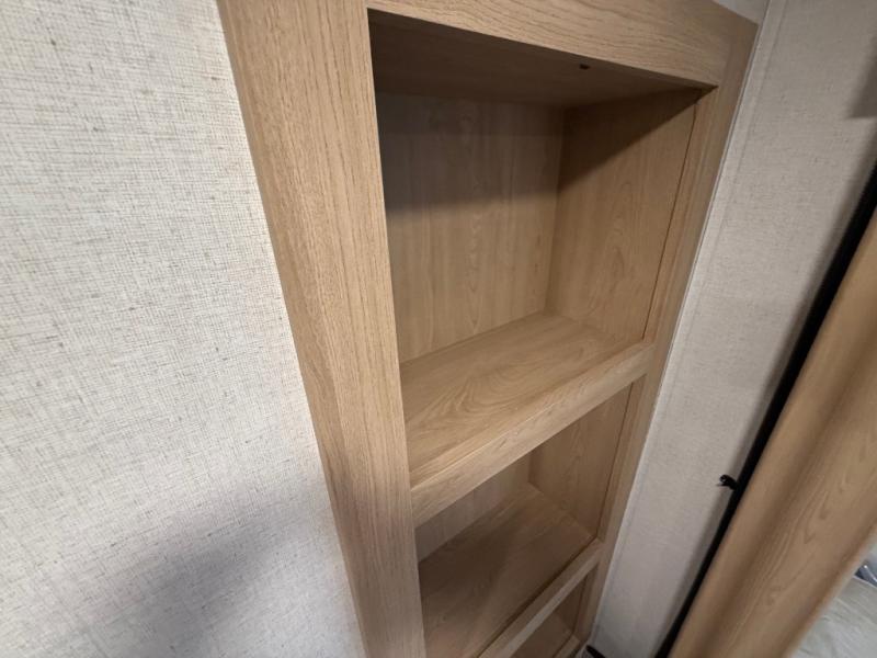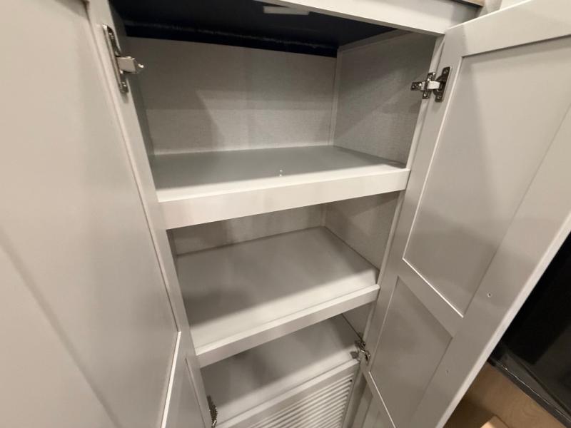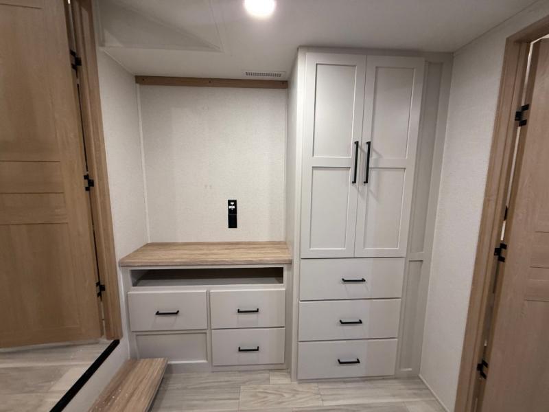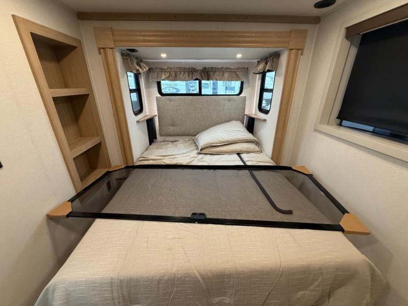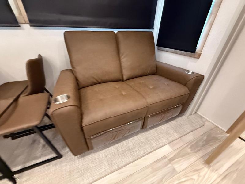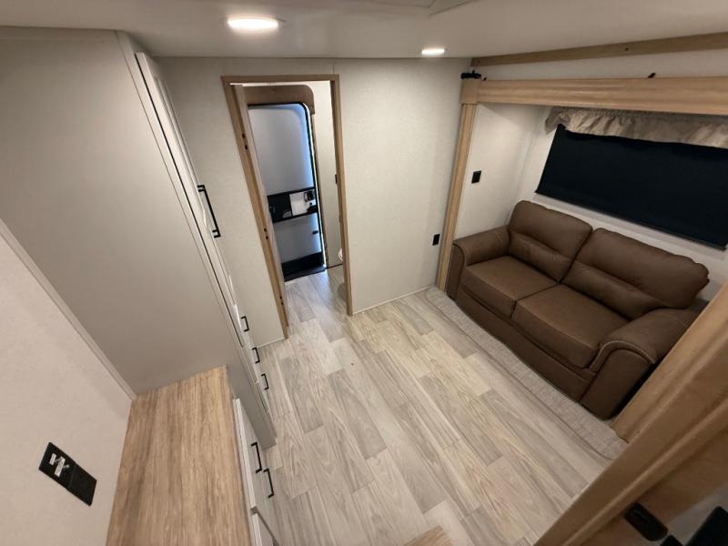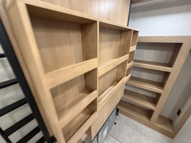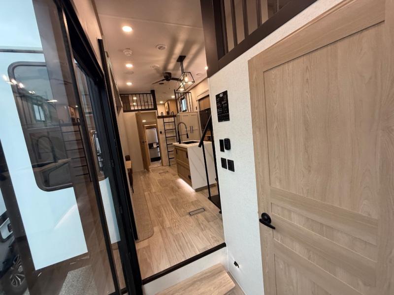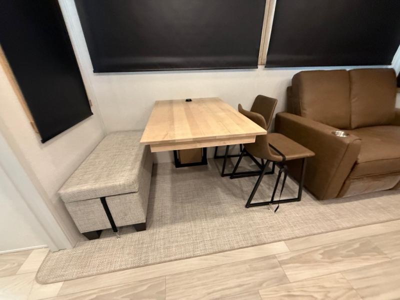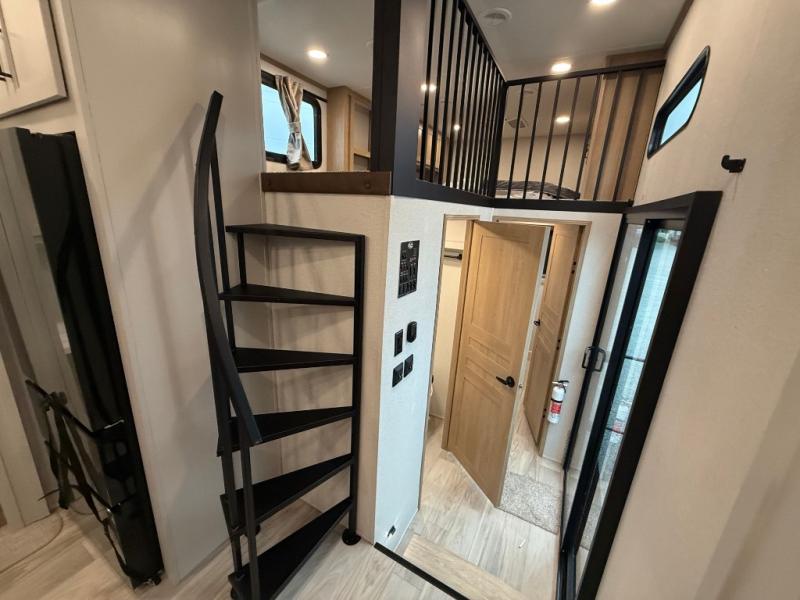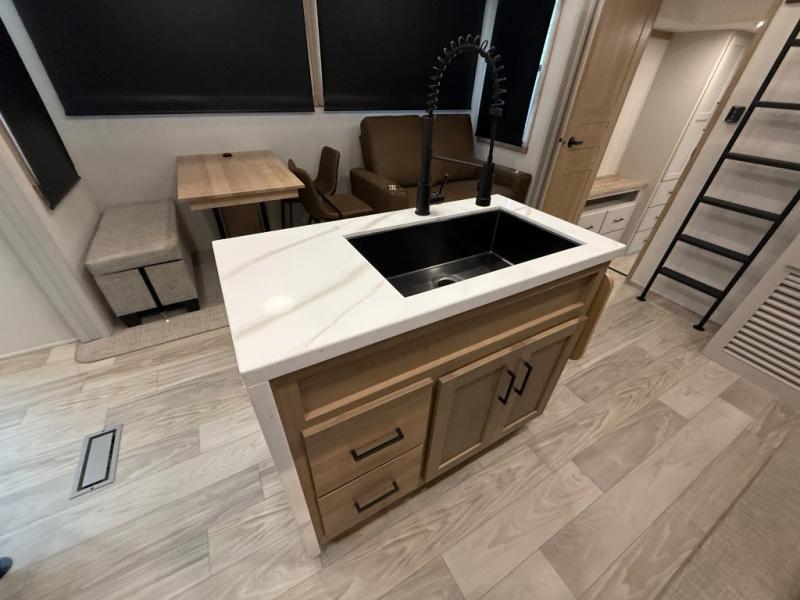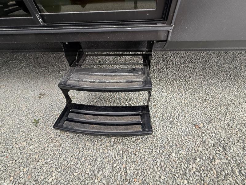 You won't believe the comfort and convenience found in this destination trailer. There are two private bedrooms; one up front with a queen bed slide out and storage space, and one in back with a queen bed slide out and a half bath! There is even washer and dryer prep here if you want to add those appliances and the second entry door is also found in this location so you can easily slip out in the morning. Above each of these rooms is a loft providing three total bunk mats for sleeping, storage cabinets, and TV prep if you want to add entertainment. Everyone can meet in the combined kitchen and living room that includes dual opposing slides, a 60" theater seating across from a 50" flat screen TV and fireplace, plus a free-standing table with chairs and a bench to dine at. The chef of your group will love the large kitchen island, Chef Collection three burner range, and a 16.2 cu. ft. refrigerator for food storage.