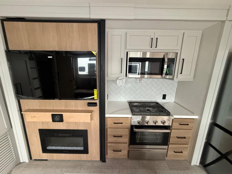 - Living area: The main cabin features opposing slide-outs, a 60-inch theater seating, a 50-inch TV, and a fireplace.