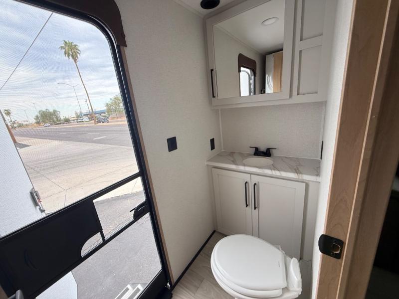 - Construction: Key structural elements include a high-gloss gel-coated fiberglass exterior, an electric awning with LED lights, and a residential-style patio door.