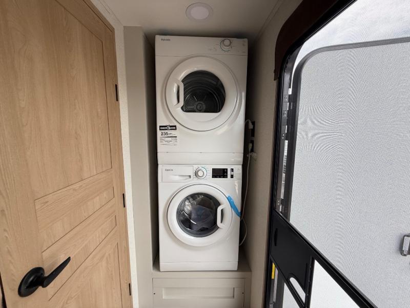 - Utilities: The trailer comes with washer and dryer prep, a tankless water heater, and two 15k BTU air conditioning units.