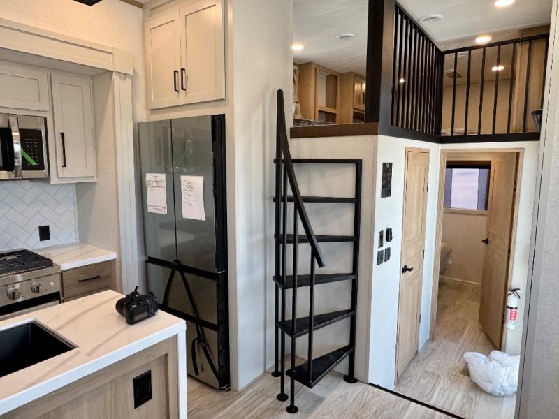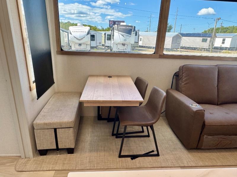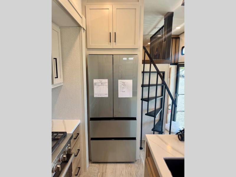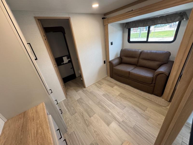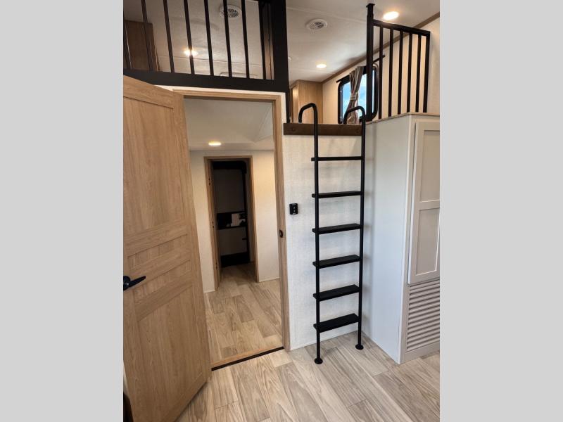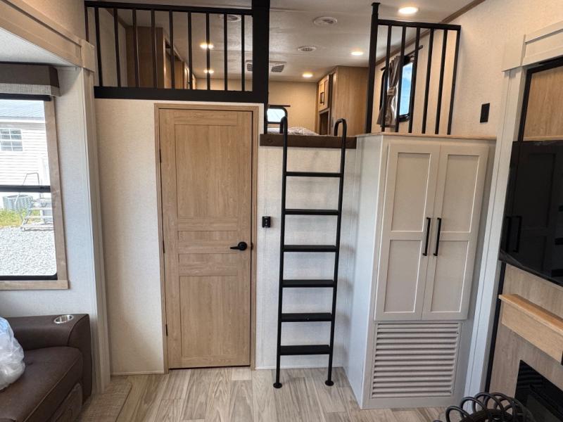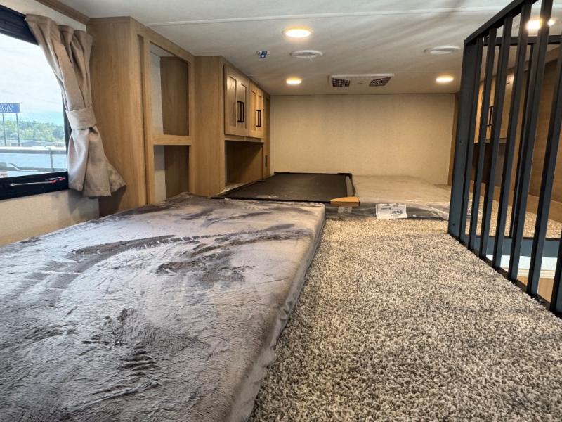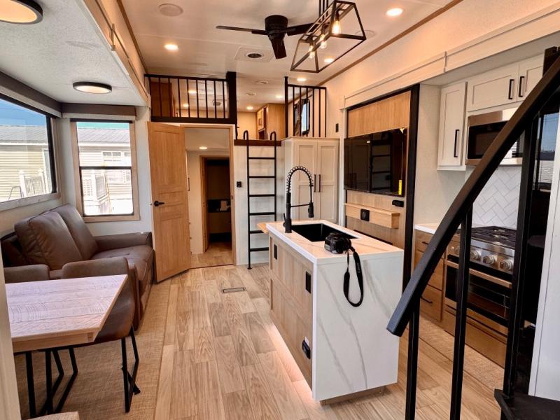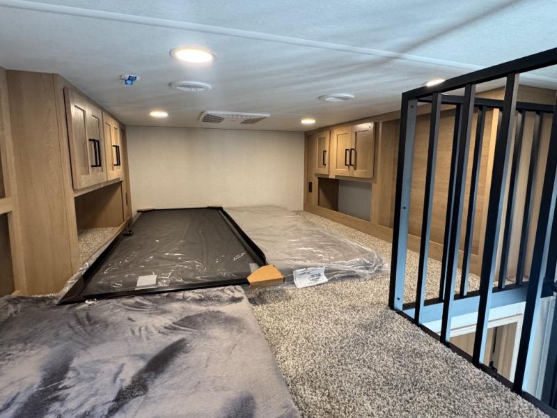 2-bed, 1.5-bath destination trailer featuring two lofts, residential kitchen appliances, a 19 cu. ft. refrigerator, and 2 air conditioners for comfort. Key features include an underbelly armor for insulation and protection, dual awnings, solid steps, and a detached hitch as part of a destination package. It's designed with features like dual entry/exit doors and ample storage for extended stays. Call for more details! 601-207-5300