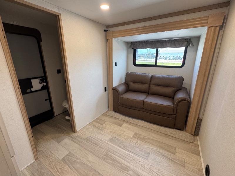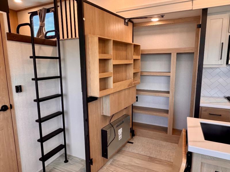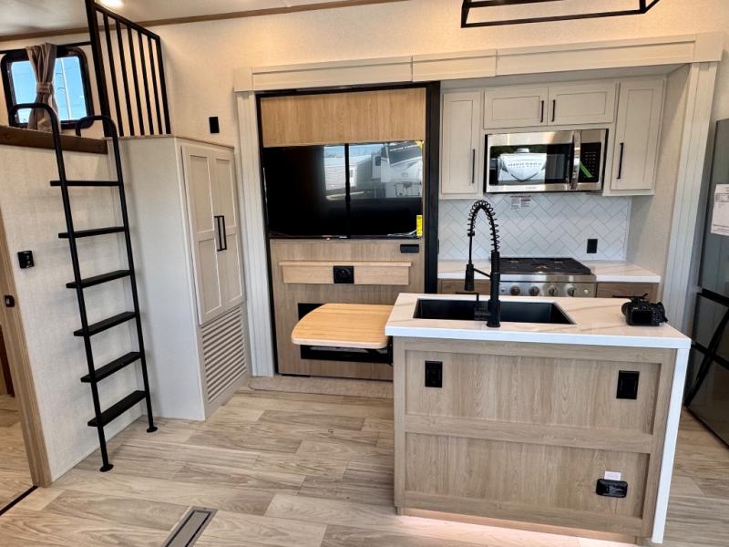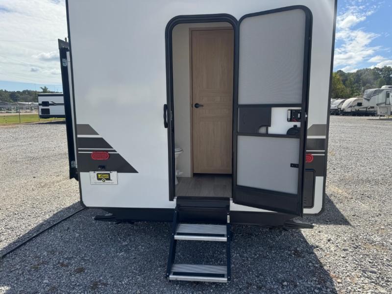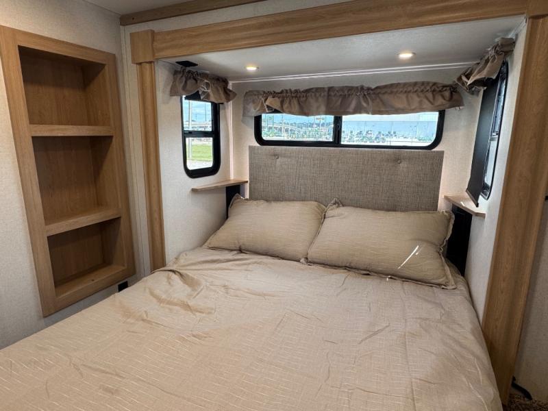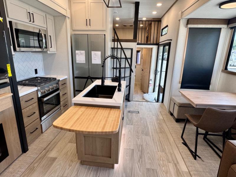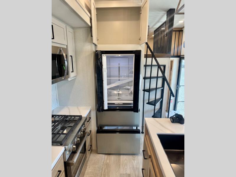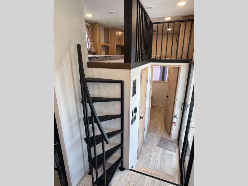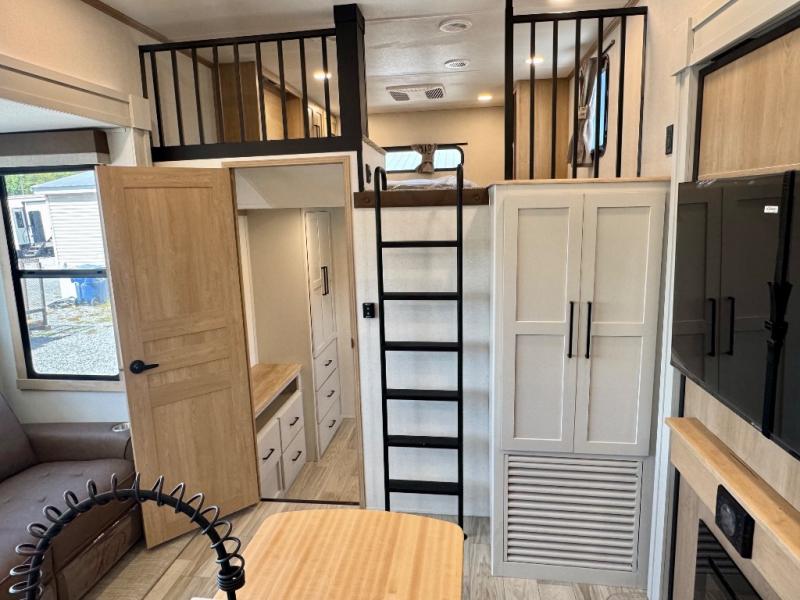2-bed, 1.5-bath destination trailer featuring two lofts, residential kitchen appliances, a 19 cu. ft. refrigerator, and 2 air conditioners for comfort. Key features include an underbelly armor for insulation and protection, dual awnings, solid steps, and a detached hitch as part of a destination package. It's designed with features like dual entry/exit doors and ample storage for extended stays. Call for more details! 601-207-5300