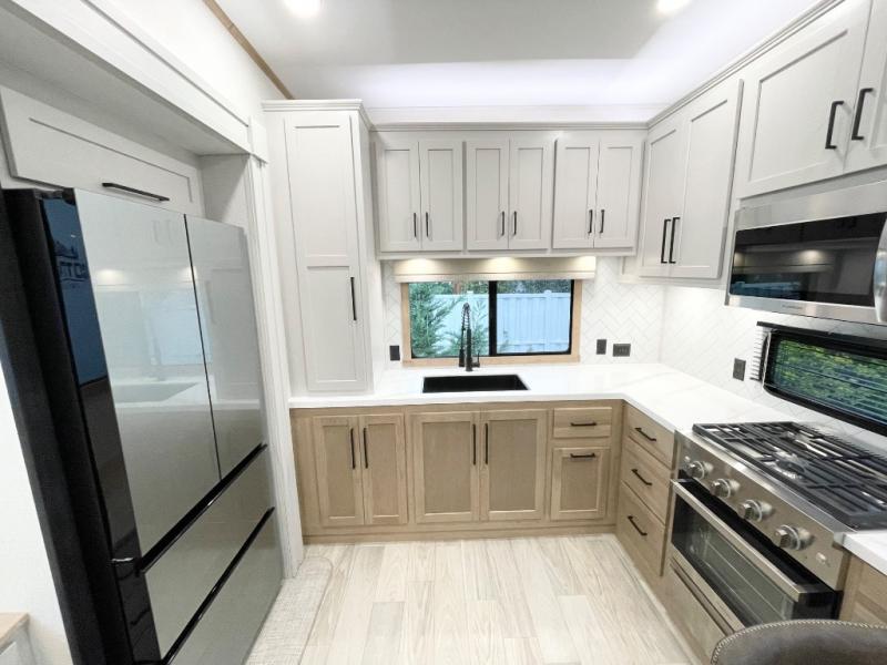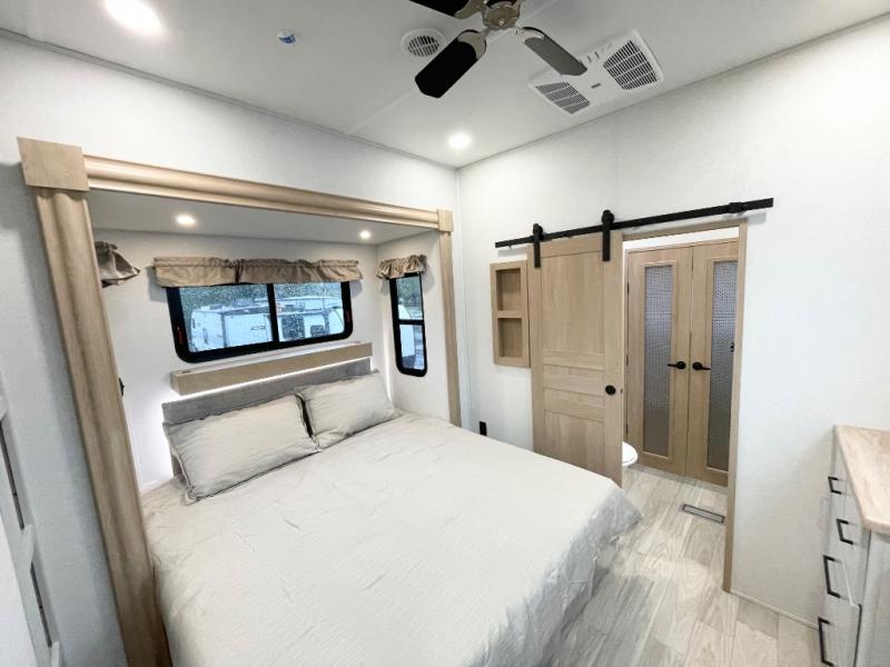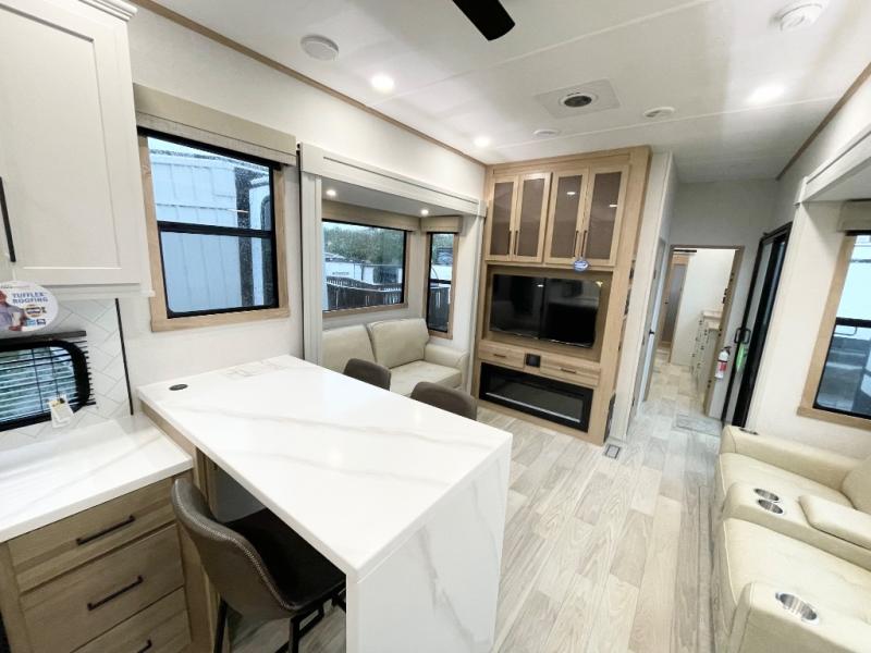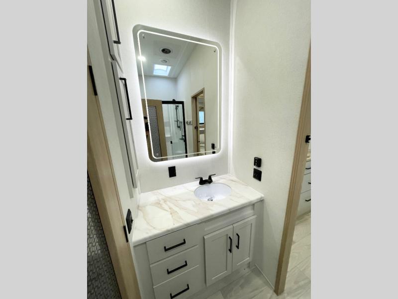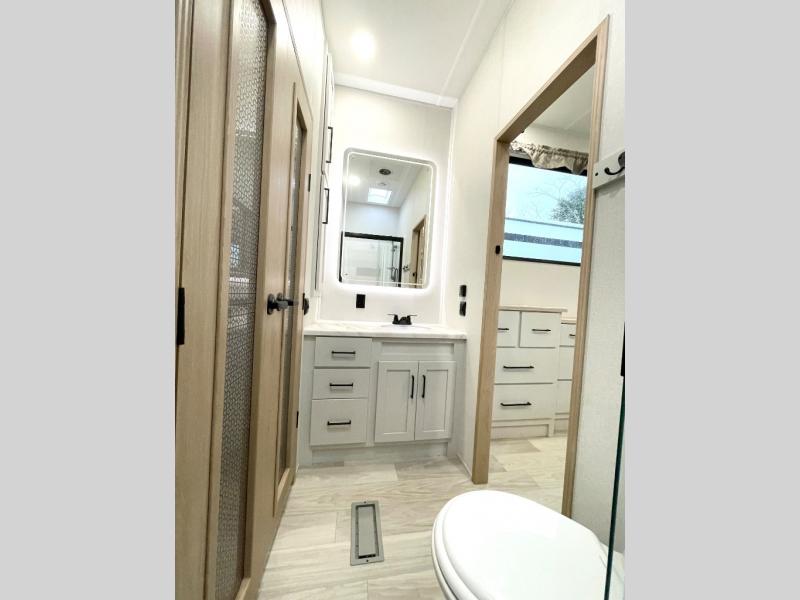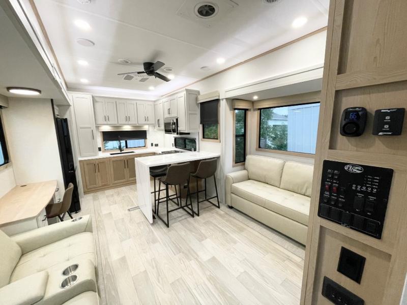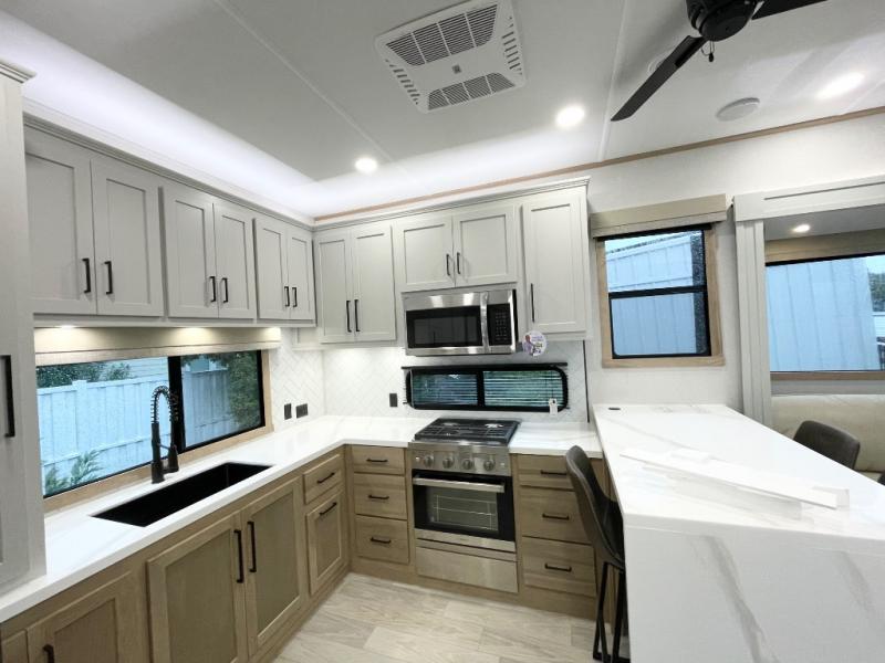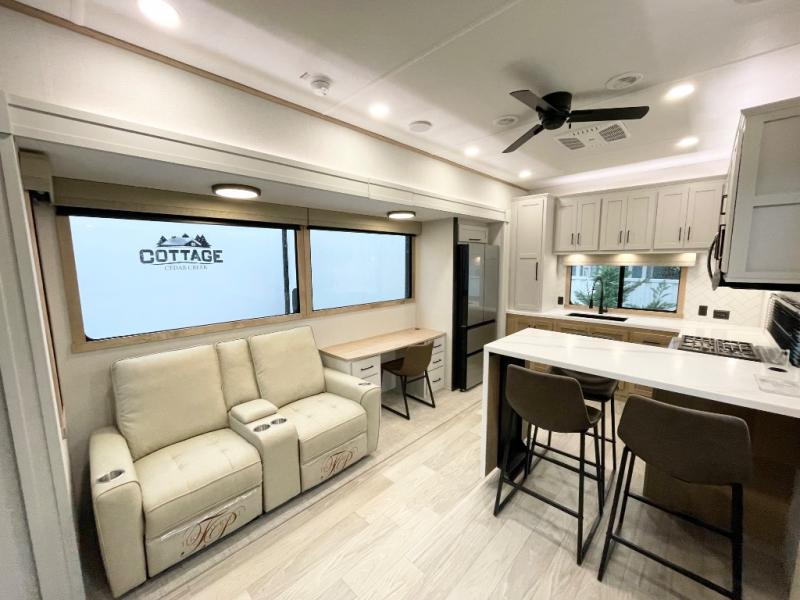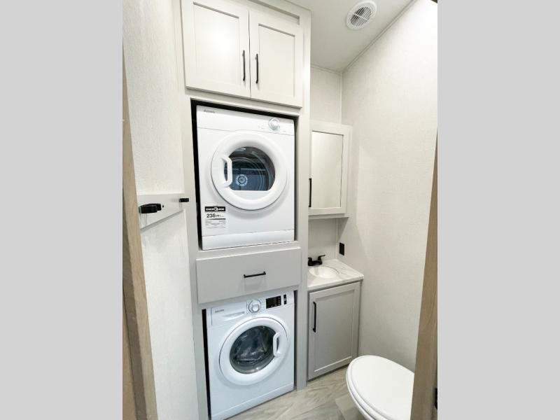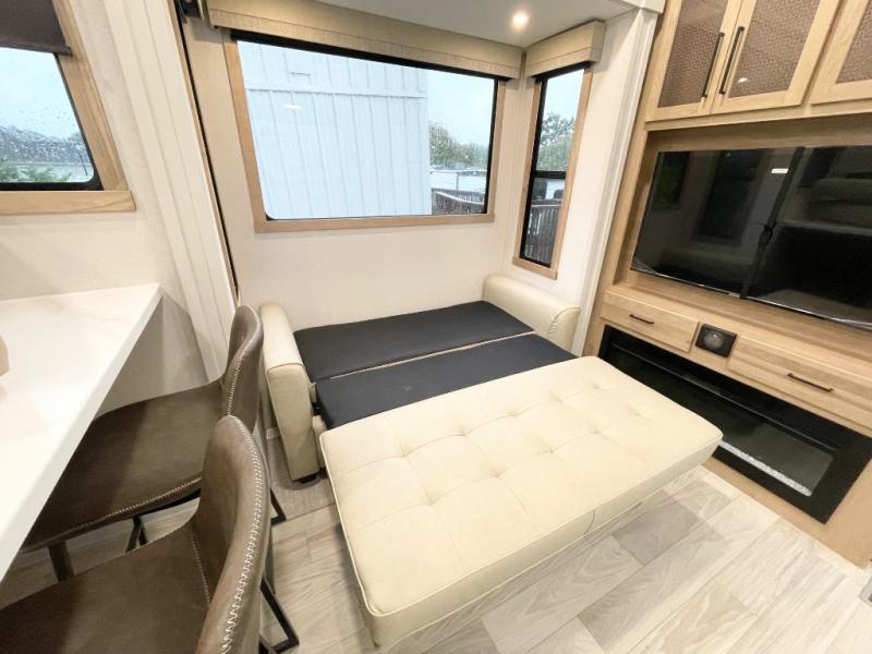 One look at this destination trailer and you'll be sold! You'll love waking up each morning in the master bedroom with a king bed slide out, dual nightstands, and a dresser to keep clothes organized. There is also a spacious front bathroom with a walk-in closet! As you walk to the main living area, you'll find the half bath with washer and dryer prep if you plan to add these appliances. A tri-fold hide-a-bed sofa and theater seating in the living area will let you relax each day, and the bar with stools overlooks the kitchen so you can visit with the chef while dinner is being made.