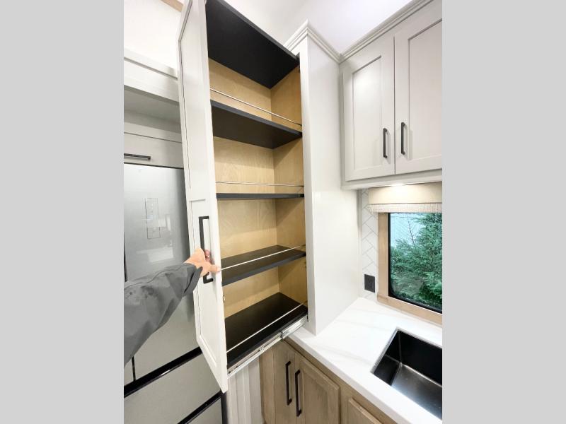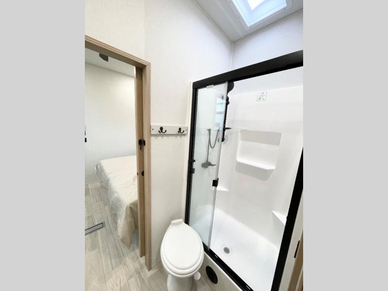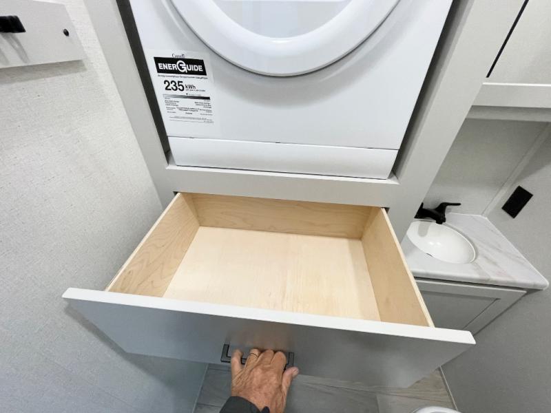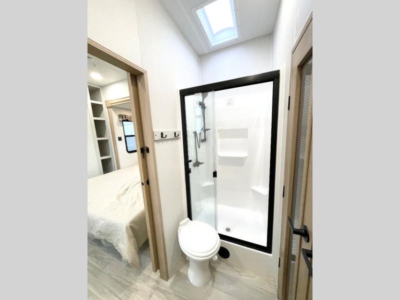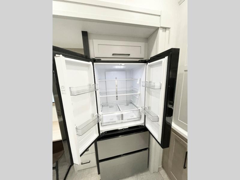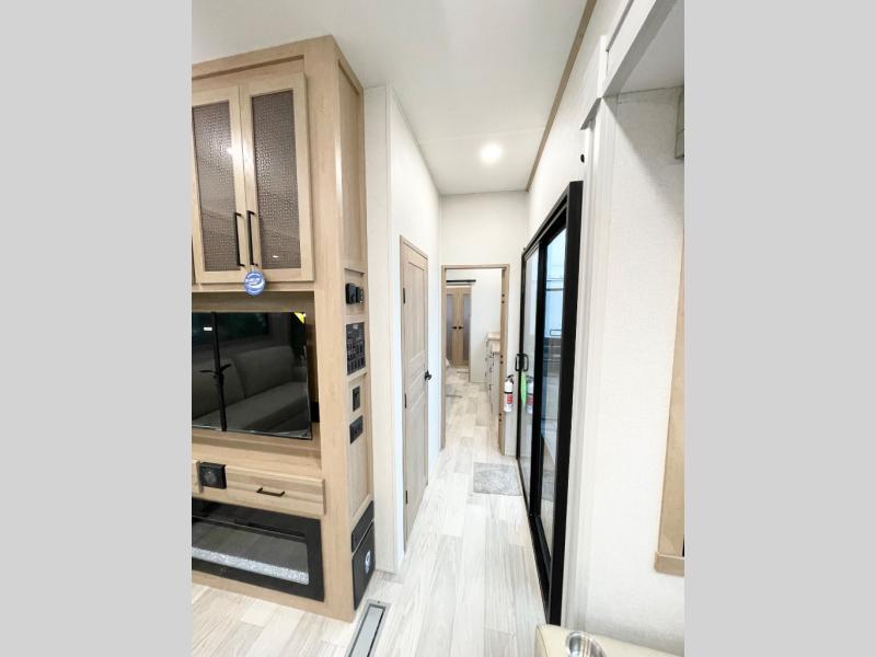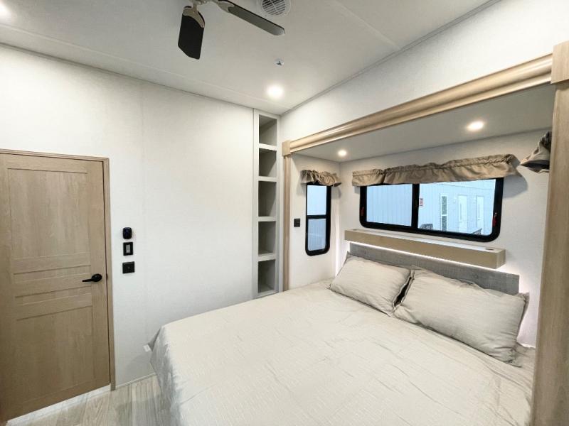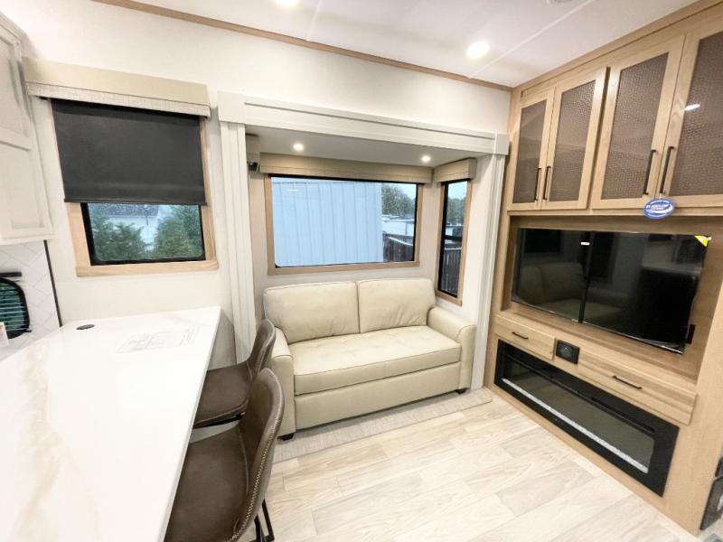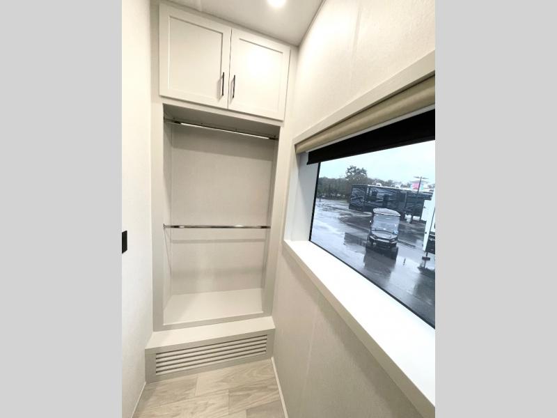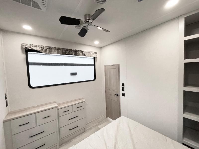 One look at this destination trailer and you'll be sold! You'll love waking up each morning in the master bedroom with a king bed slide out, dual nightstands, and a dresser to keep clothes organized. There is also a spacious front bathroom with a walk-in closet! As you walk to the main living area, you'll find the half bath with washer and dryer prep if you plan to add these appliances. A tri-fold hide-a-bed sofa and theater seating in the living area will let you relax each day, and the bar with stools overlooks the kitchen so you can visit with the chef while dinner is being made.