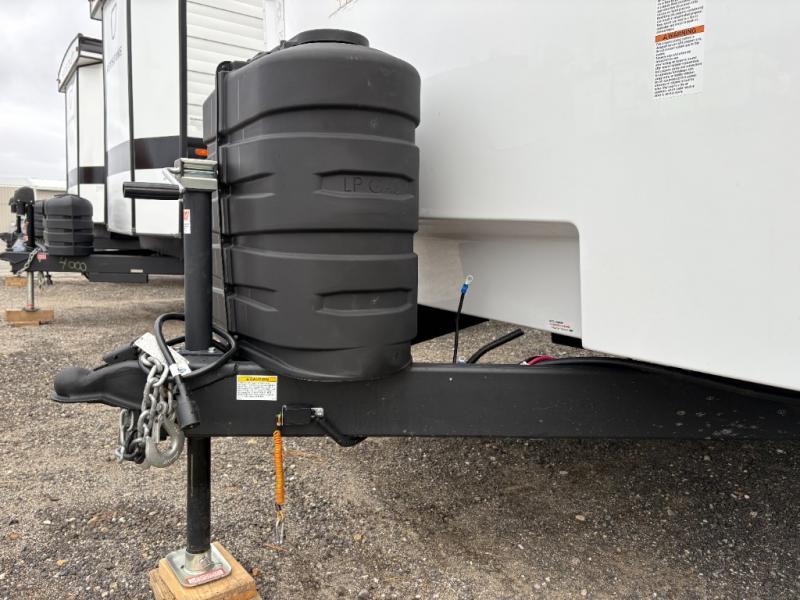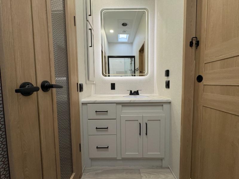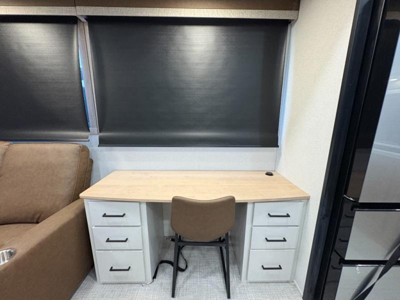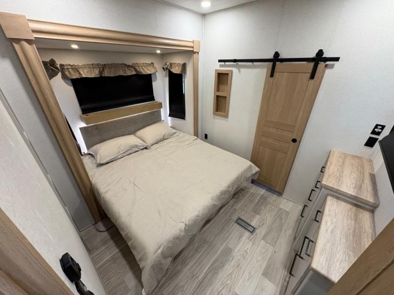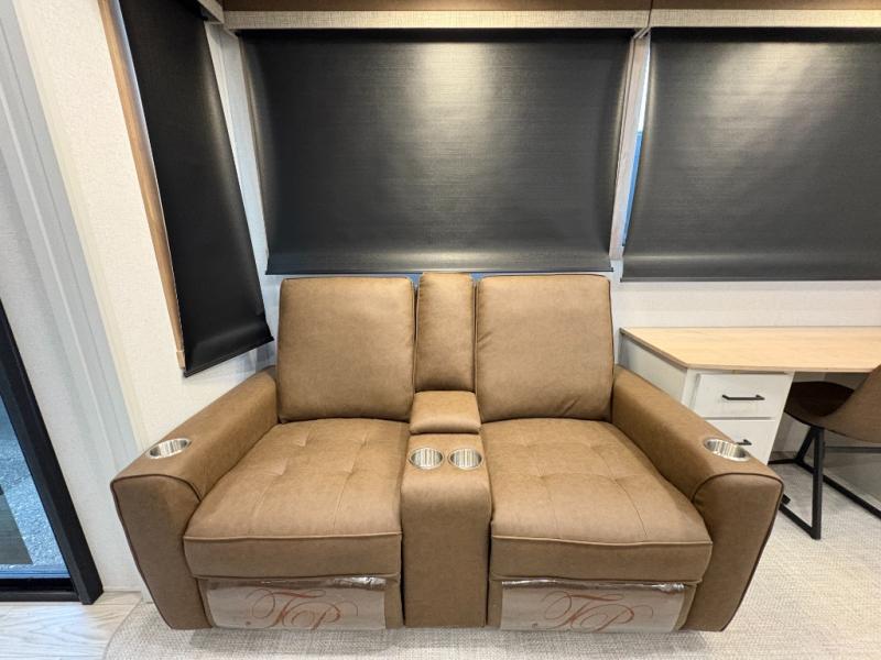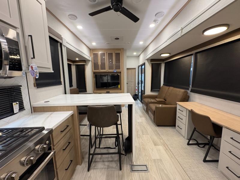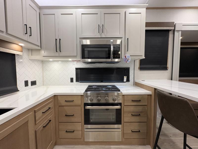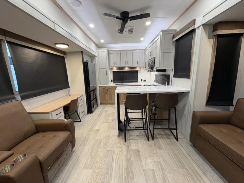 One look at this destination trailer and you'll be sold! You'll love waking up each morning in the master bedroom with a king bed slide out, dual nightstands, and a dresser to keep clothes organized. There is also a spacious front bathroom with a walk-in closet! As you walk to the main living area, you'll find the half bath with washer and dryer prep if you plan to add these appliances. A tri-fold hide-a-bed sofa and theater seating in the living area will let you relax each day, and the bar with stools overlooks the kitchen so you can visit with the chef while dinner is being made.
